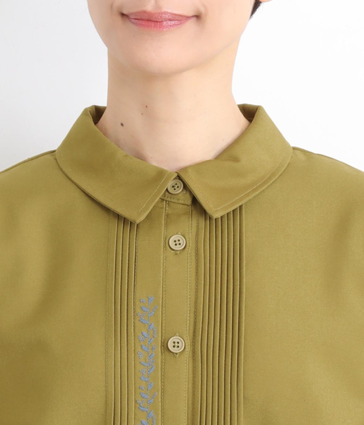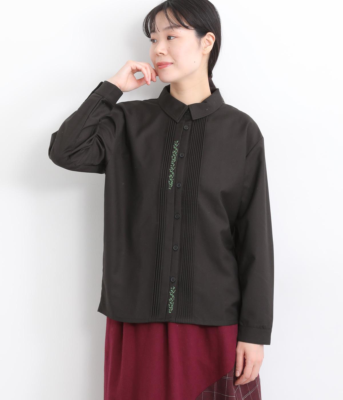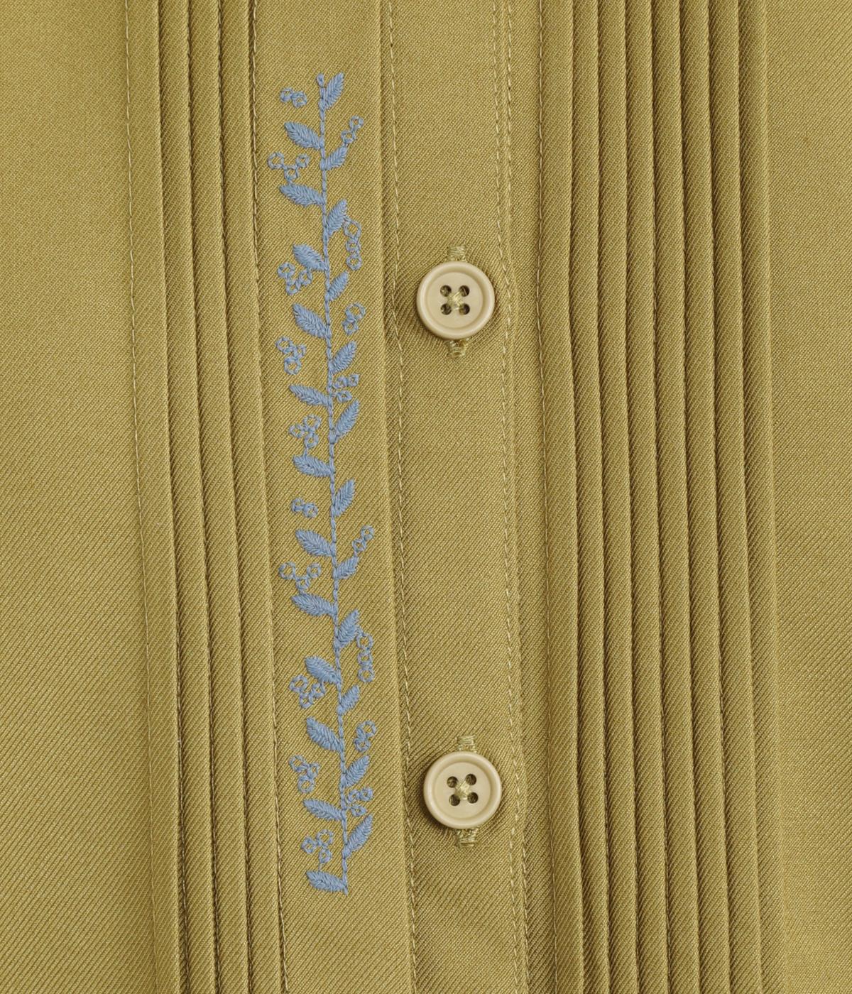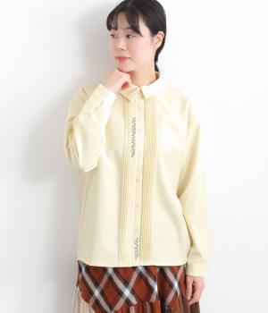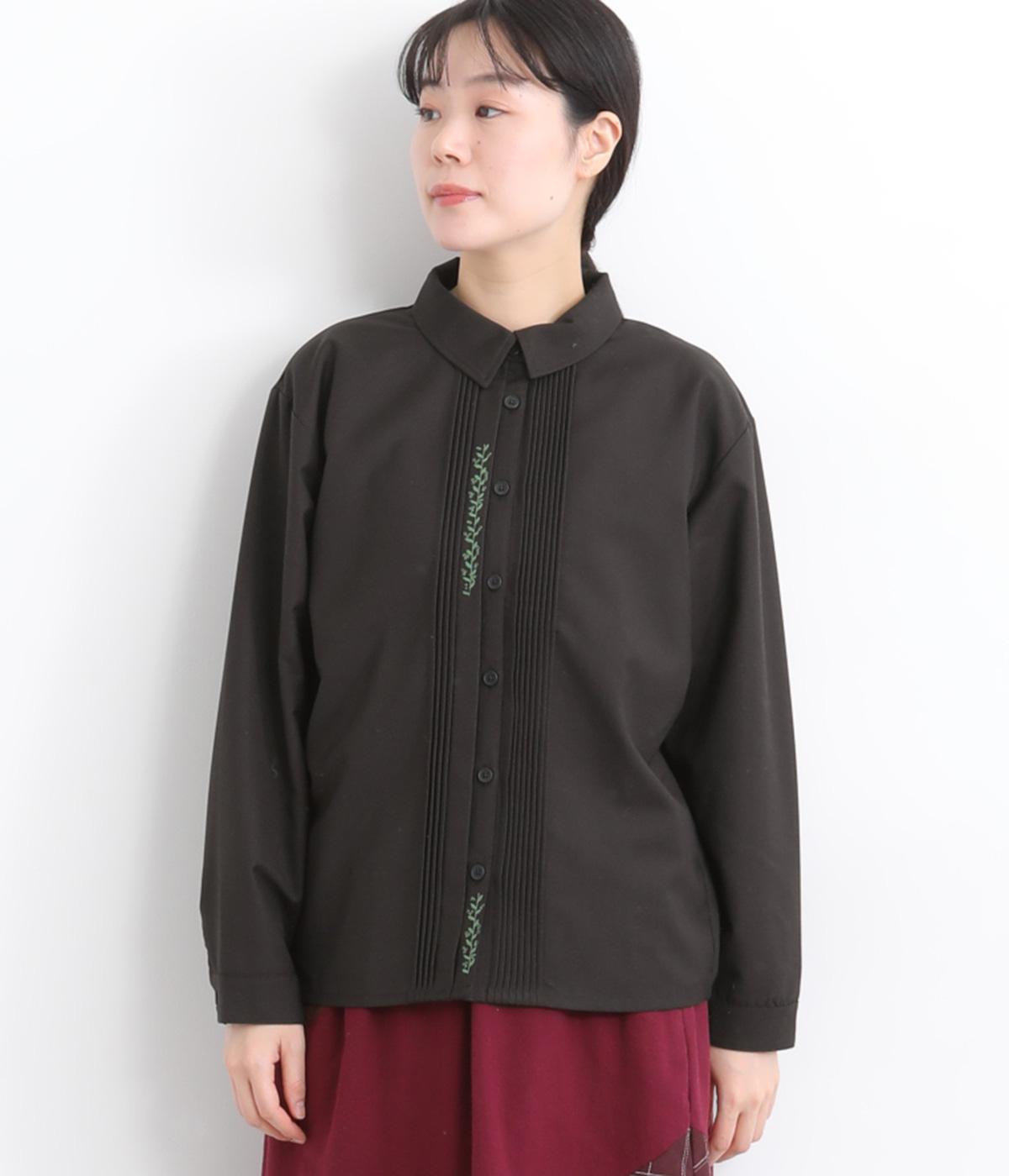 前中心や後ろ身頃に入れたピンタックがきれいめな印象を与える襟つきシャツ。葉っぱの刺しゅうラインが他にはない特別感をプラス。きちんと感もあるのでデイリーにもよそいきスタイルにも活躍し、羽織り使いもたのしめます。