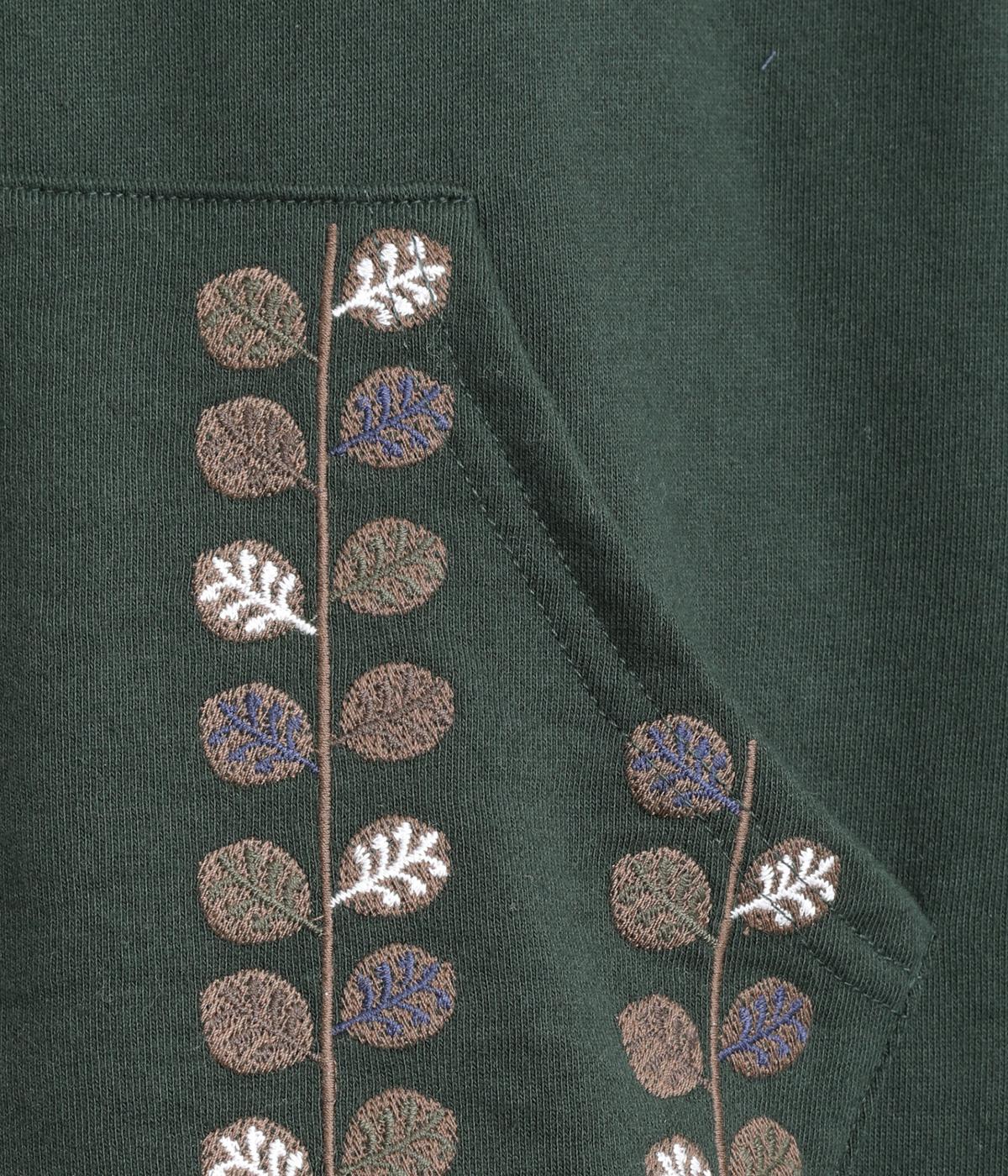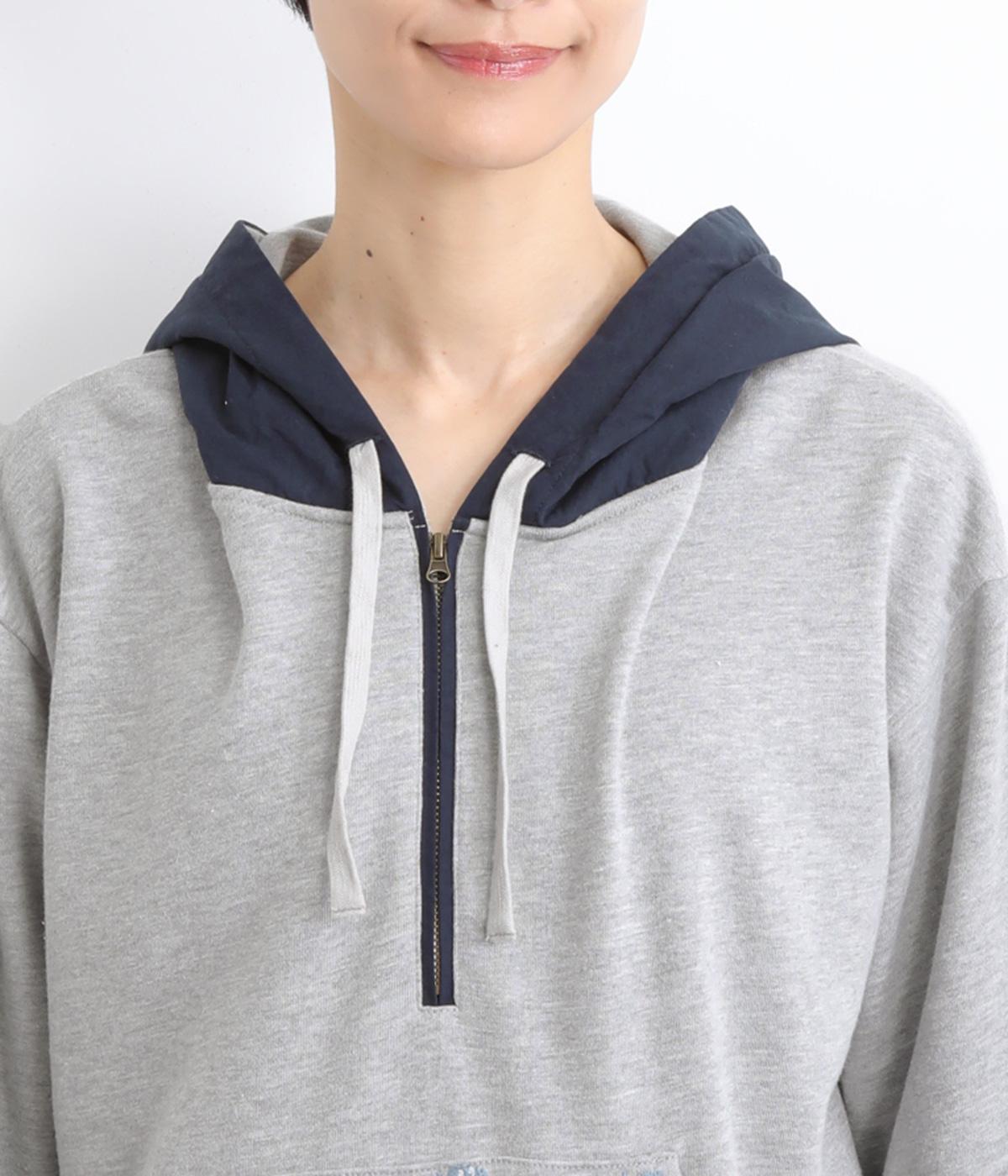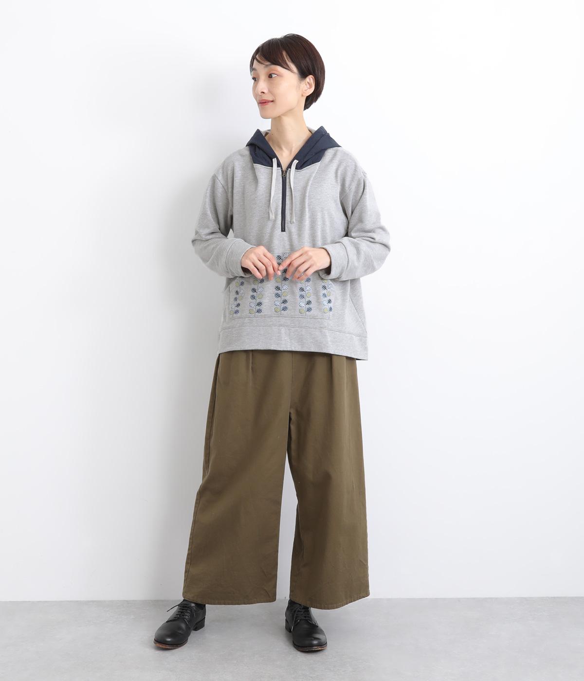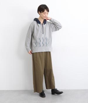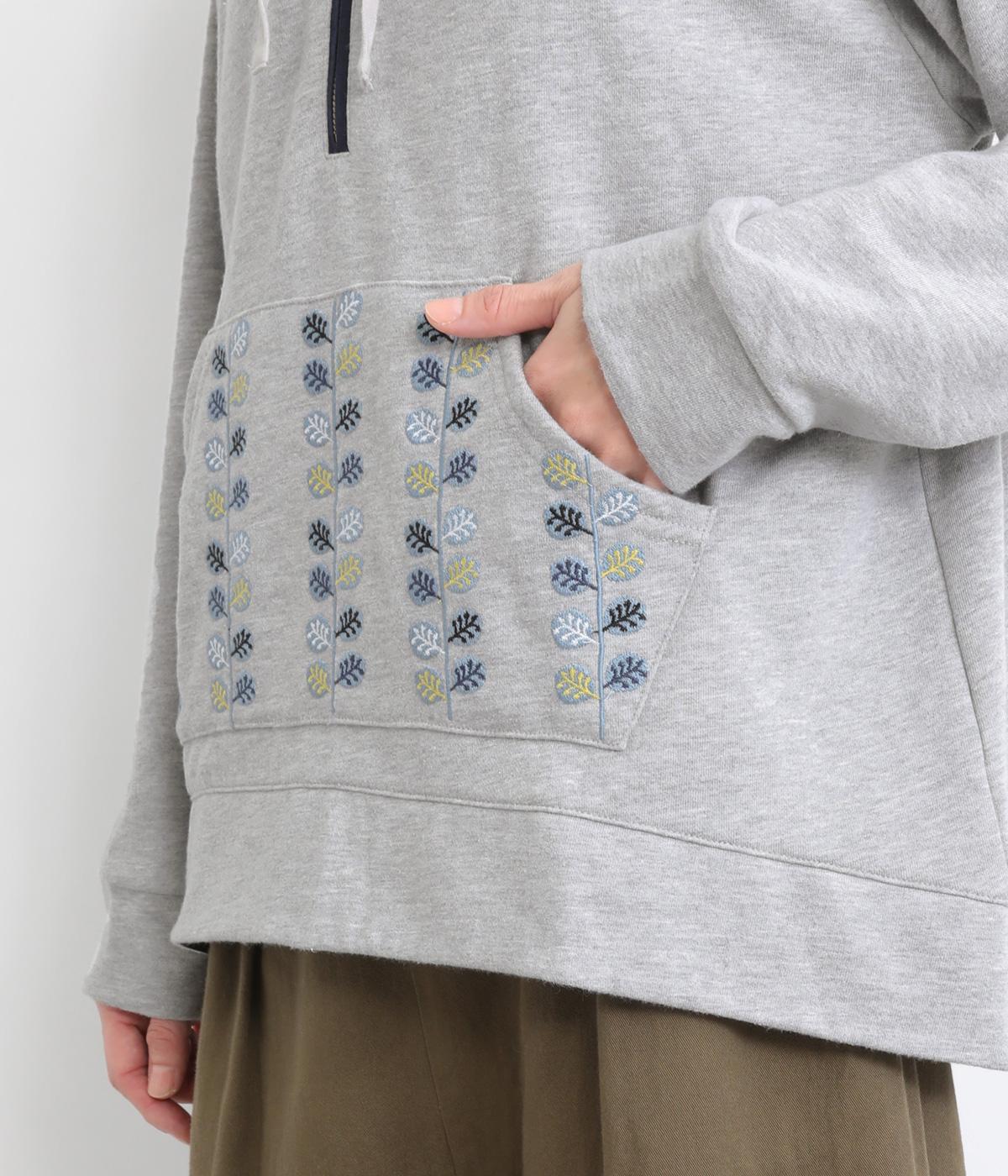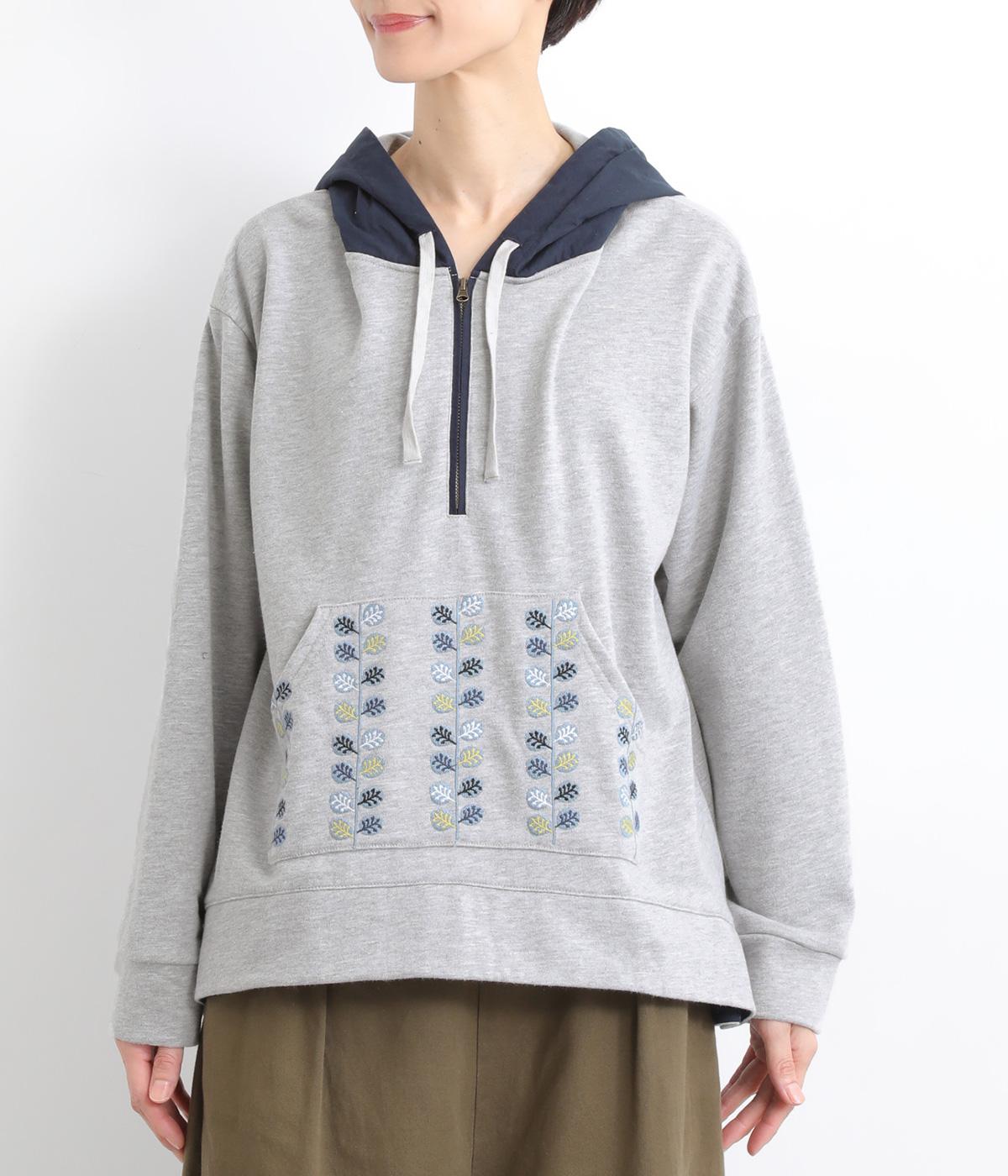 デイリー使いに最適な裏毛のフードパーカーに刺しゅうを添えてデザイン性をプラスしました。パーカーや裾の裏には配色の綿生地をあててさり気なくメリハリを。ハーフジップ式で被りやすい仕立てになっています。