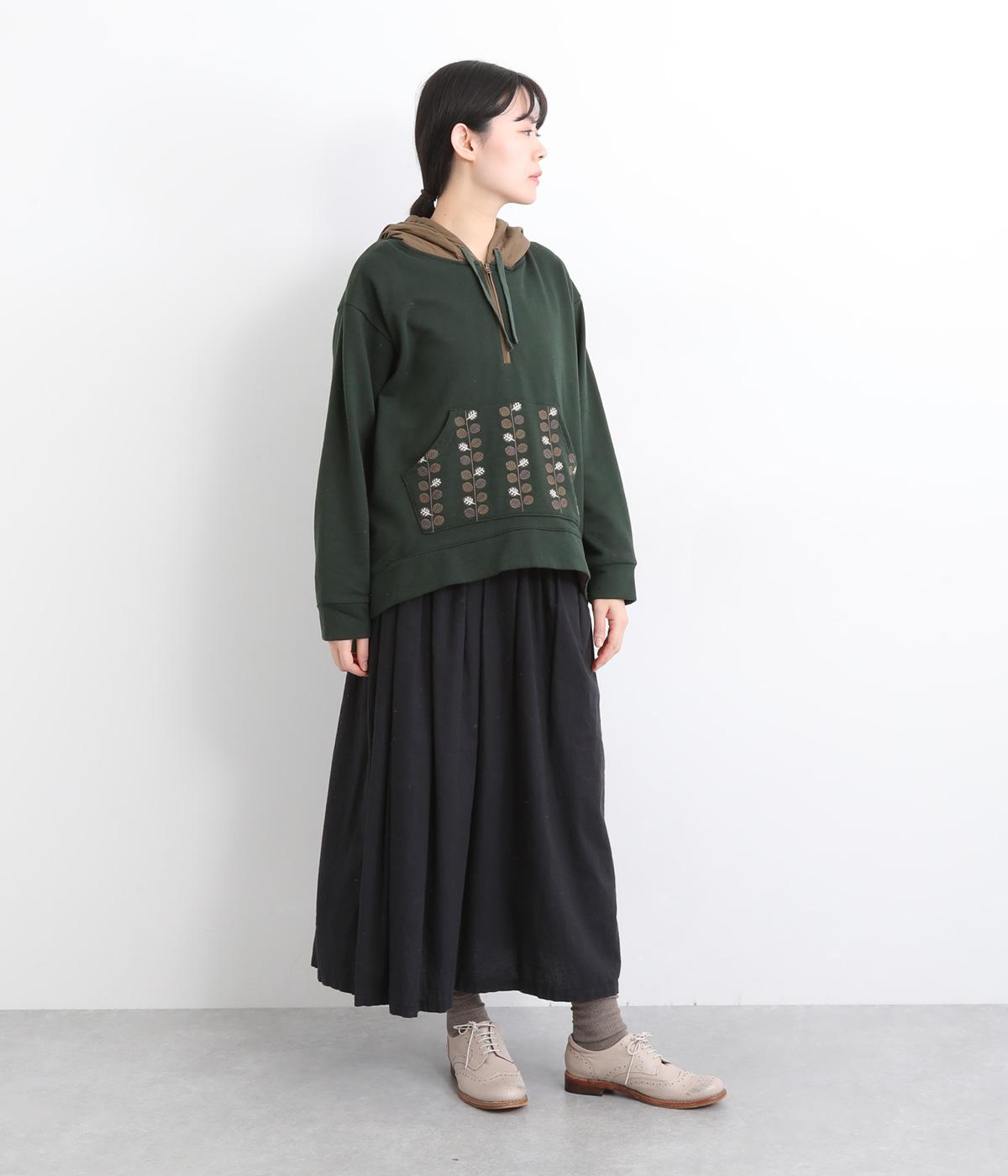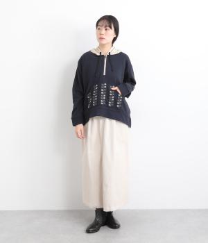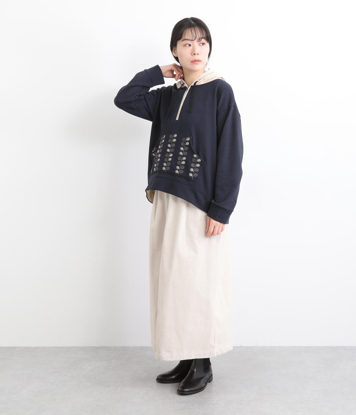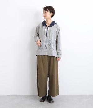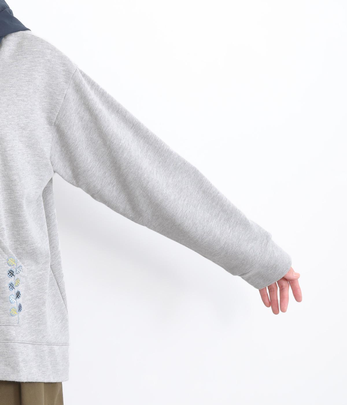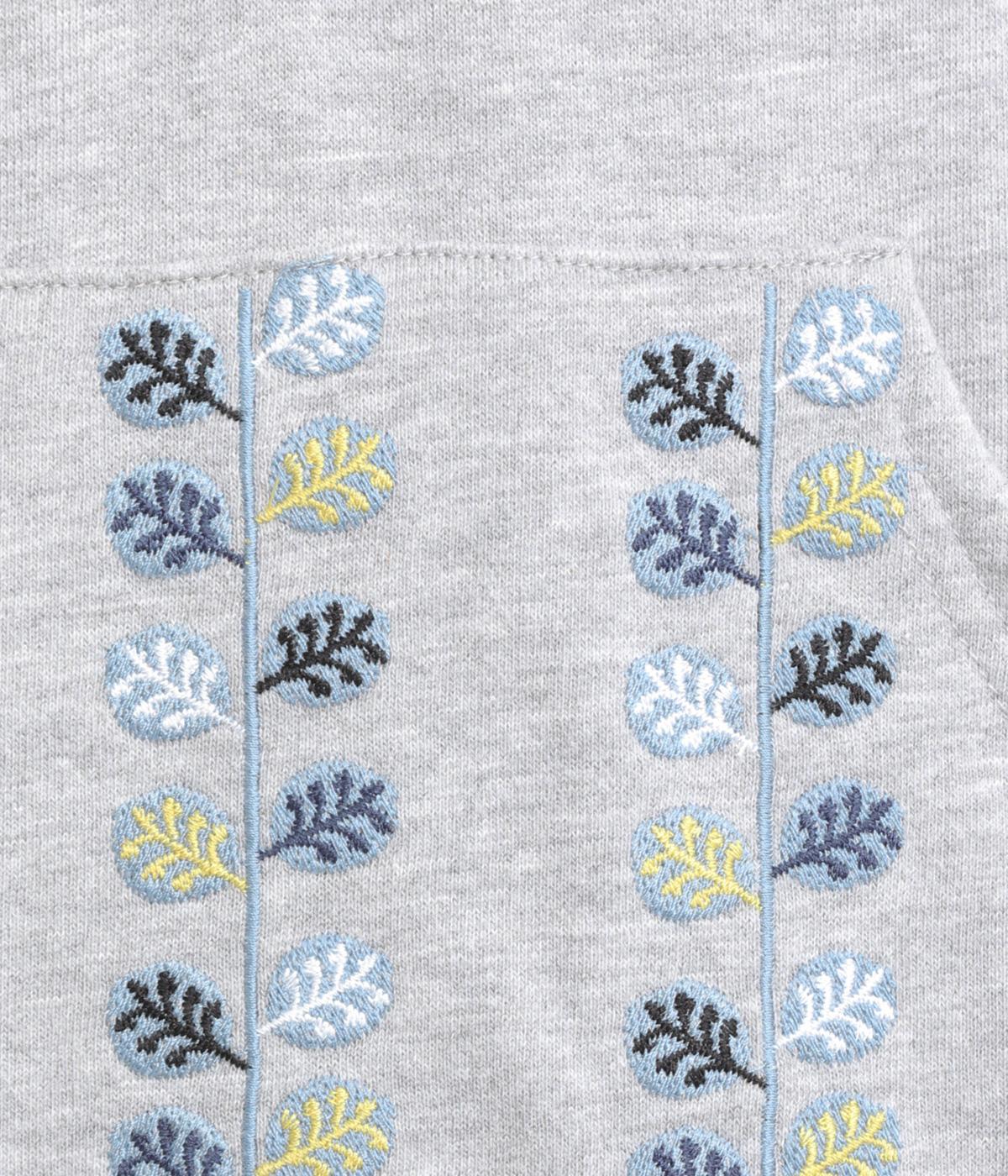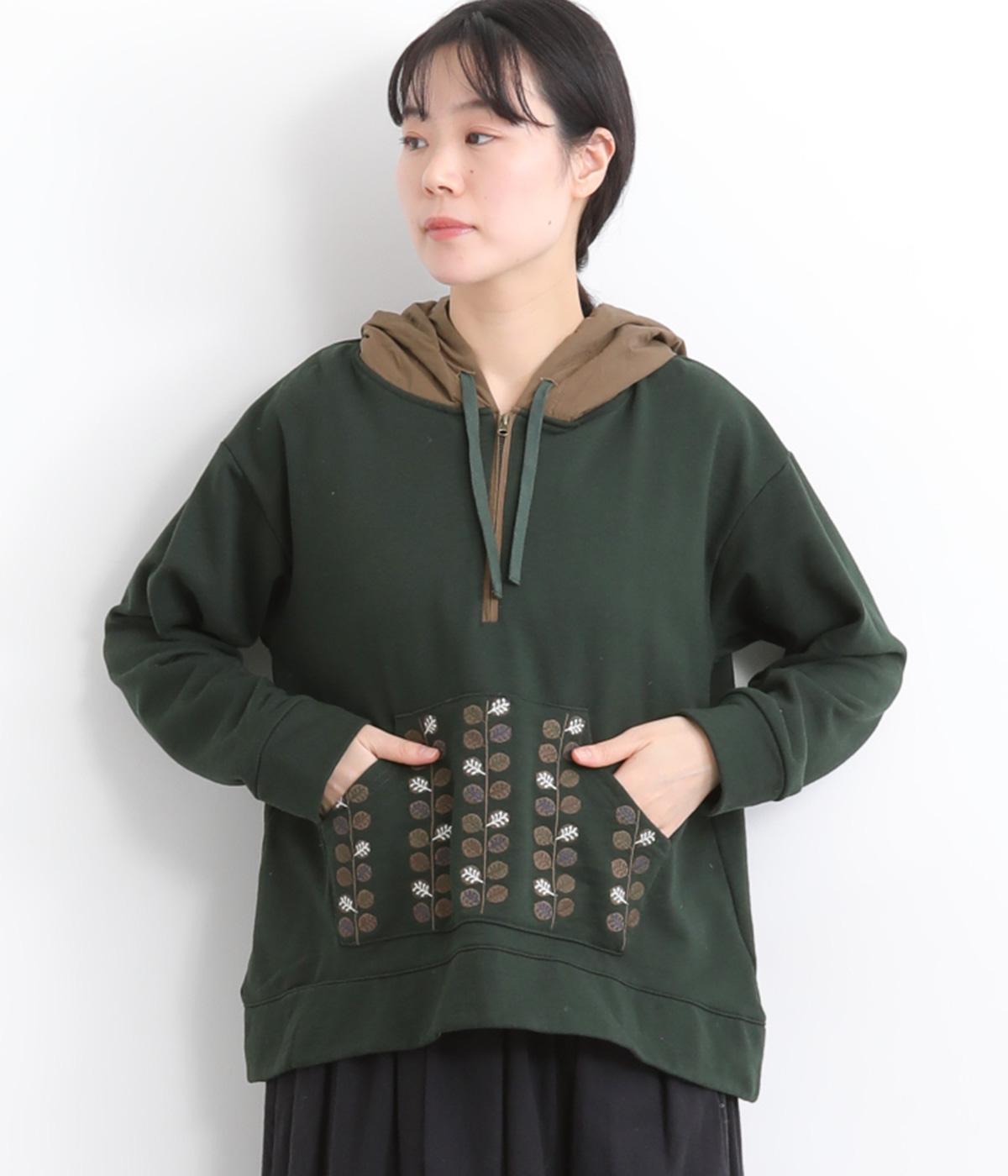 デイリー使いに最適な裏毛のフードパーカーに刺しゅうを添えてデザイン性をプラスしました。パーカーや裾の裏には配色の綿生地をあててさり気なくメリハリを。ハーフジップ式で被りやすい仕立てになっています。