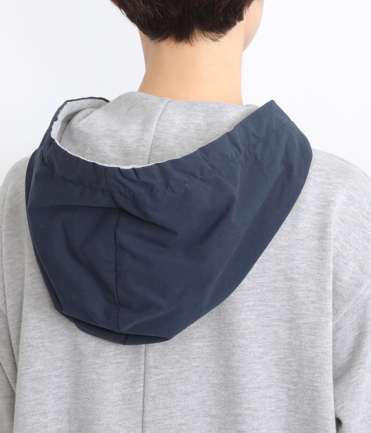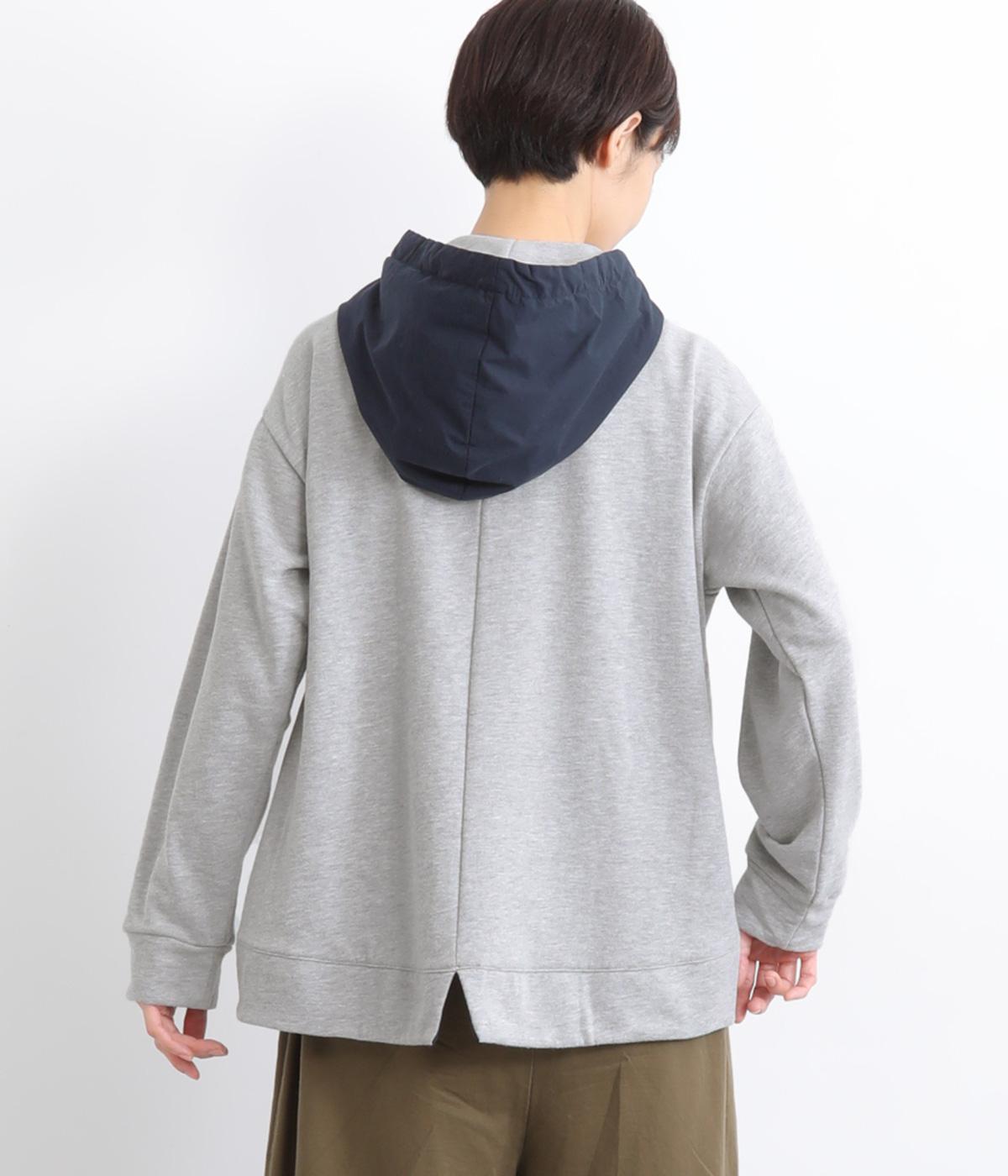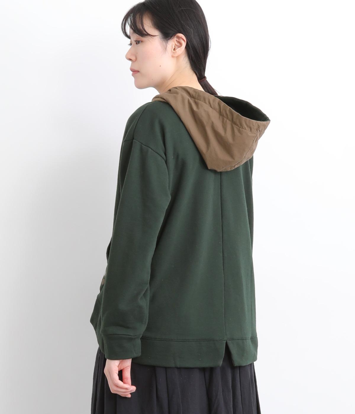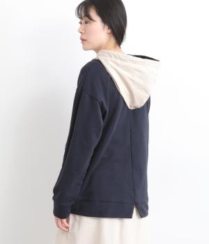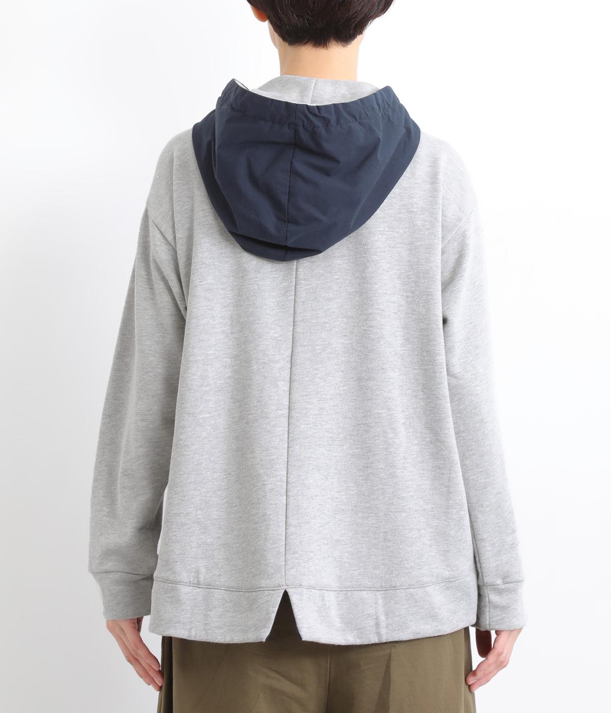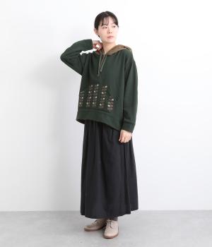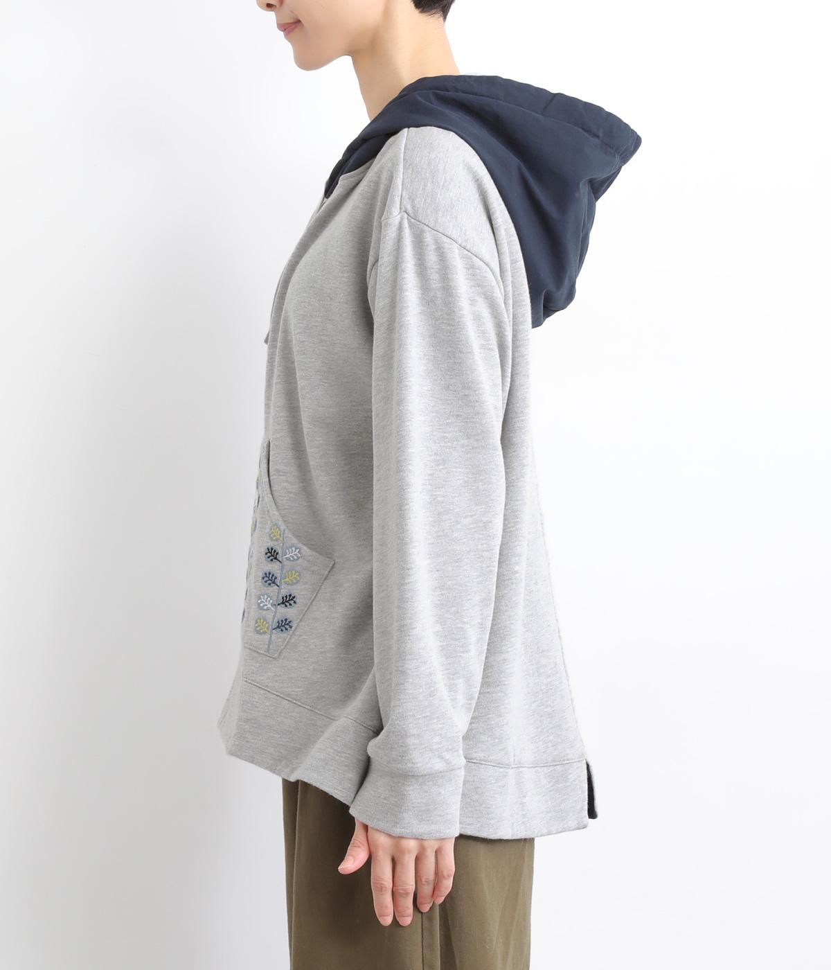 デイリー使いに最適な裏毛のフードパーカーに刺しゅうを添えてデザイン性をプラスしました。パーカーや裾の裏には配色の綿生地をあててさり気なくメリハリを。ハーフジップ式で被りやすい仕立てになっています。