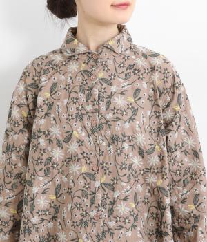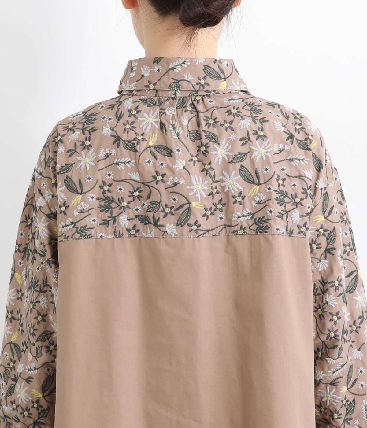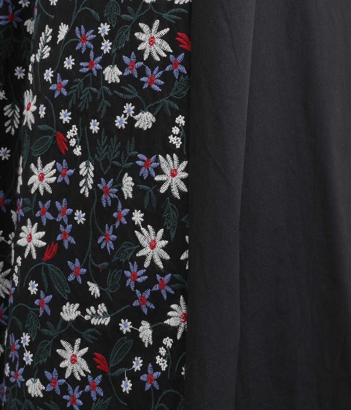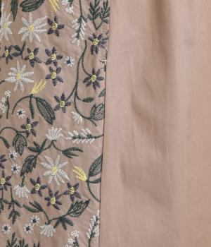上品な光沢感が魅力のコットン布帛生地を使用しています。ほどよいハリ感がシルエットを美しくキープ。着こなしに立体的な表情をうむ、繊細な刺しゅうをあしらった生地を組み合わせています。