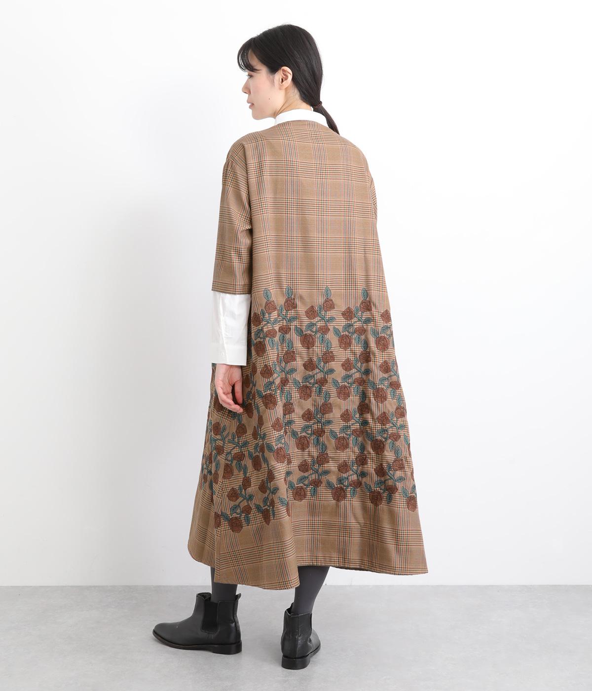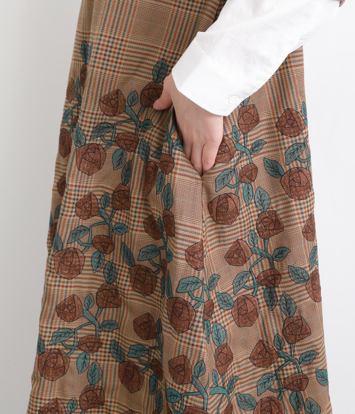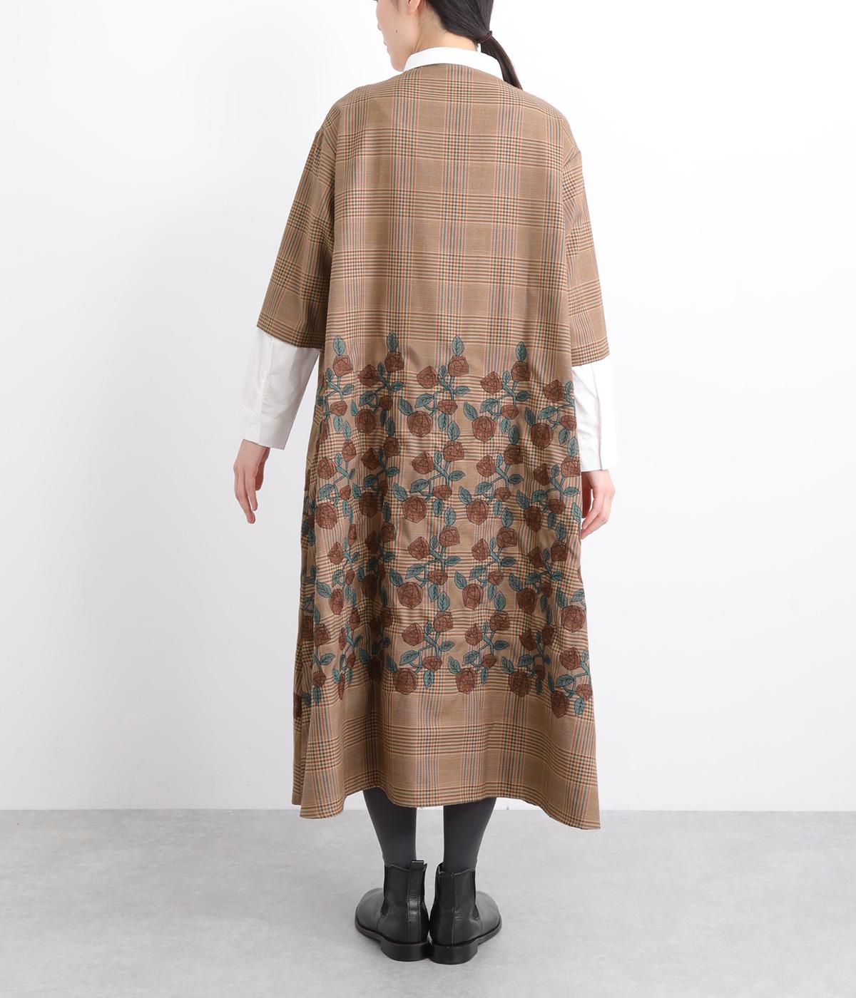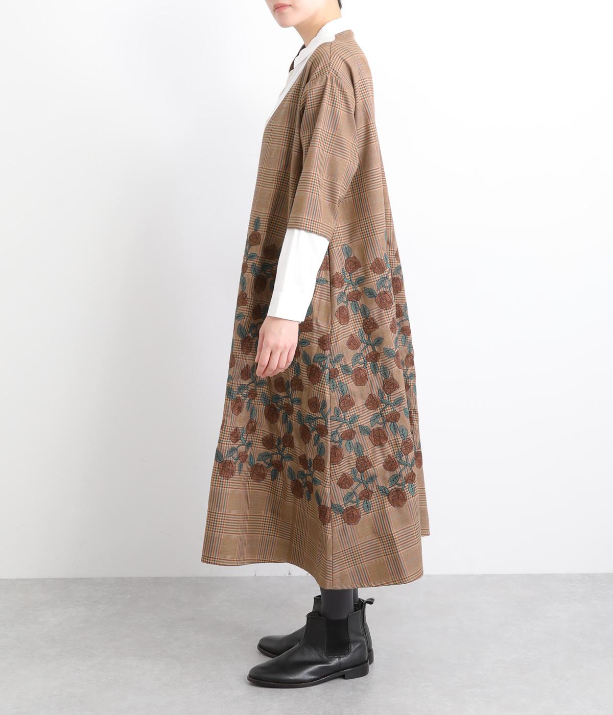 シックな印象のグレンチェック生地に大胆にほどこされたローズ刺しゅうが華やかな一着。シャツをレイヤードしているかのようなデザインで、テクニック要らずでクラシカルなスタイリングが完成。レースアップブーツやカラータイツ合わせもおすすめ。