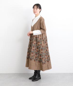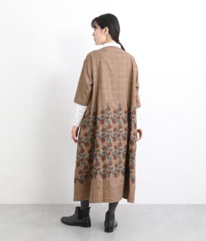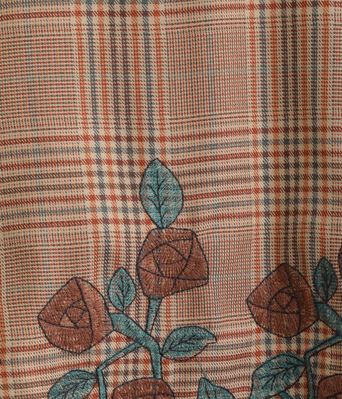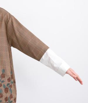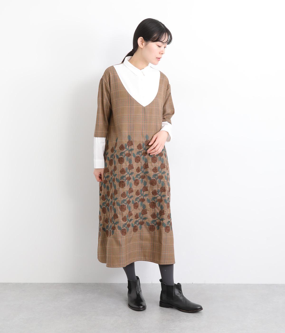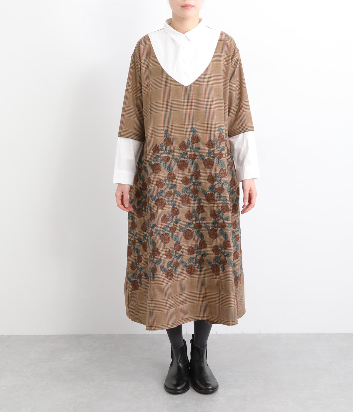 シックな印象のグレンチェック生地に大胆にほどこされたローズ刺しゅうが華やかな一着。シャツをレイヤードしているかのようなデザインで、テクニック要らずでクラシカルなスタイリングが完成。レースアップブーツやカラータイツ合わせもおすすめ。
