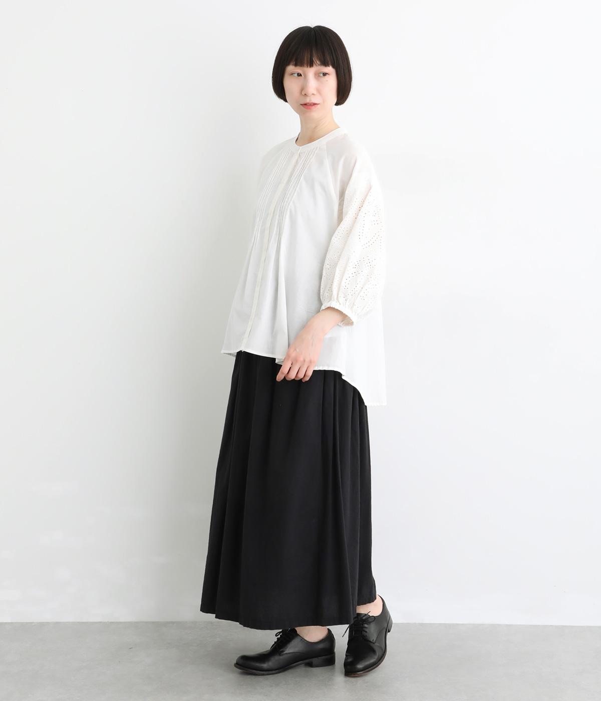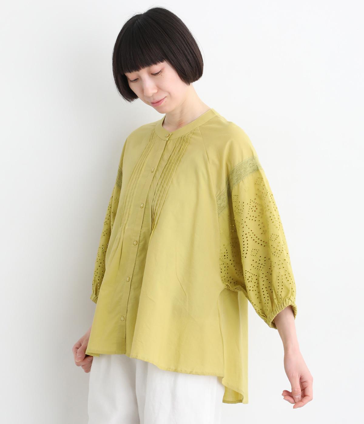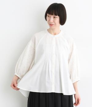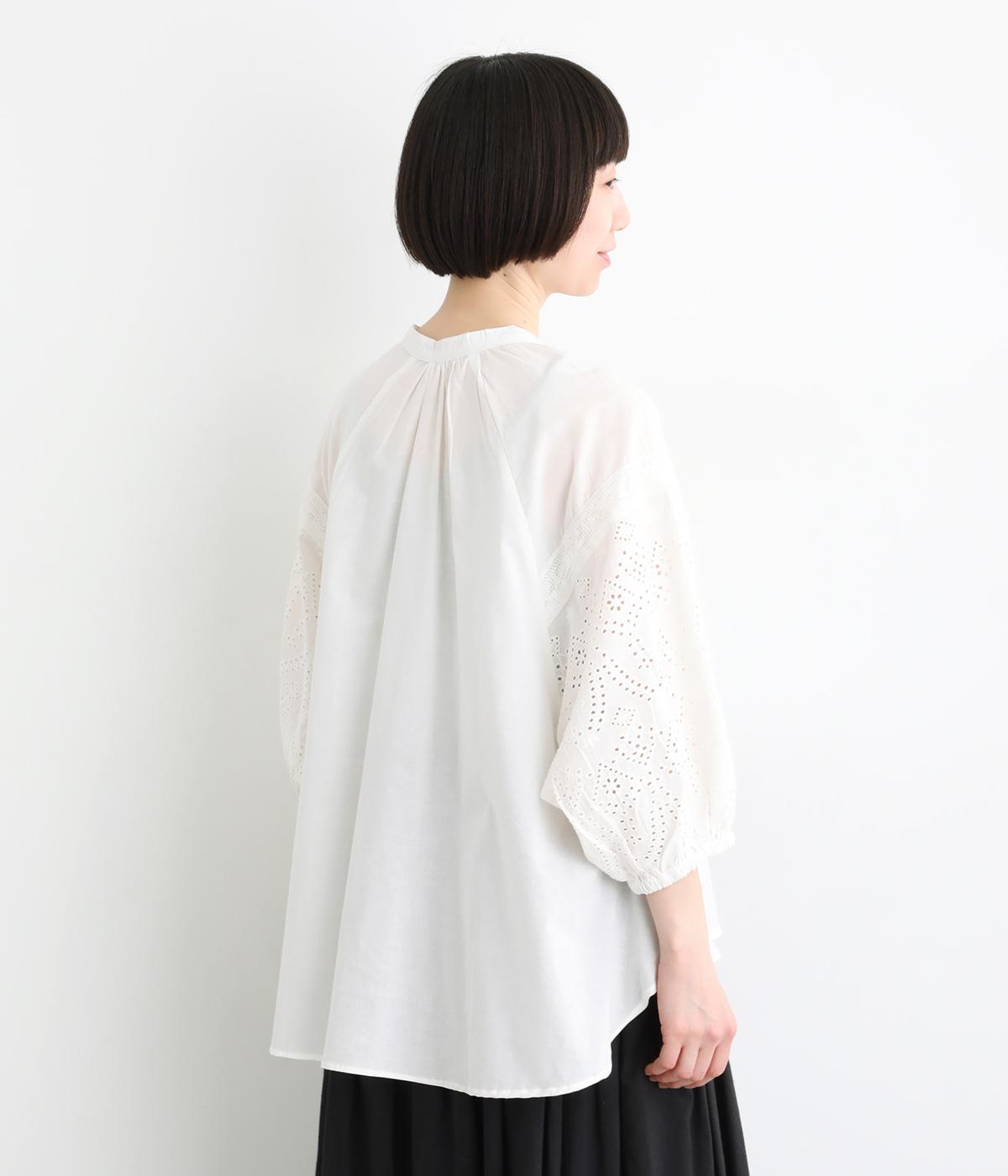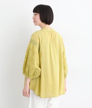 スモッグ風のゆったりとしたプルオーバーにふっくらとしたレース袖が華やかさを添えます。着丈に前後差をつけたフレアシルエットでラフなトップスアウトもお洒落見え。ボタンあき仕様で汗ばむ季節の軽い羽織りにしても◎。