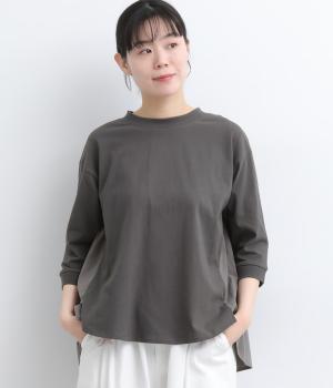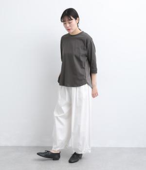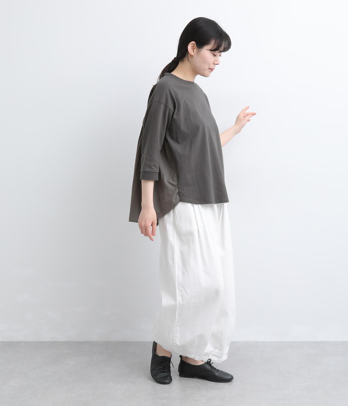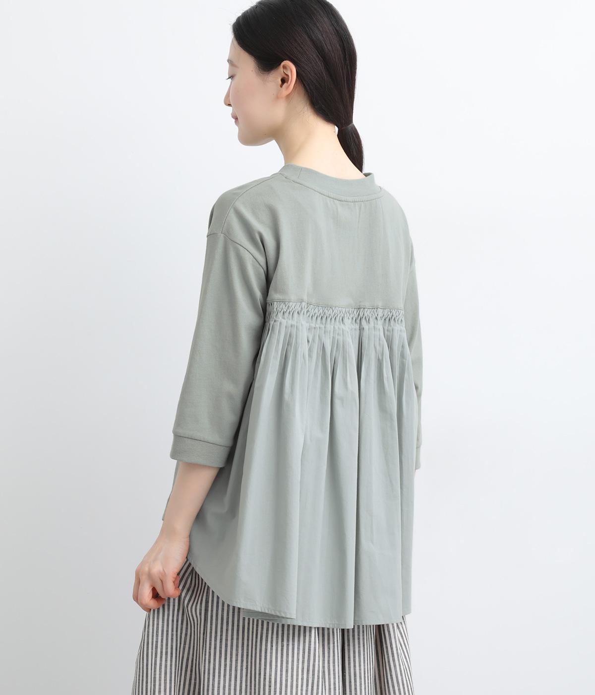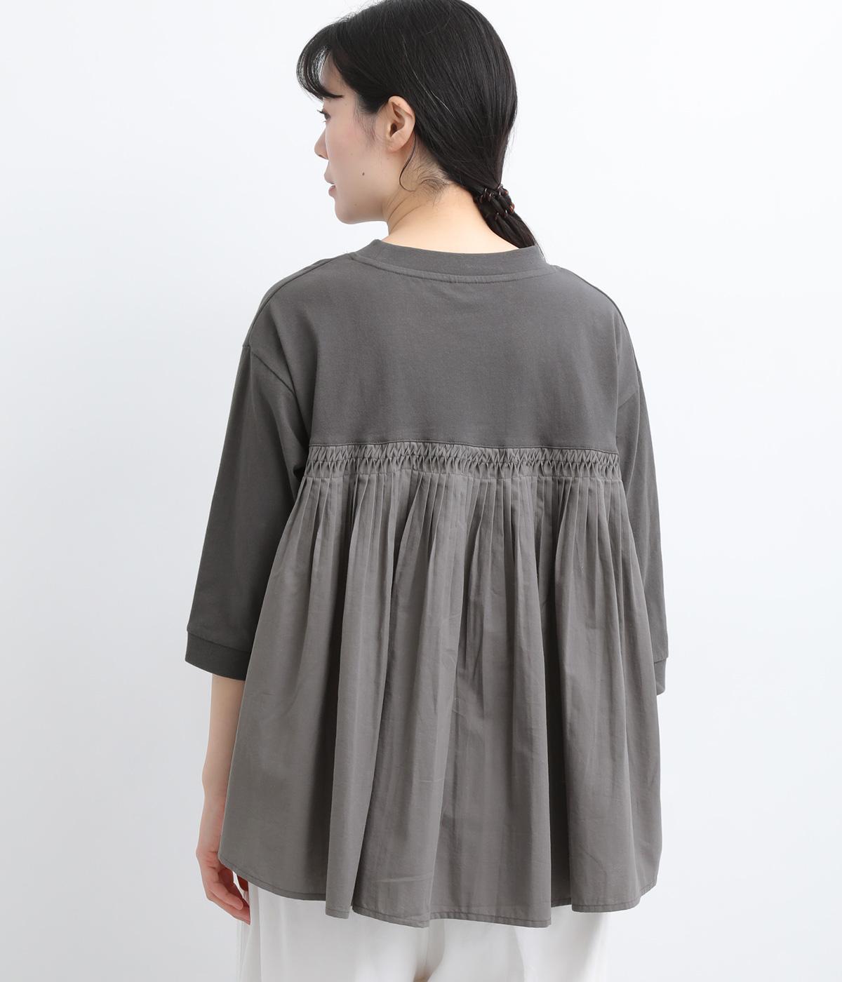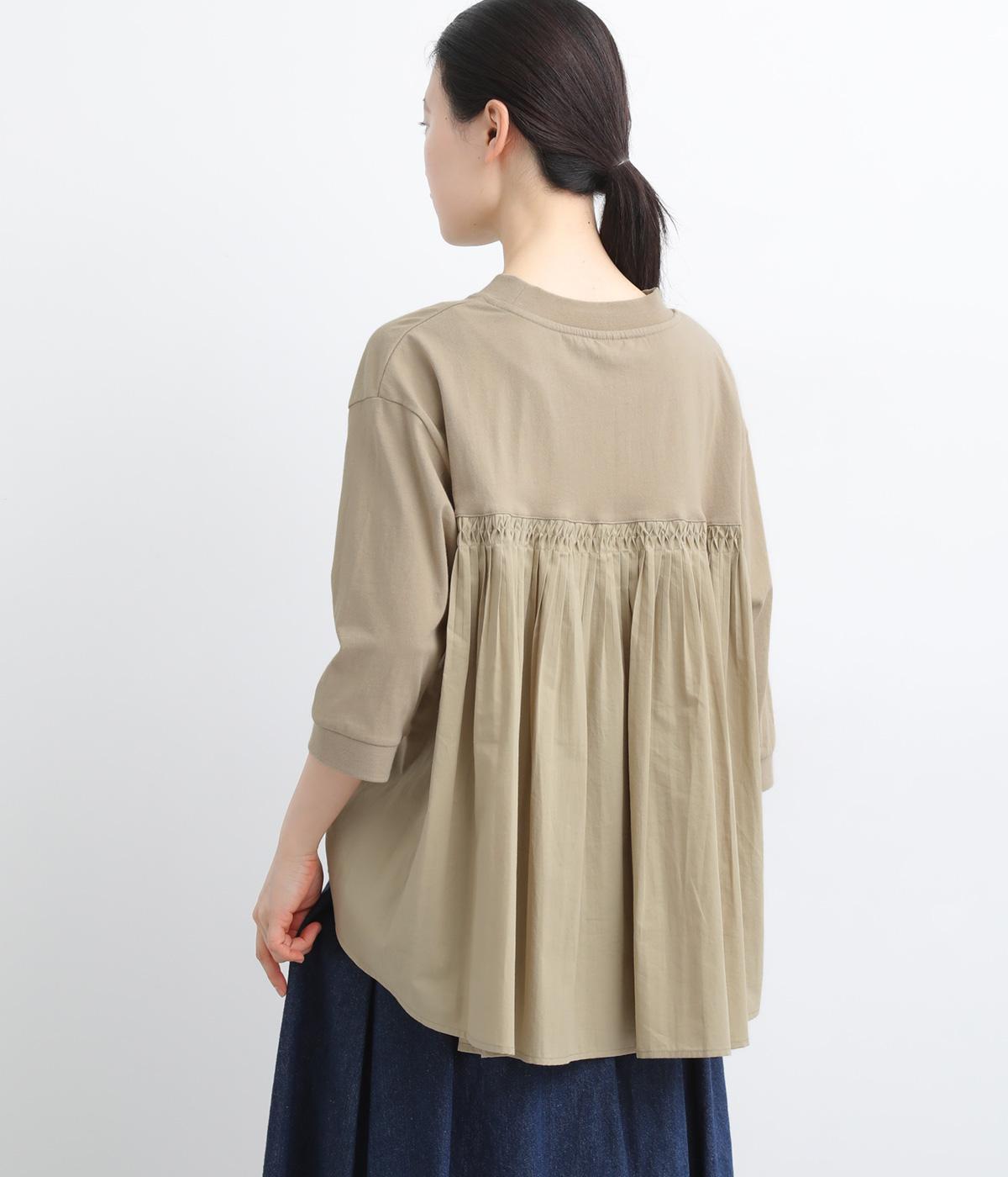 背面を布帛で切り替えた、前後で表情の異なるデザインです。異素材のコントラストが、奥行きのある上品な印象を添えます。ゆとりのあるワイドな身幅で、体のラインを拾いにくいのもうれしいポイント。七分袖が抜け感をつくり、コーディネートをバランスよくまとめます。