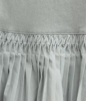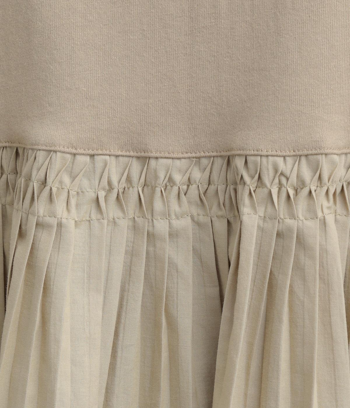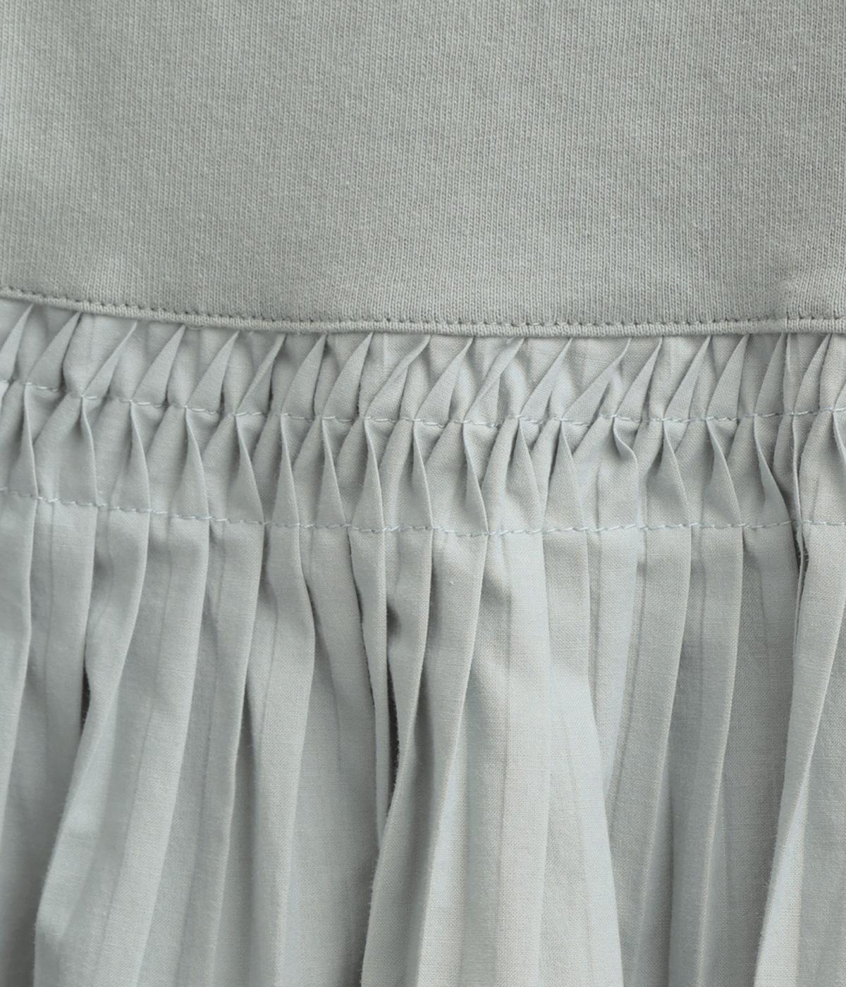環境に配慮したリサイクルコットンを使用。やさしい肌ざわりが魅力です。前身頃はやわらかくなじむ天竺、背面はほどよいハリのある布帛で切り替え、異なる質感をたのしめる仕上がりに。通気性もよく、季節の変わり目も快適に過ごせます。