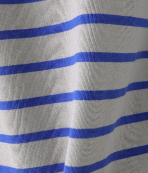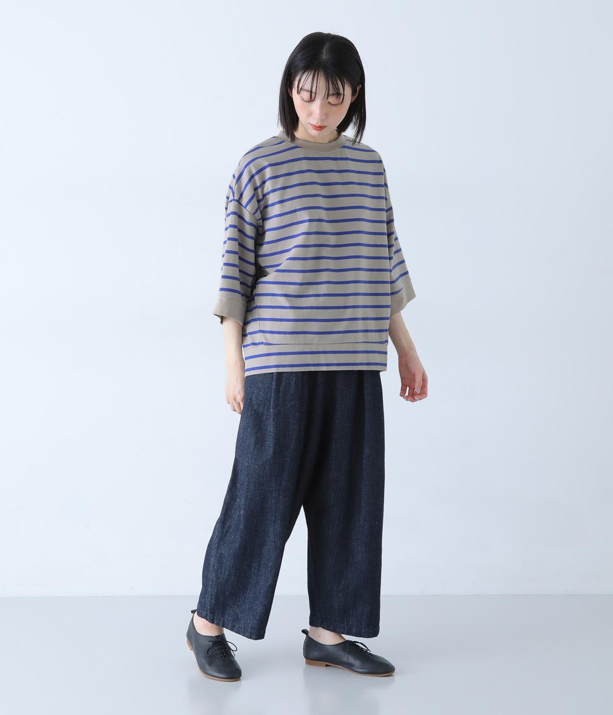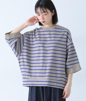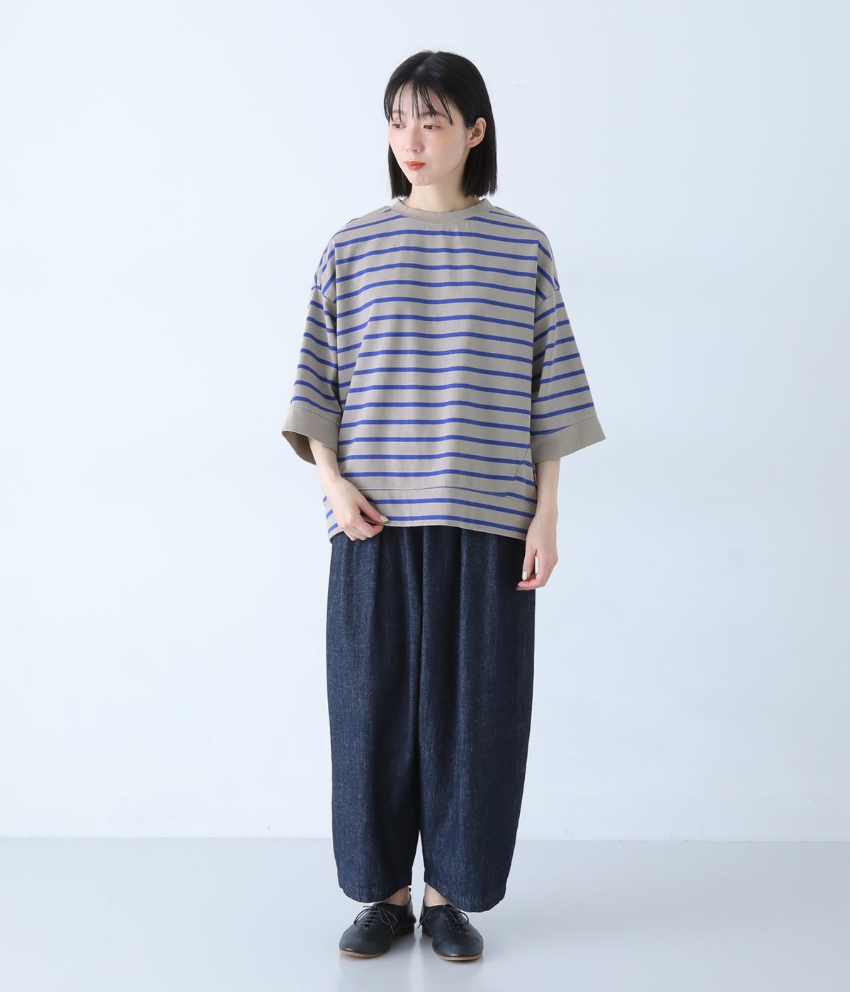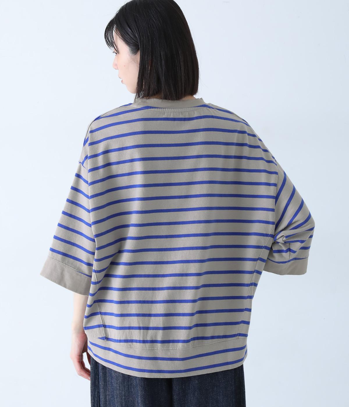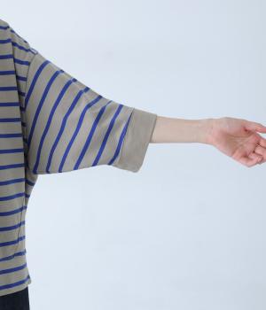 アームホールを広く取ったドルマンスリーブとやや丸みを持たせた身頃がポイントのボーダーTシャツ。体のラインをカバーしつつ計算されたシルエットが洒落感を漂わせます。ネックまわりと袖口の無地切り替えが抜け感をプラス。スカートにもパンツにも合わせやすい使い勝手のよいアイテムです。