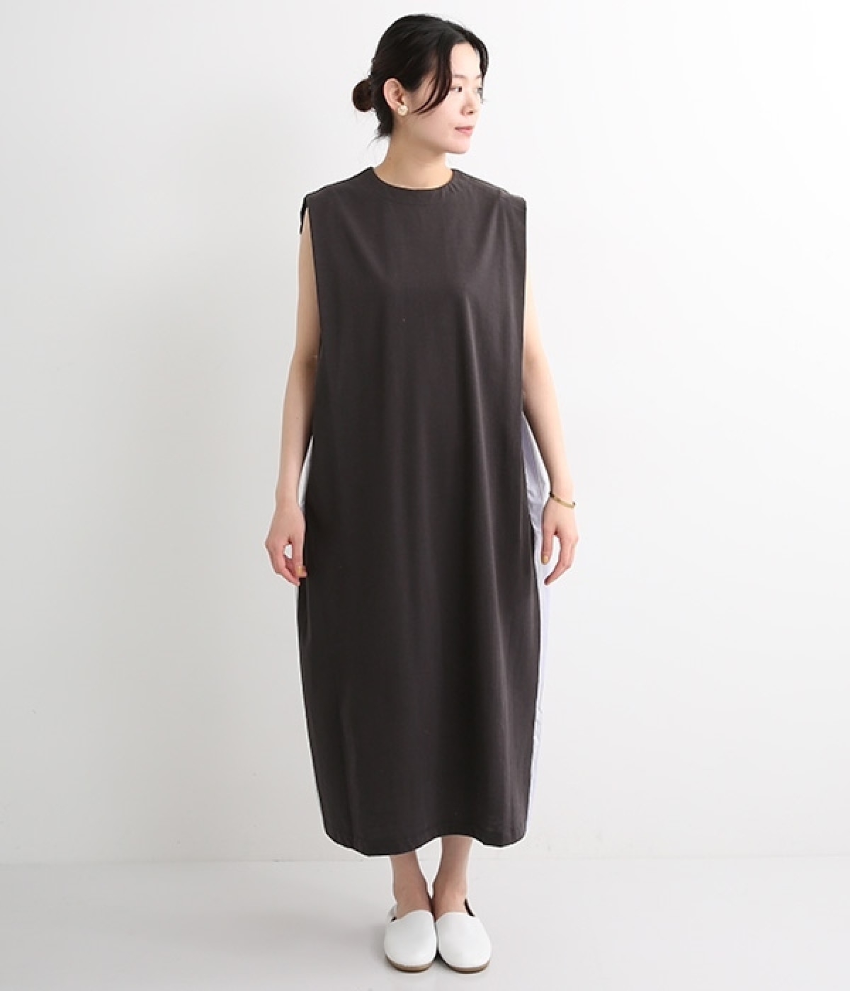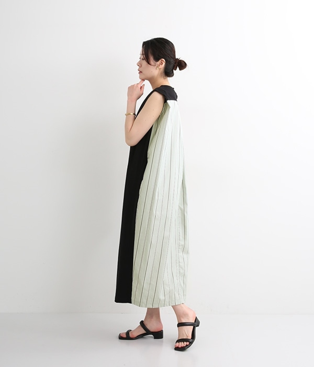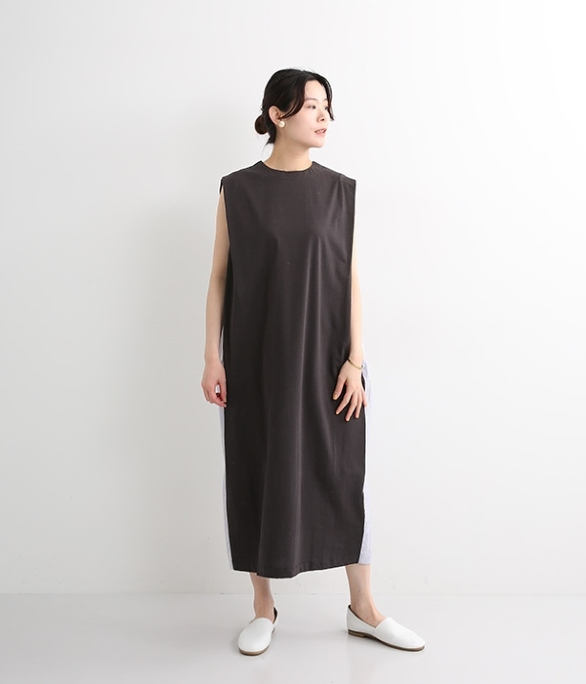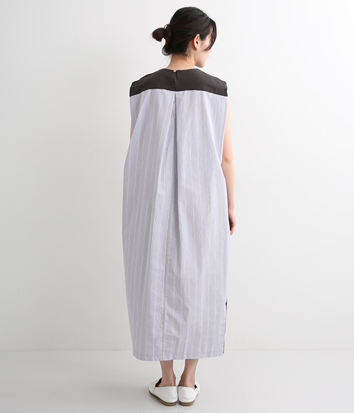 ハイゲージの天竺生地と、目の詰まったタイプライターのストライプ生地を組み合わせたノースリーブワンピースです。肩から身頃にかけてタックを施したシルエットがポイント。肩のラインが出すぎずすっきりと見せてくれます。羽織りものを合わせても好バランス。一枚で完結する、楽ちんだけど手抜きに見えない大人のデイリーアイテムです。