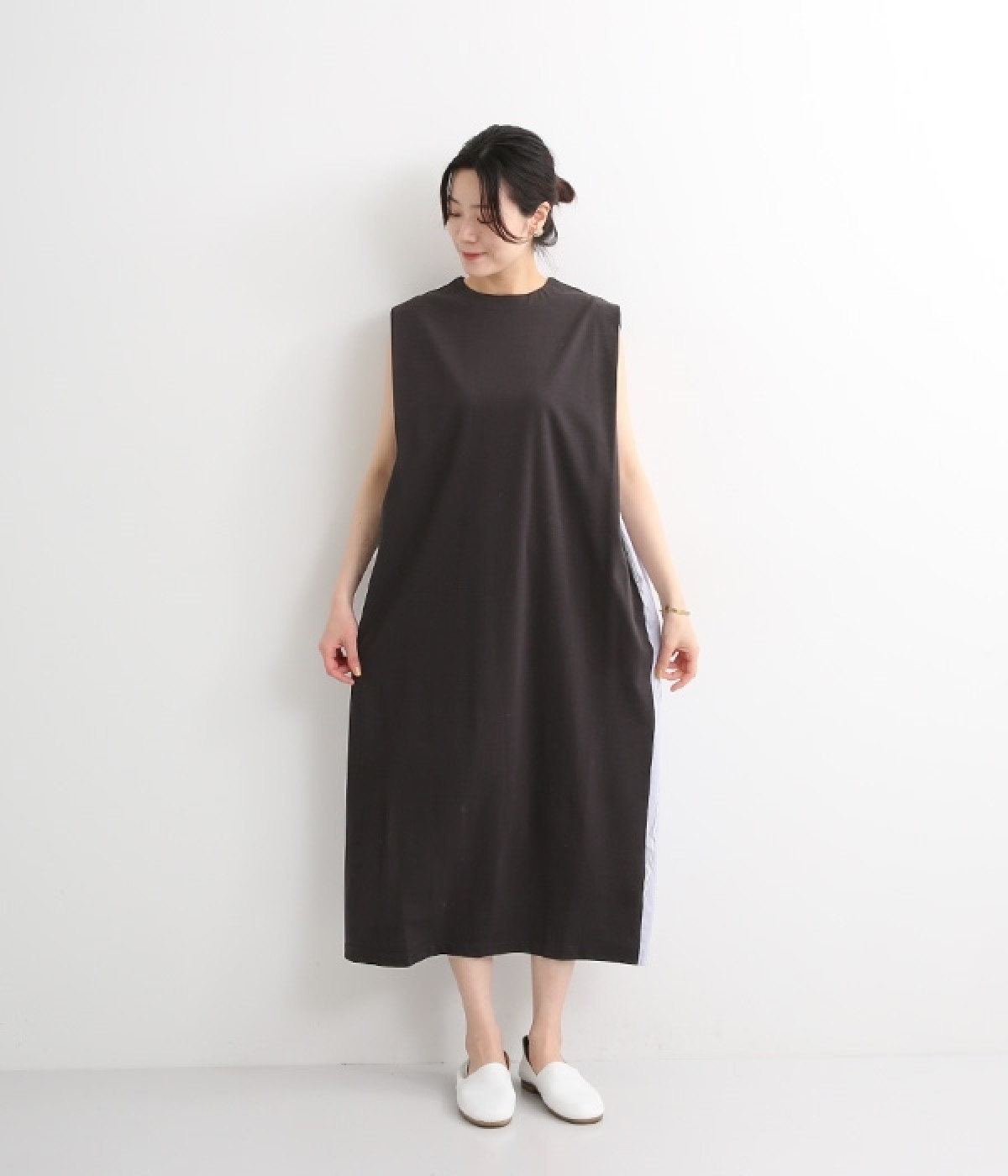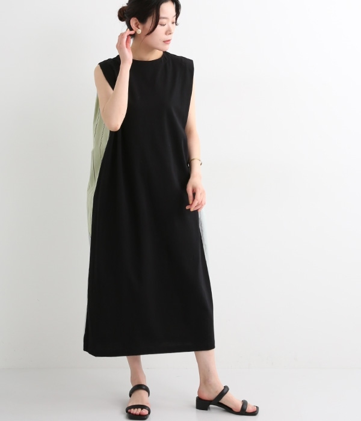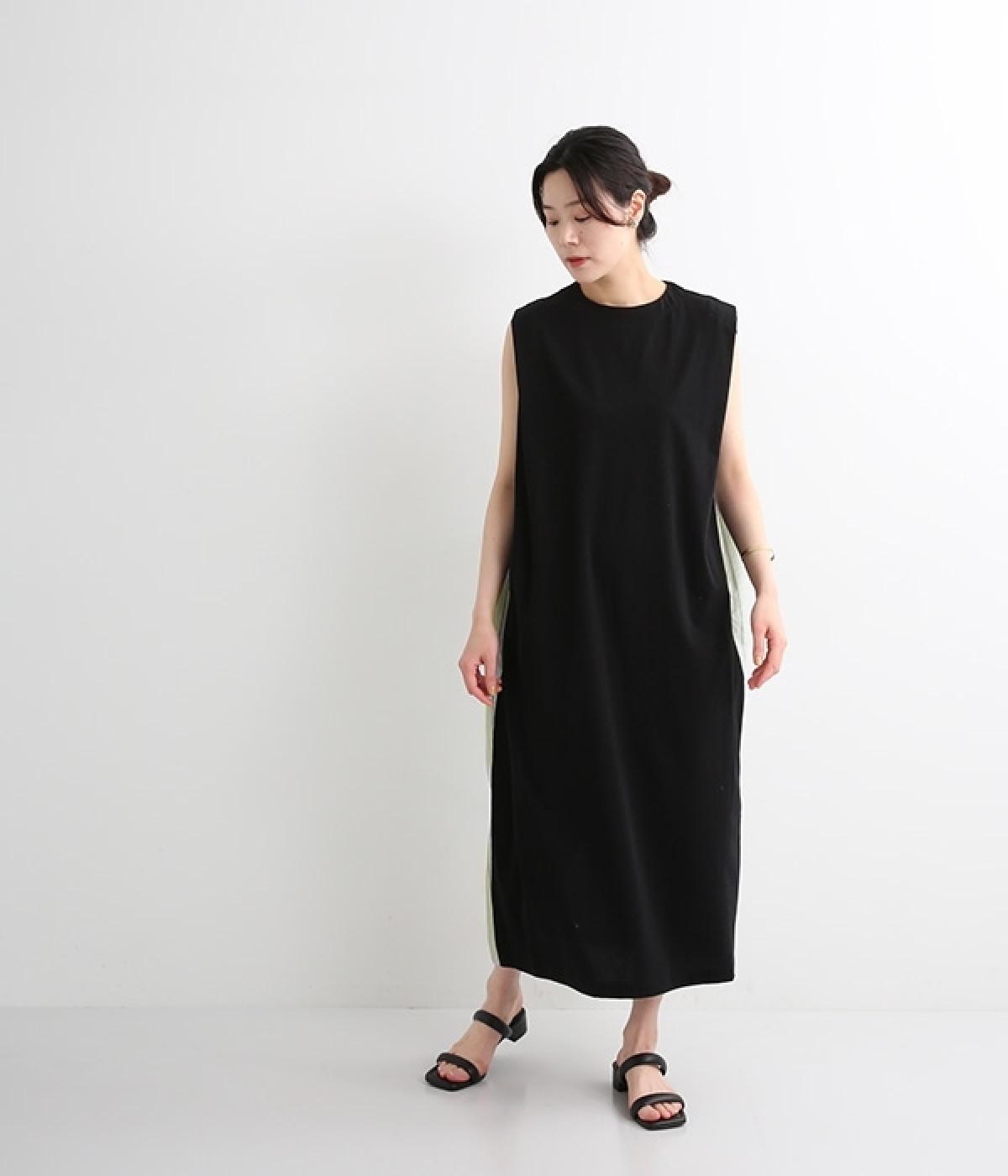 ハイゲージの天竺生地と、目の詰まったタイプライターのストライプ生地を組み合わせたノースリーブワンピースです。肩から身頃にかけてタックを施したシルエットがポイント。肩のラインが出すぎずすっきりと見せてくれます。羽織りものを合わせても好バランス。一枚で完結する、楽ちんだけど手抜きに見えない大人のデイリーアイテムです。