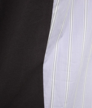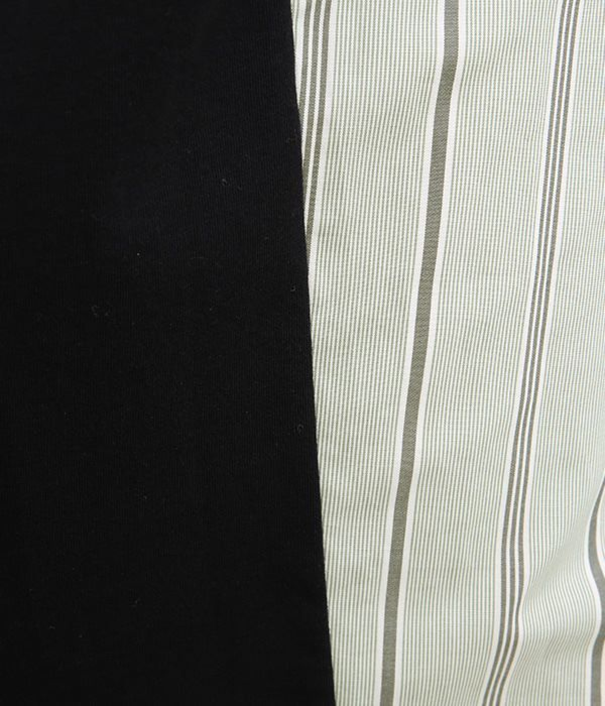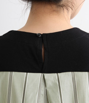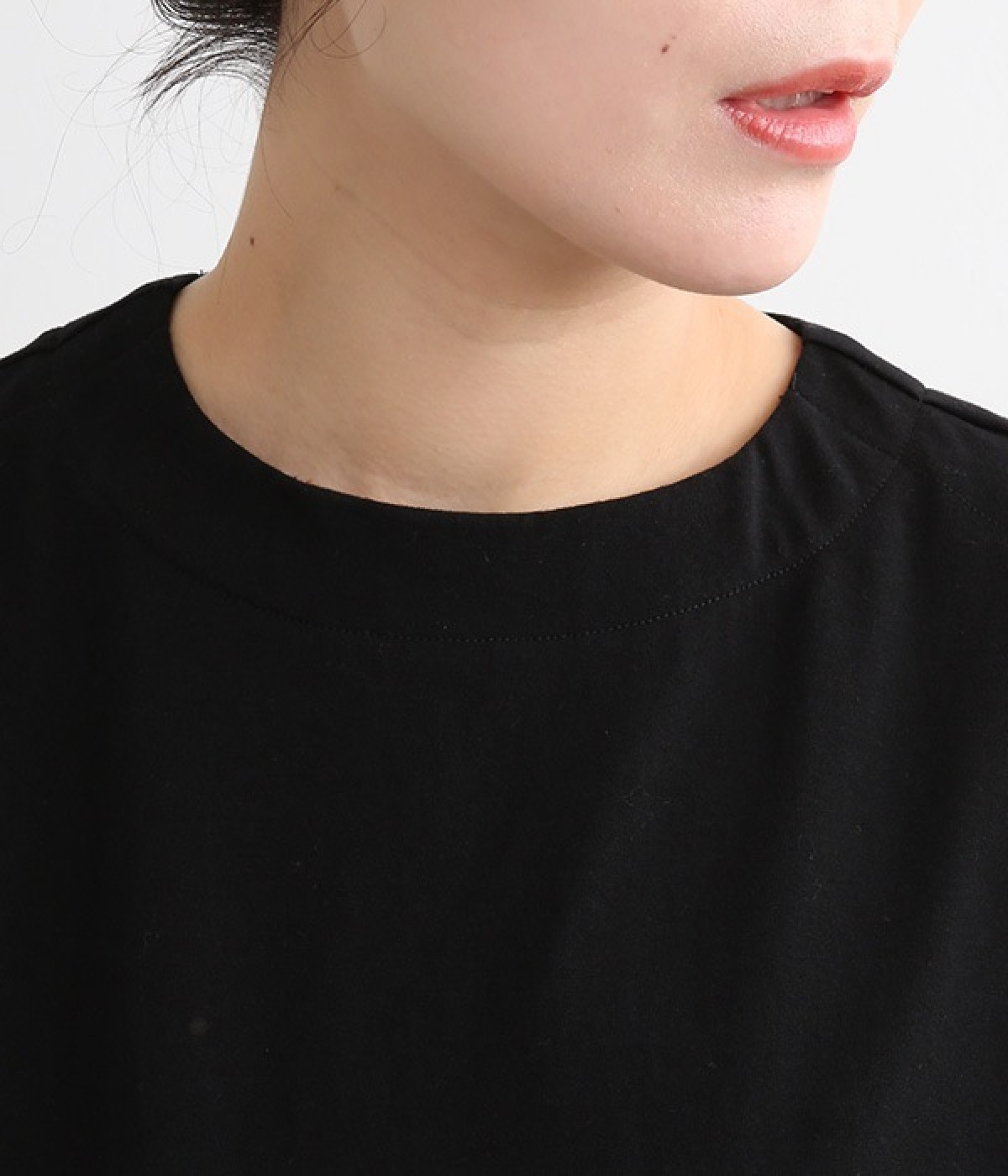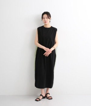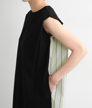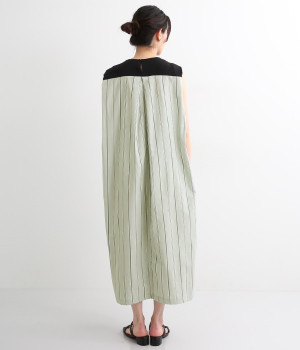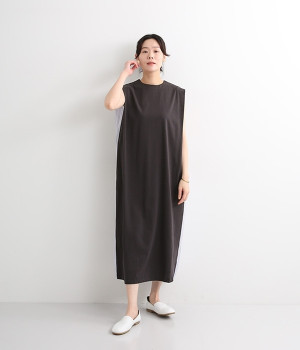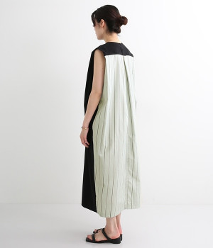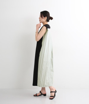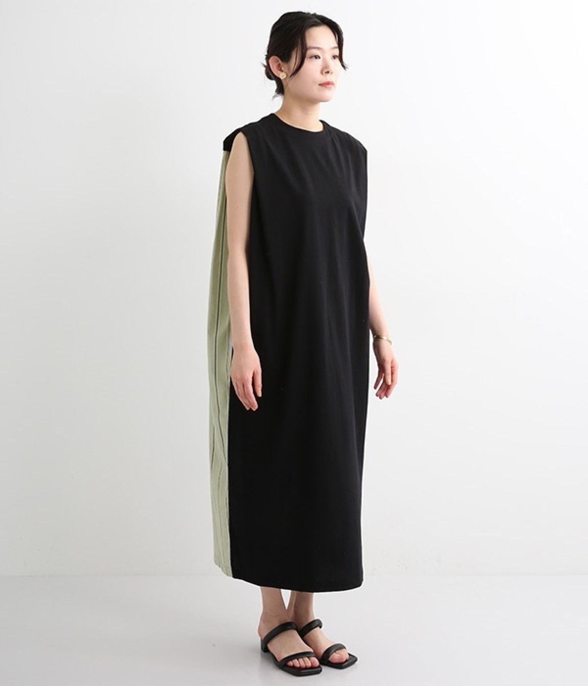 ハイゲージの天竺生地と、目の詰まったタイプライターのストライプ生地を組み合わせたノースリーブワンピースです。肩から身頃にかけてタックを施したシルエットがポイント。肩のラインが出すぎずすっきりと見せてくれます。羽織りものを合わせても好バランス。一枚で完結する、楽ちんだけど手抜きに見えない大人のデイリーアイテムです。