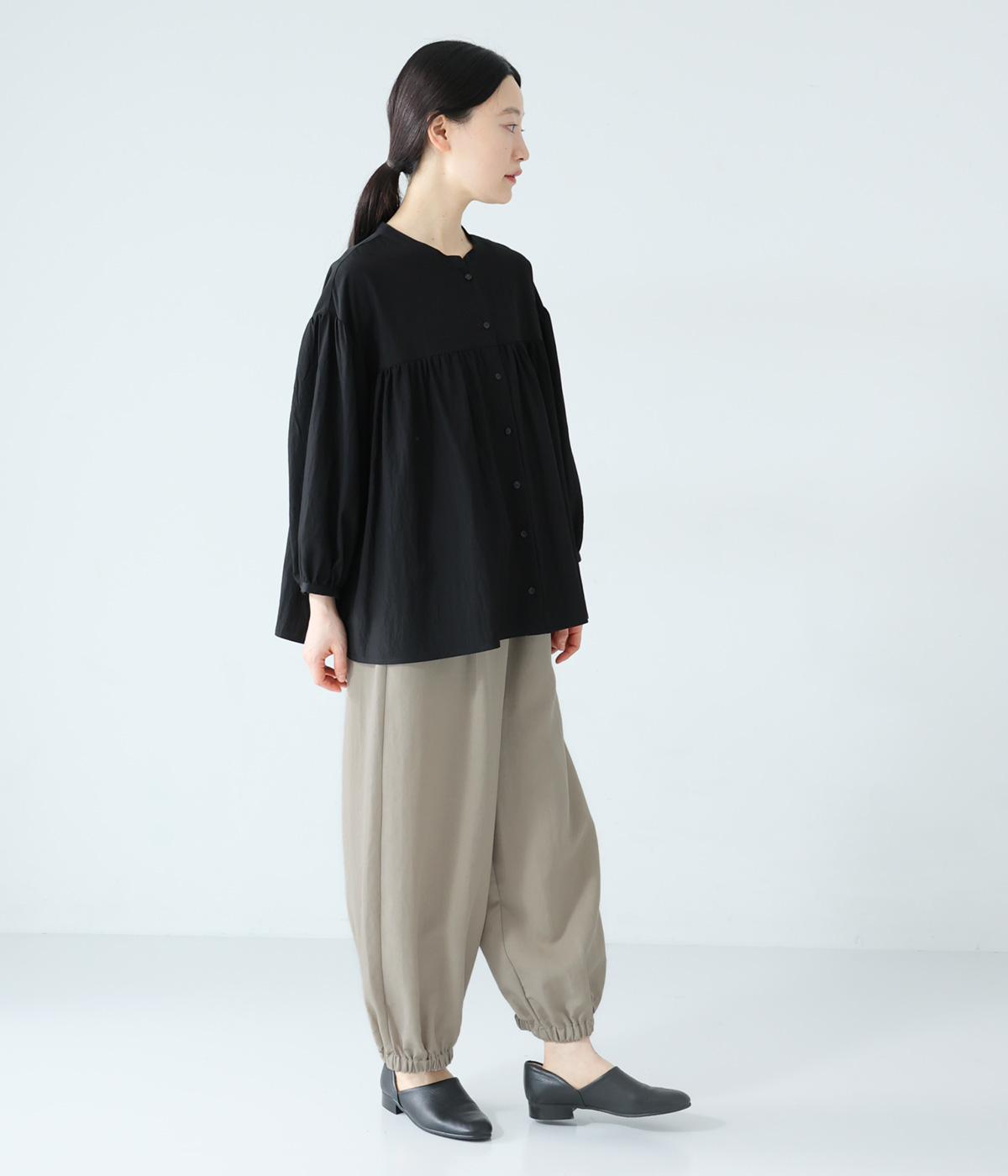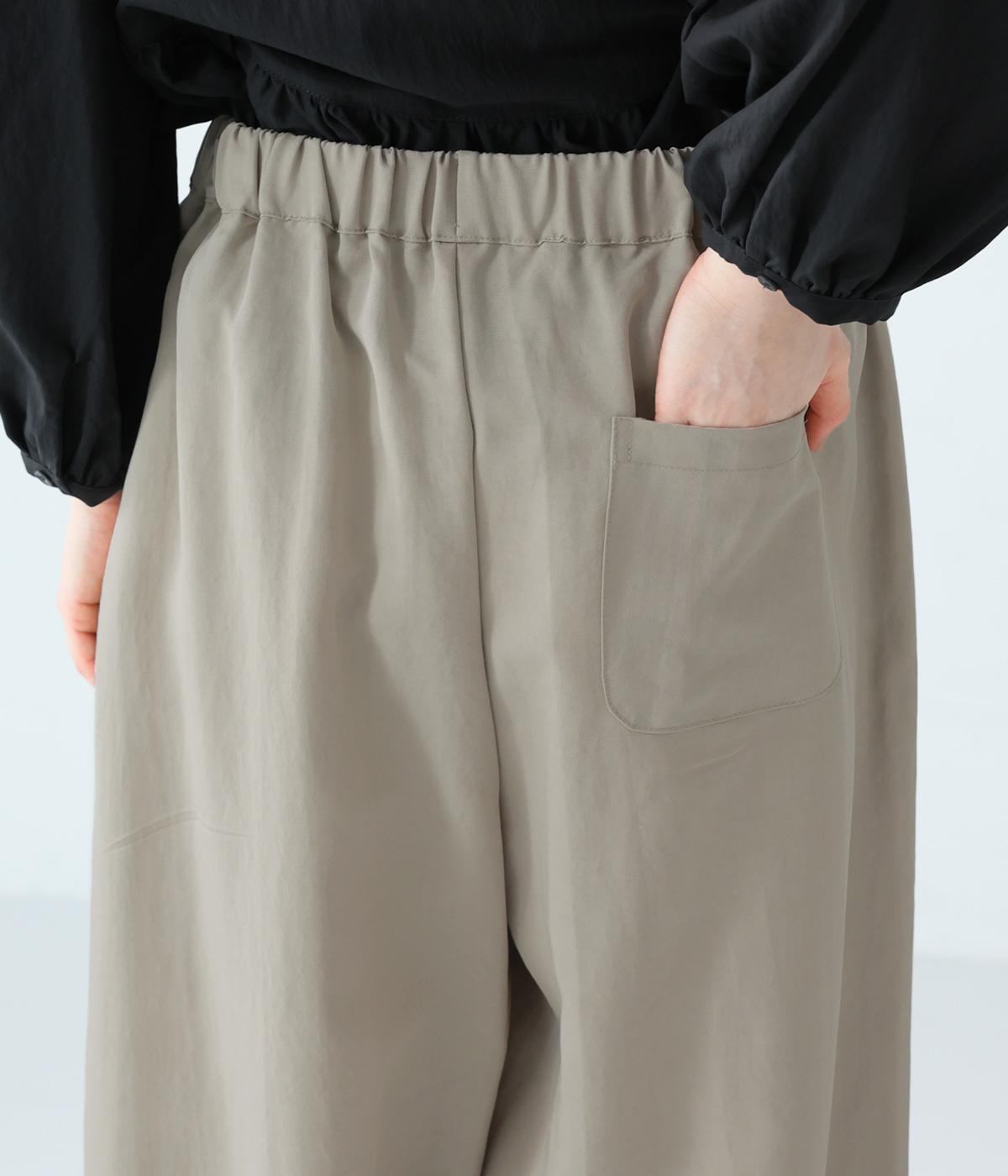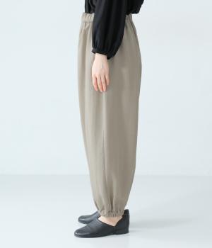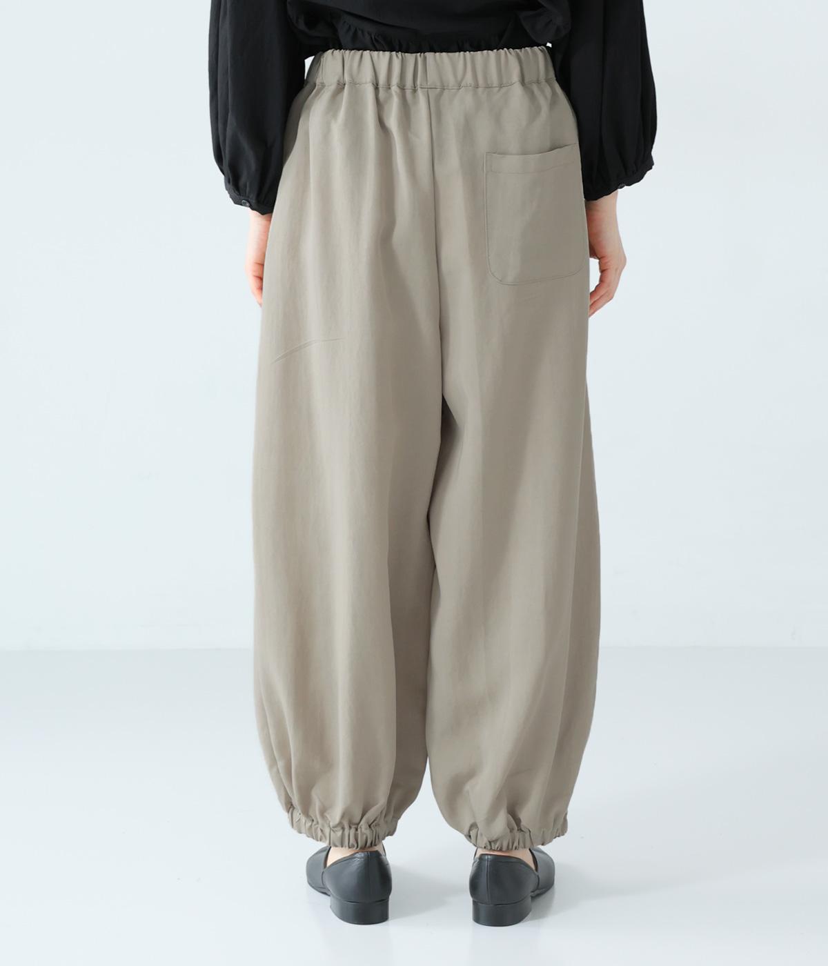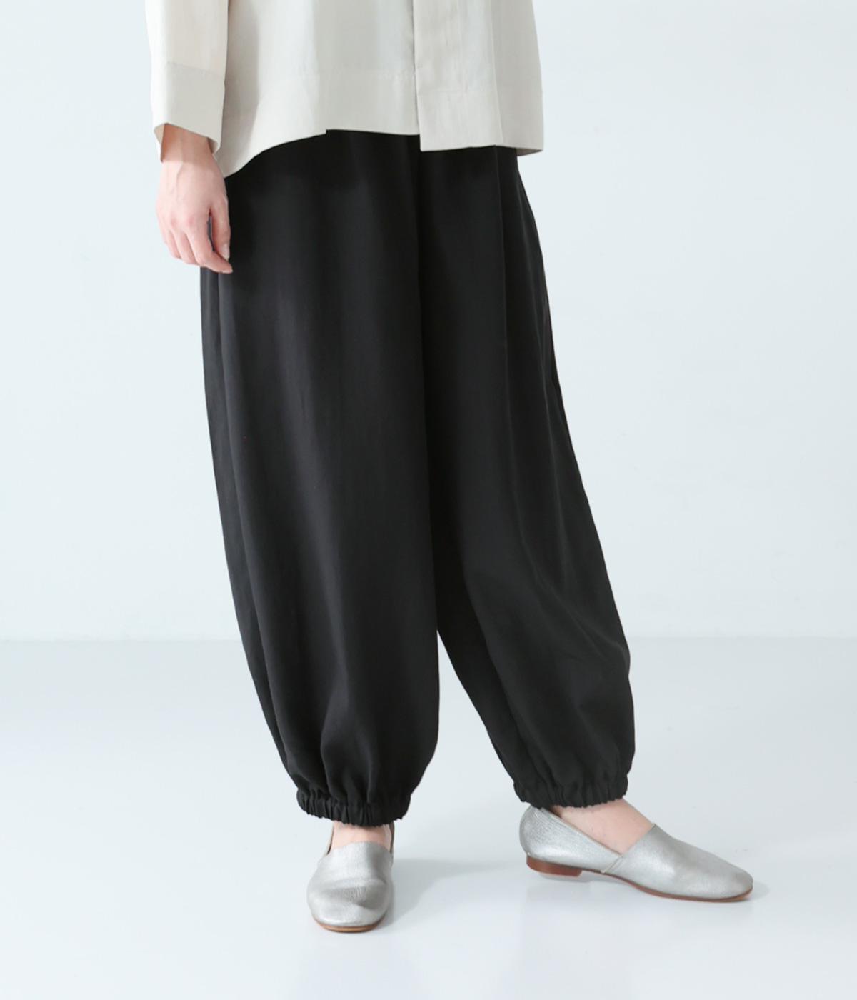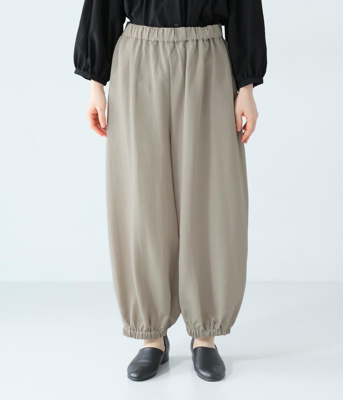 ギャザーによる陰影が表情にニュアンスを添えるパンツです。ほどよく丸みのあるシルエットが自然な立体感をつくり、軽やかな動きをプラス。ウエストは総ゴム仕様で、リラックス感のある穿き心地に仕上げています。