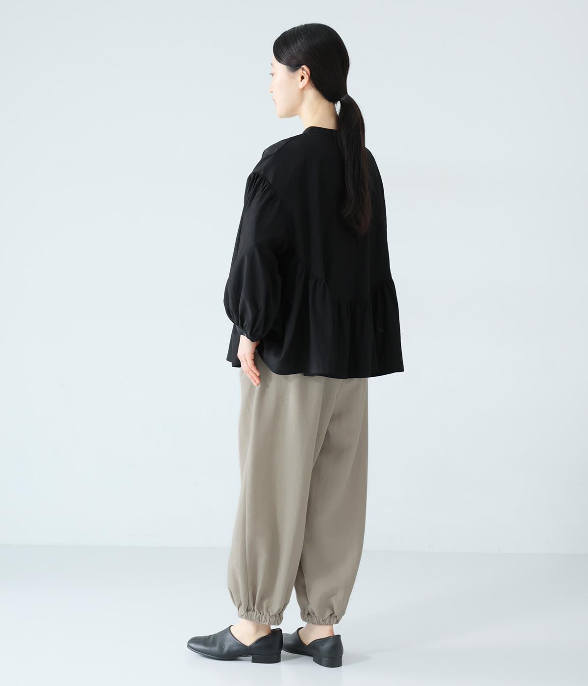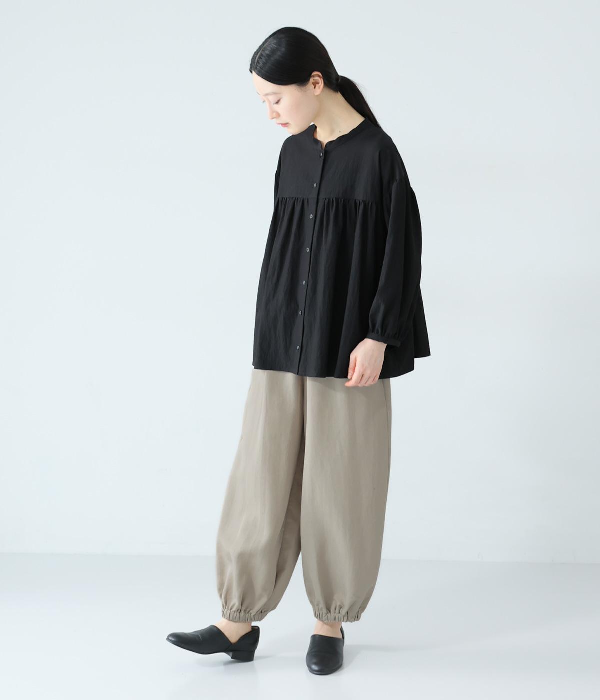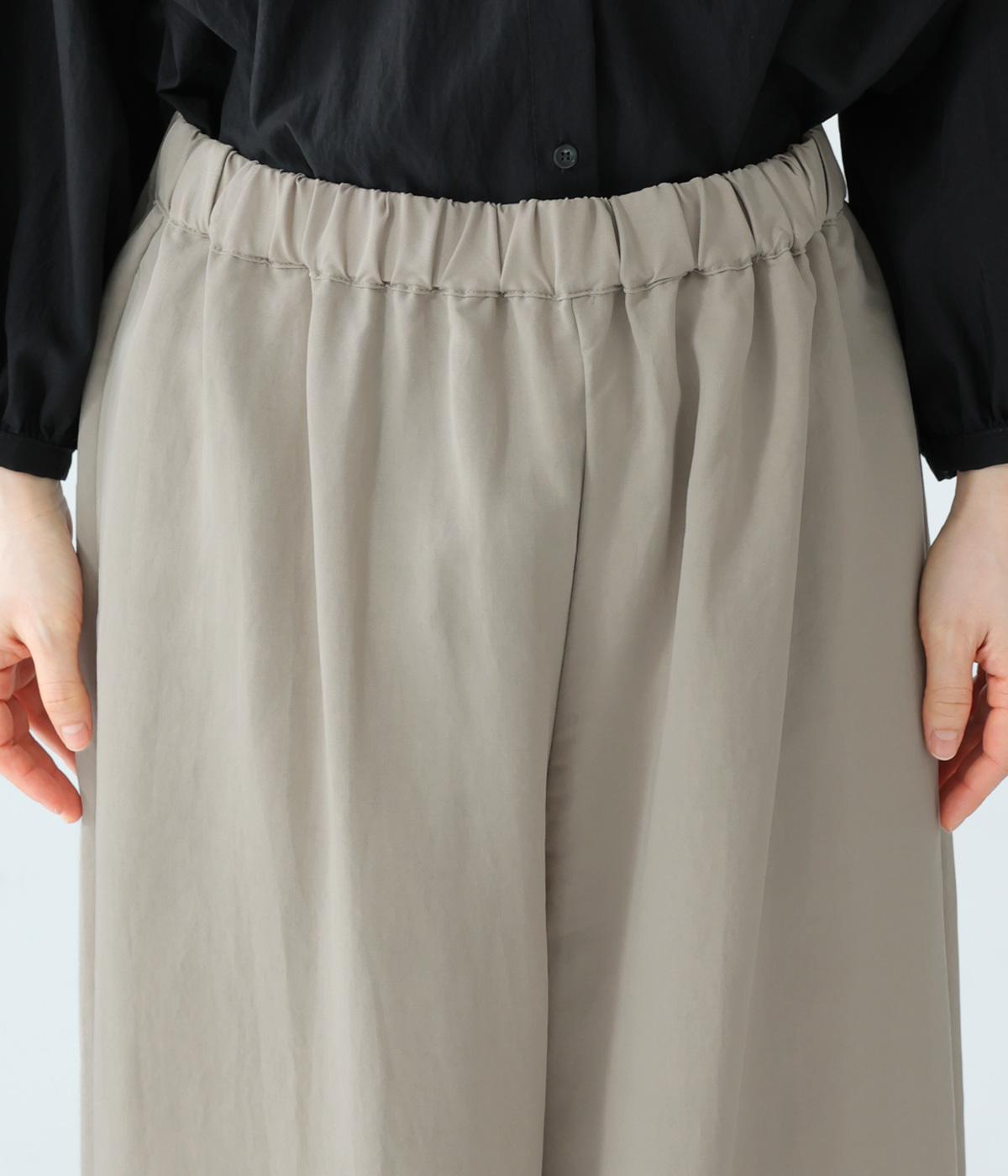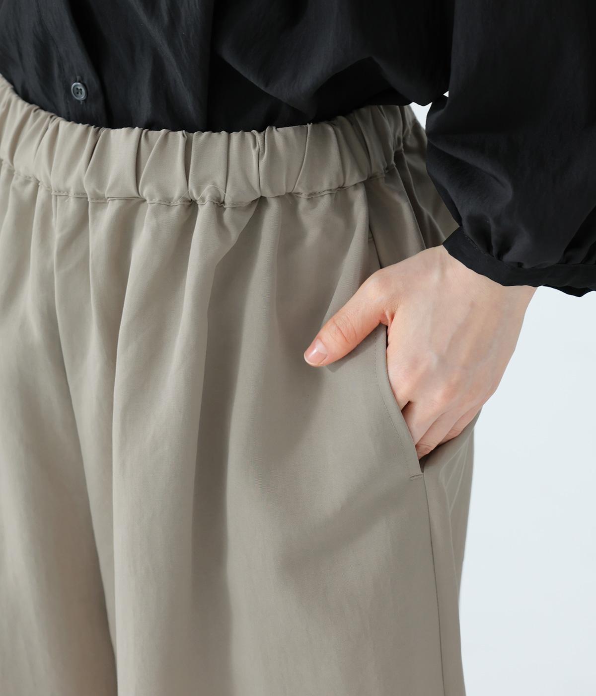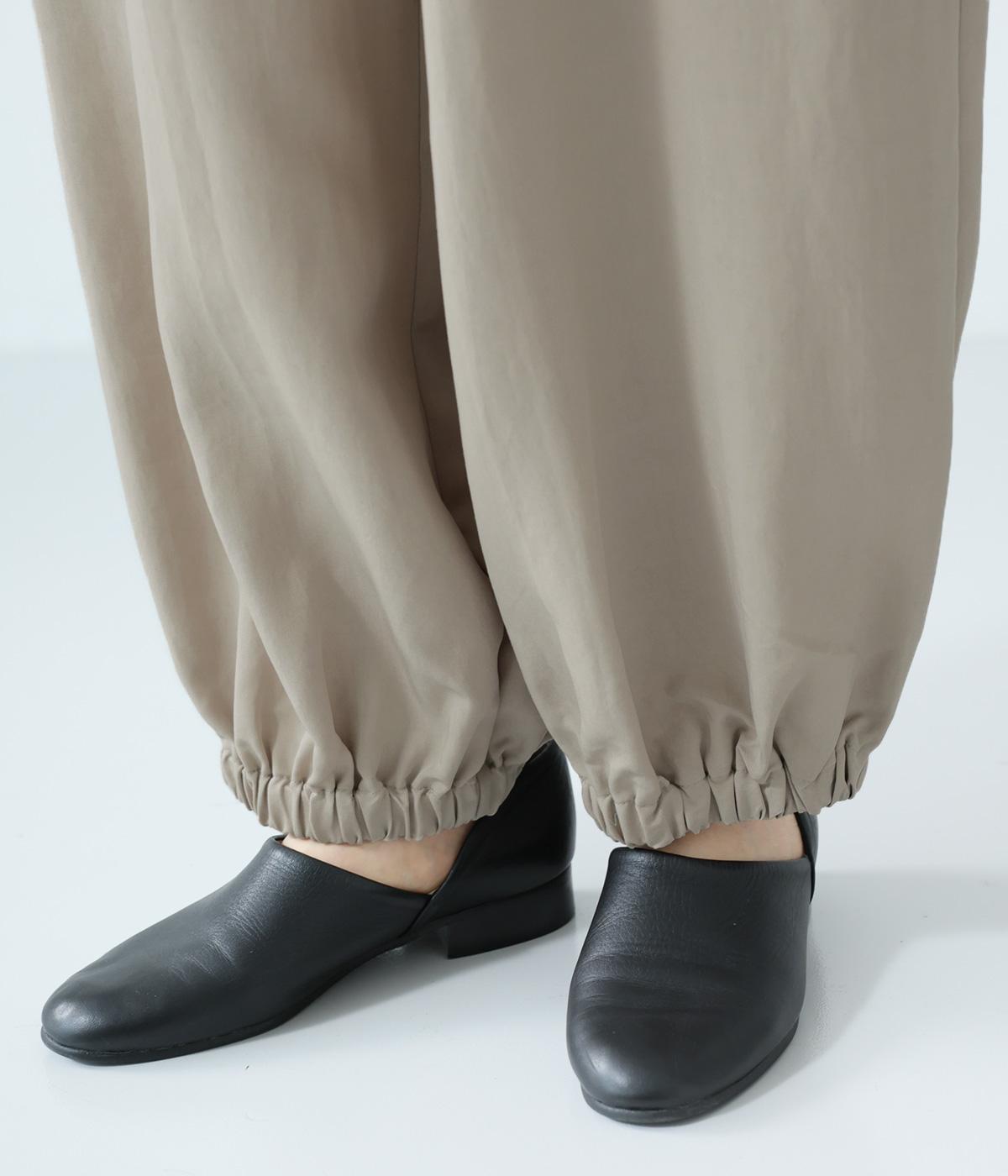 ギャザーによる陰影が表情にニュアンスを添えるパンツです。ほどよく丸みのあるシルエットが自然な立体感をつくり、軽やかな動きをプラス。ウエストは総ゴム仕様で、リラックス感のある穿き心地に仕上げています。