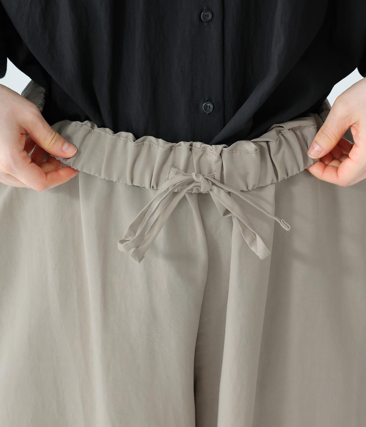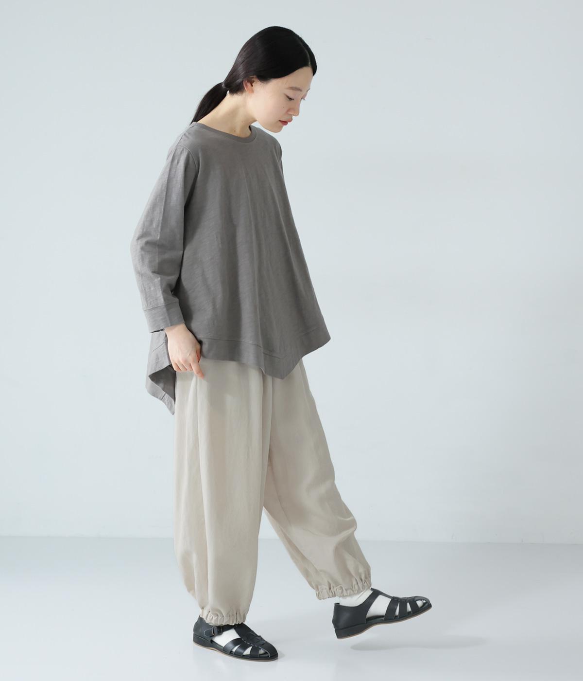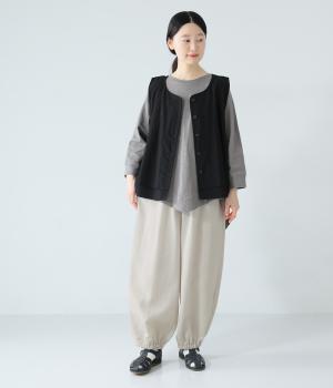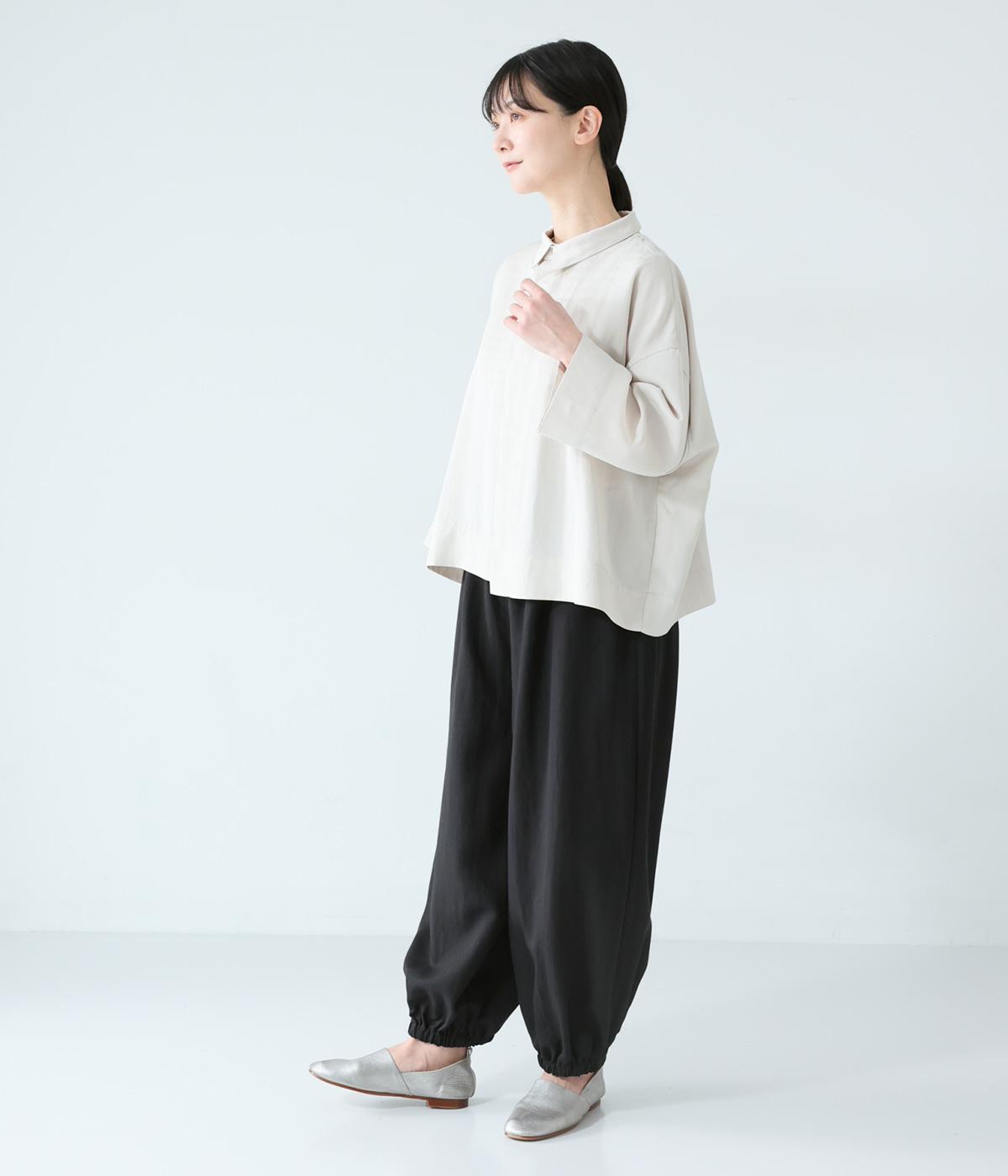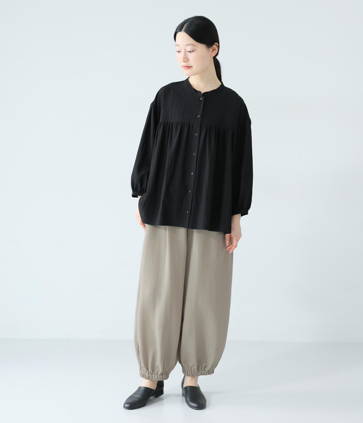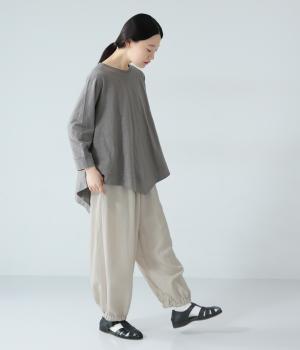 ギャザーによる陰影が表情にニュアンスを添えるパンツです。ほどよく丸みのあるシルエットが自然な立体感をつくり、軽やかな動きをプラス。ウエストは総ゴム仕様で、リラックス感のある穿き心地に仕上げています。