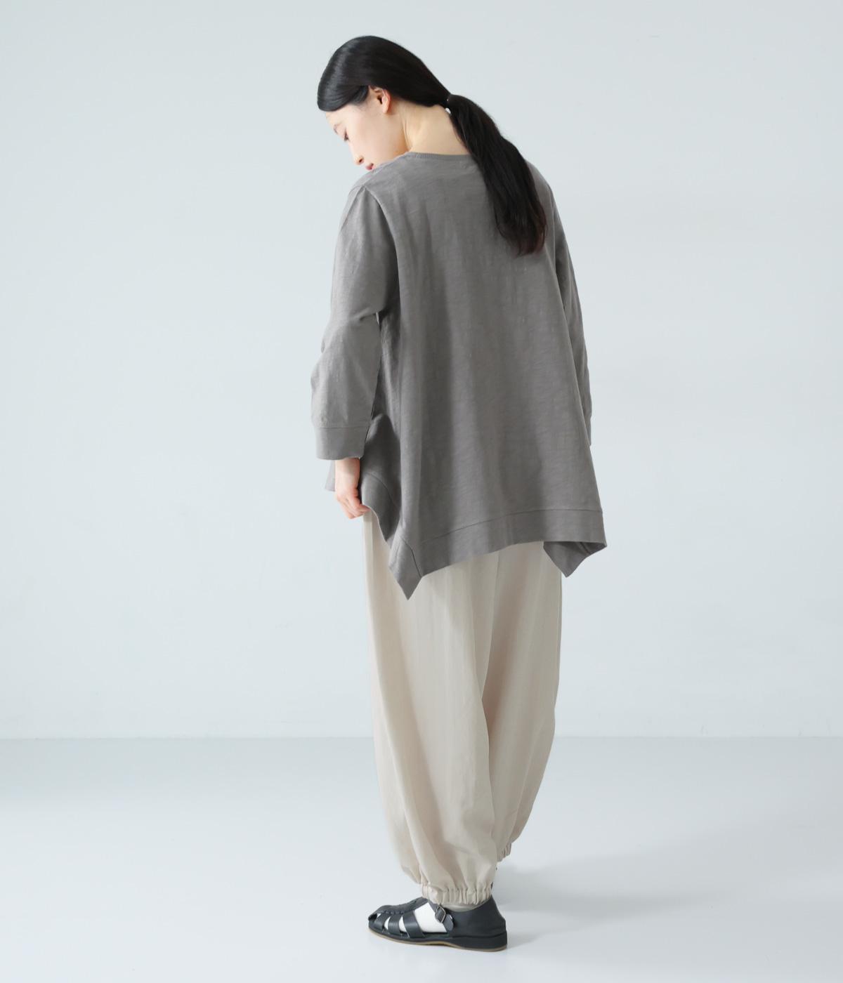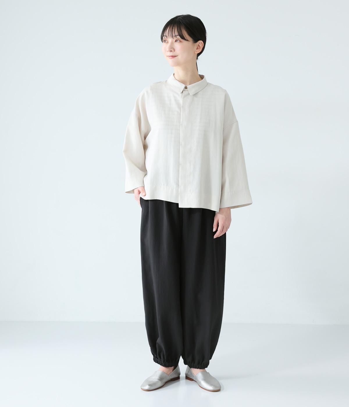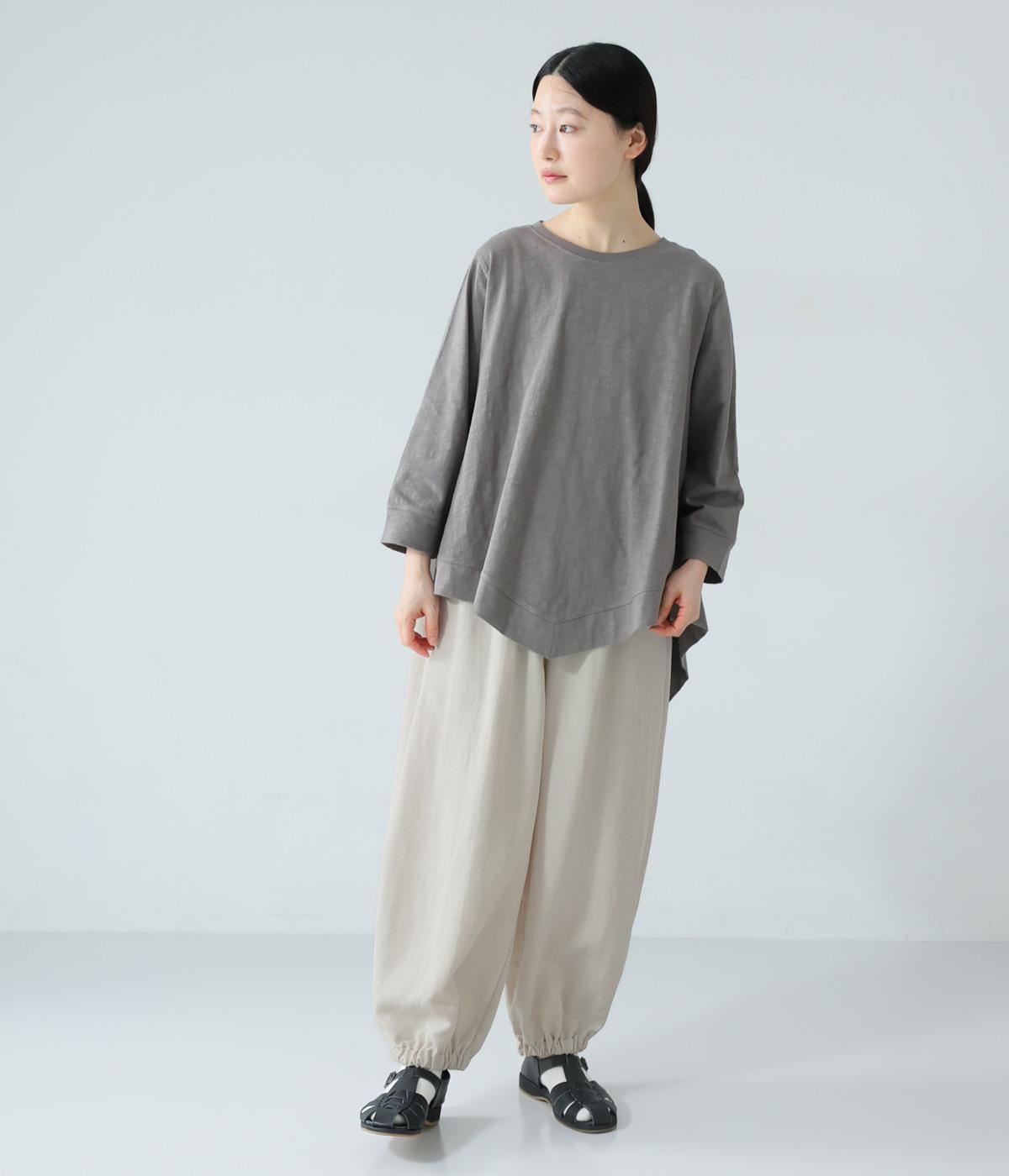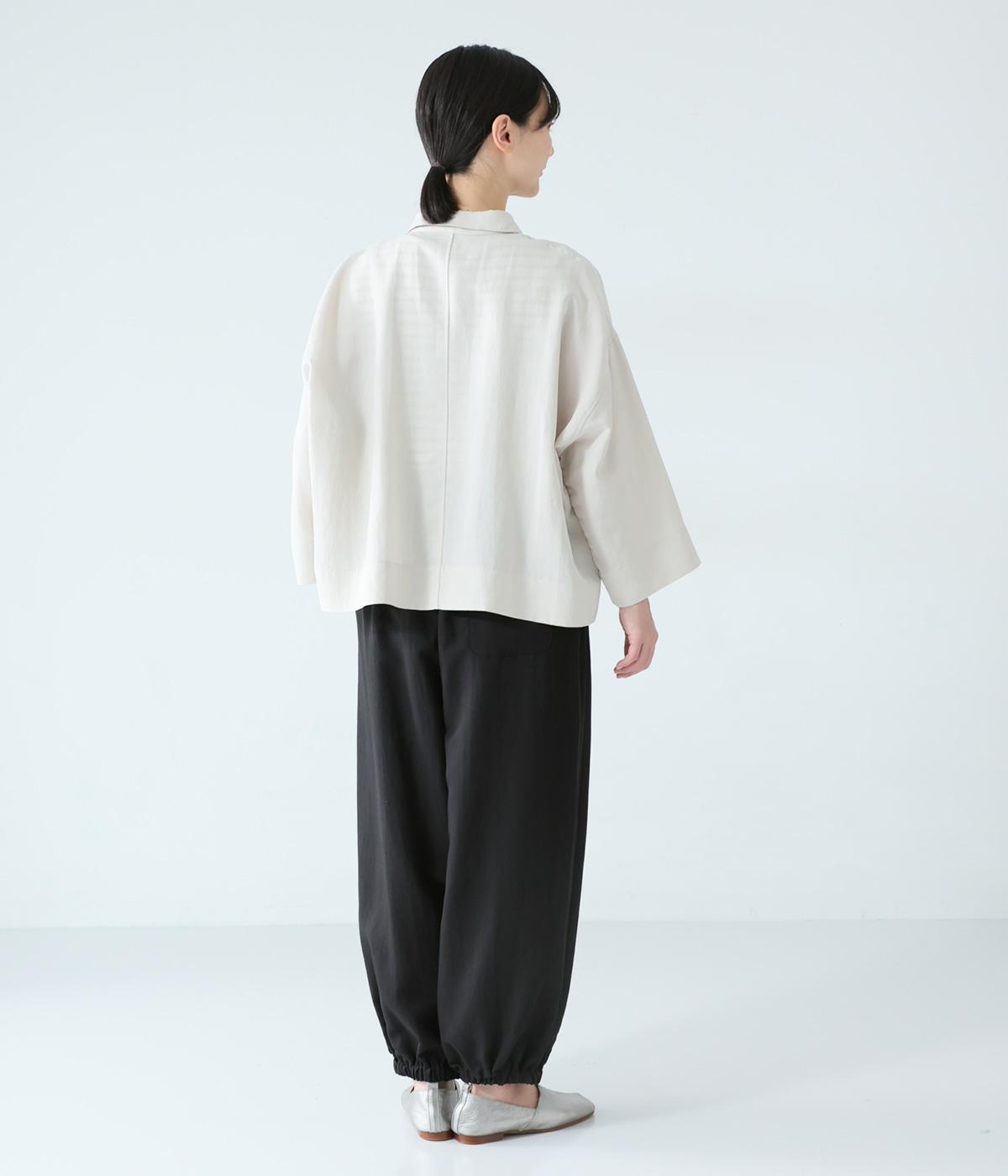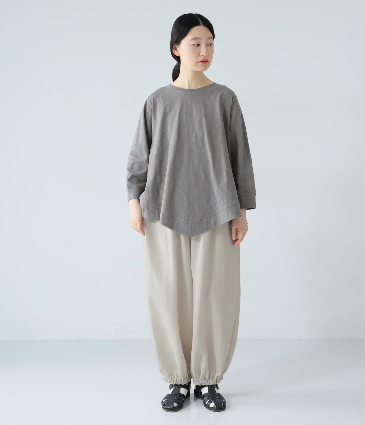 ギャザーによる陰影が表情にニュアンスを添えるパンツです。ほどよく丸みのあるシルエットが自然な立体感をつくり、軽やかな動きをプラス。ウエストは総ゴム仕様で、リラックス感のある穿き心地に仕上げています。