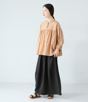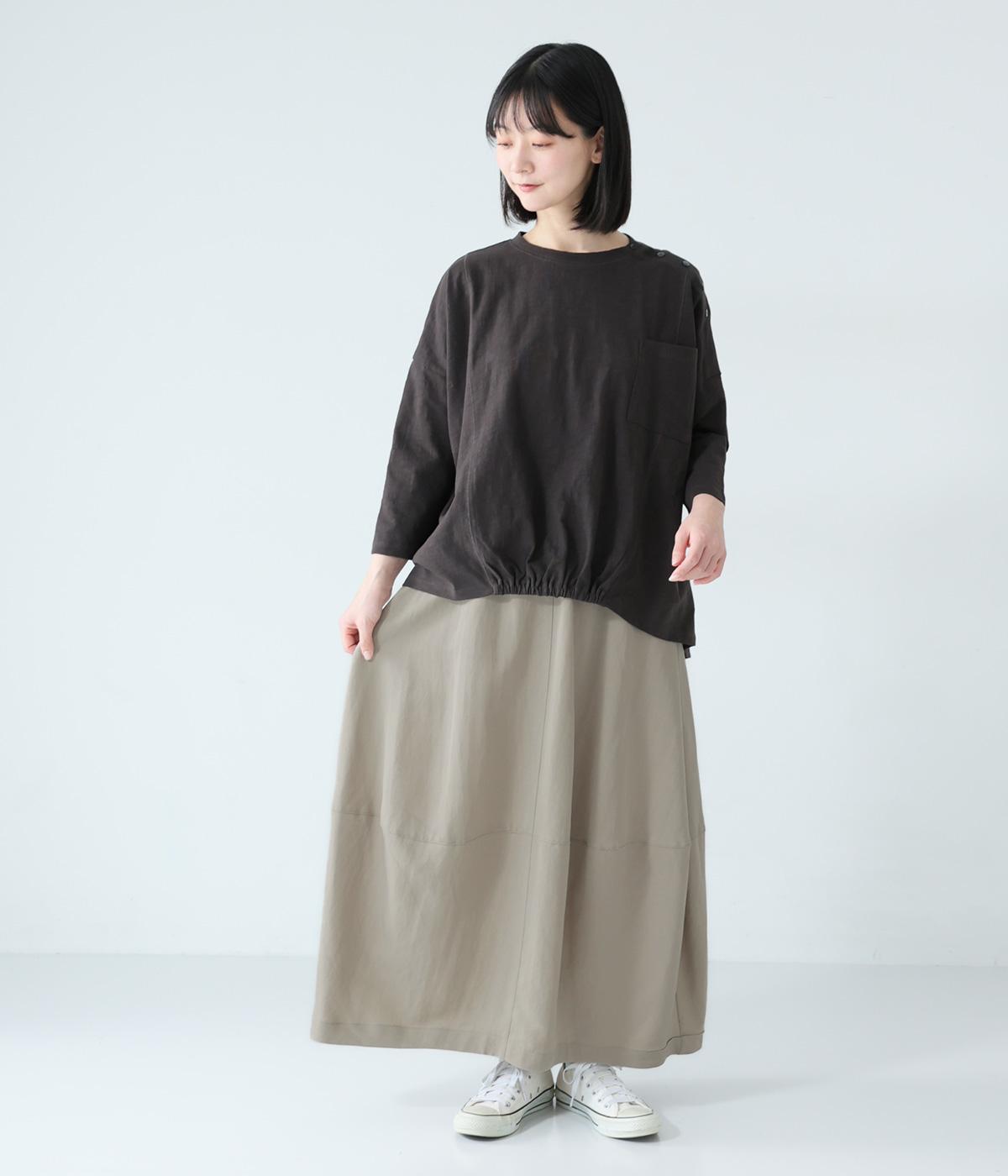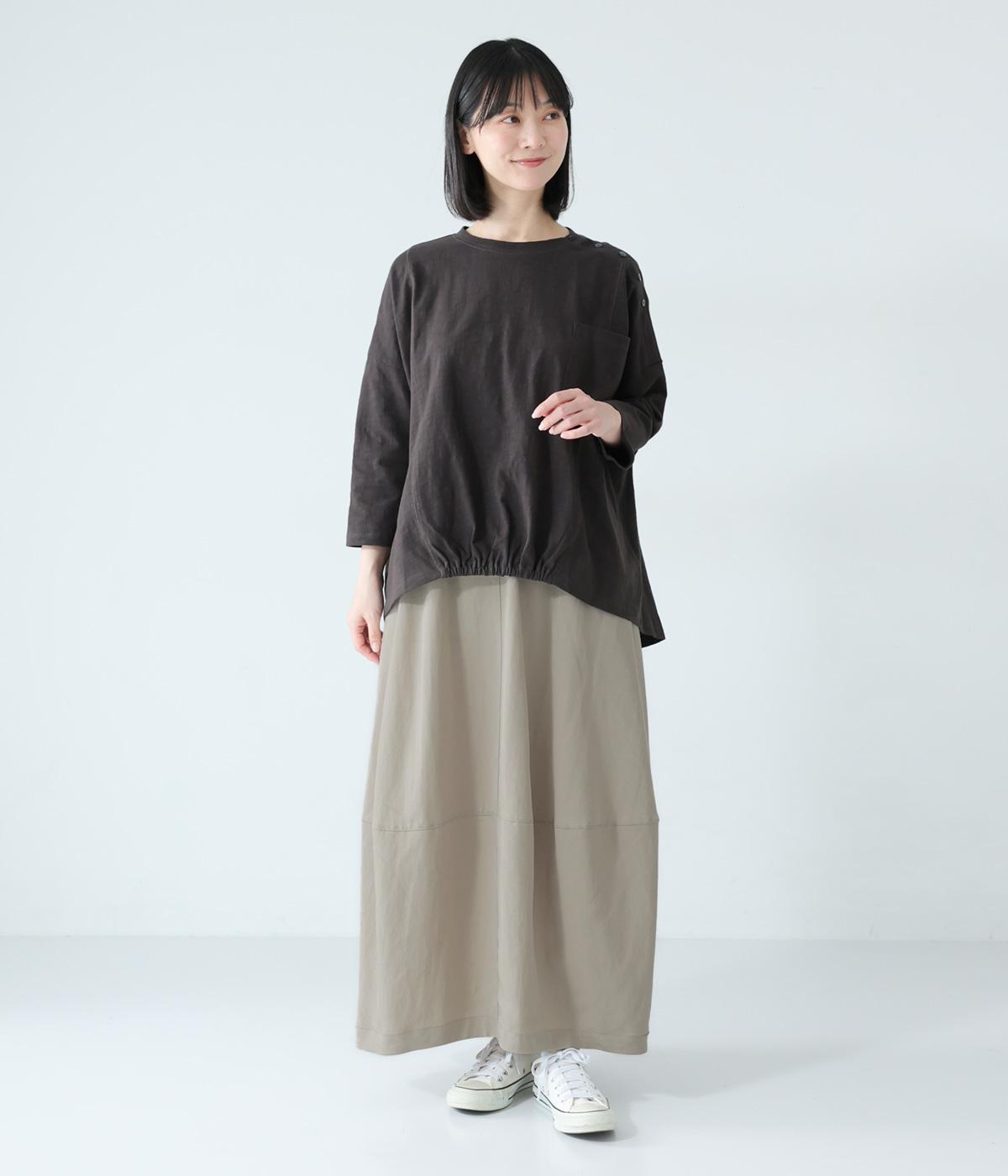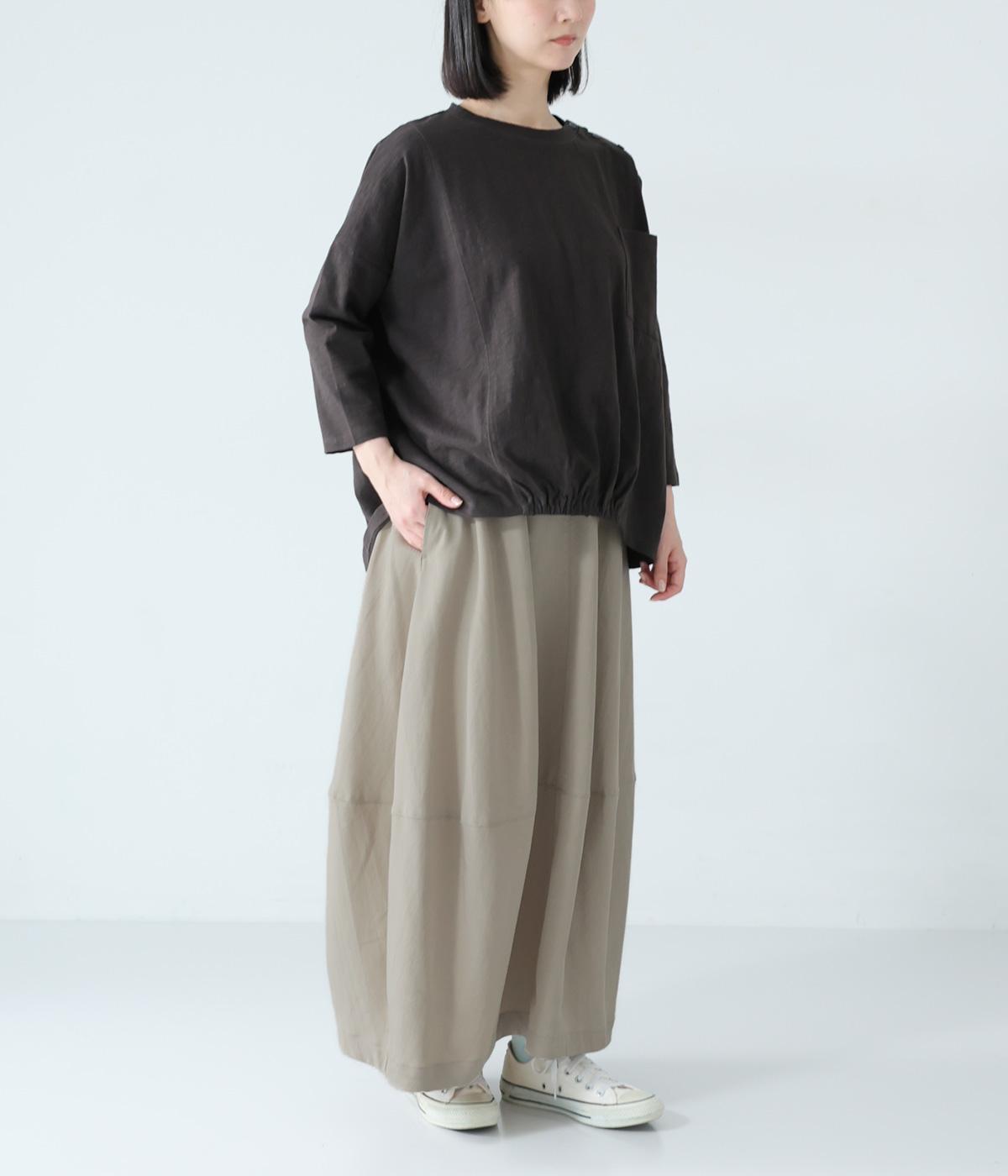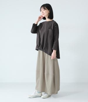 ほどよいボリュームのコクーンシルエットに、切り替えラインがさりげないアクセントを添えます。やわらかな立体感がやさしい雰囲気を生み、ウエストは総ゴム仕様でリラックス感のある穿き心地に仕上げました。
