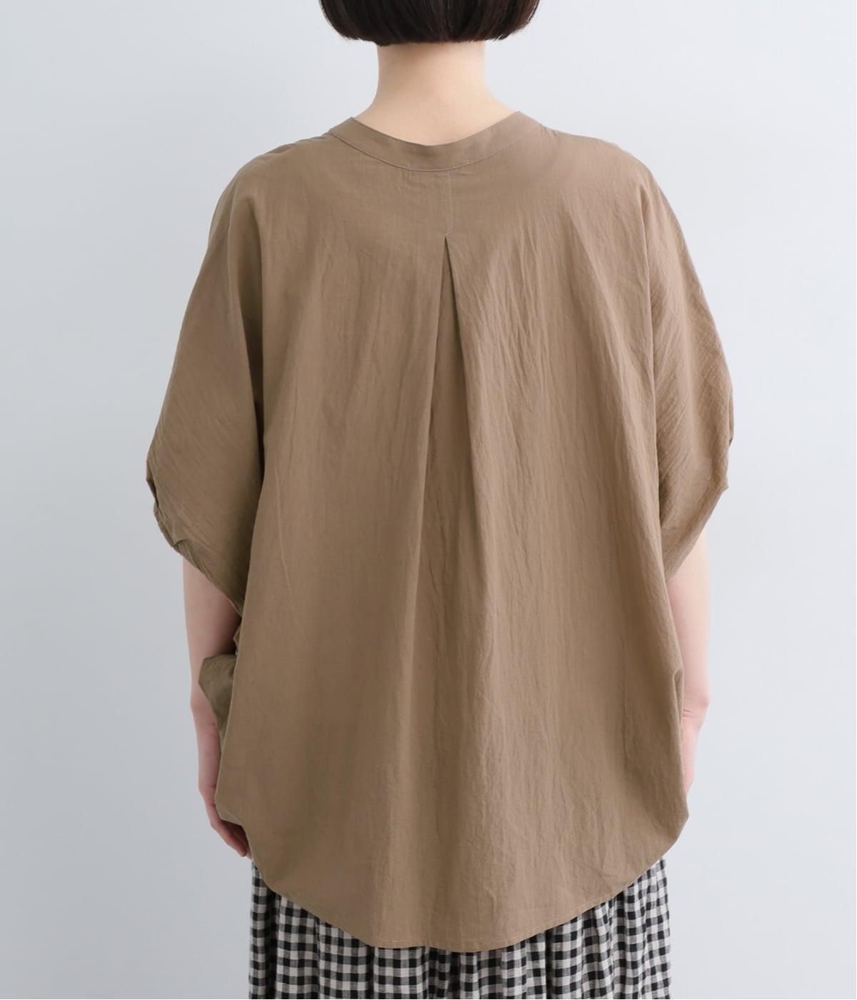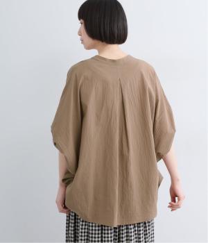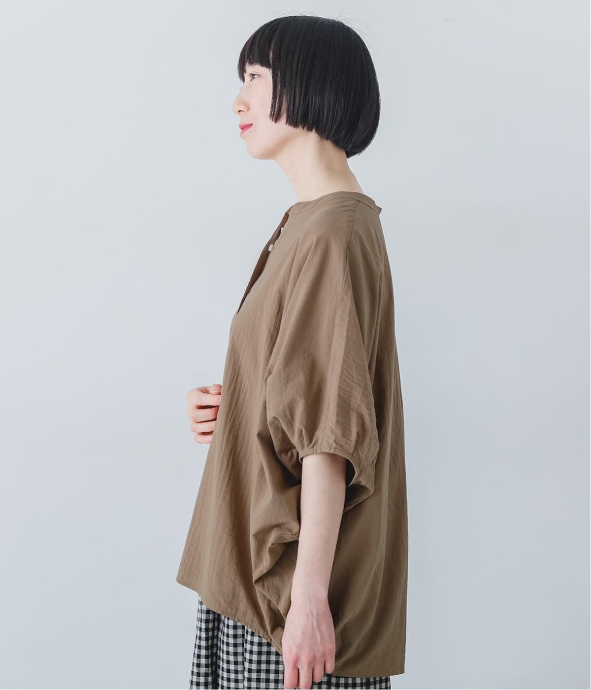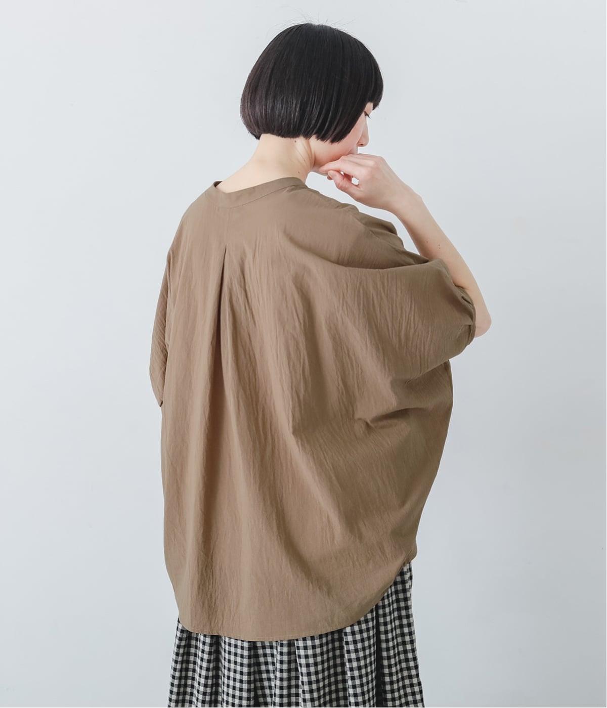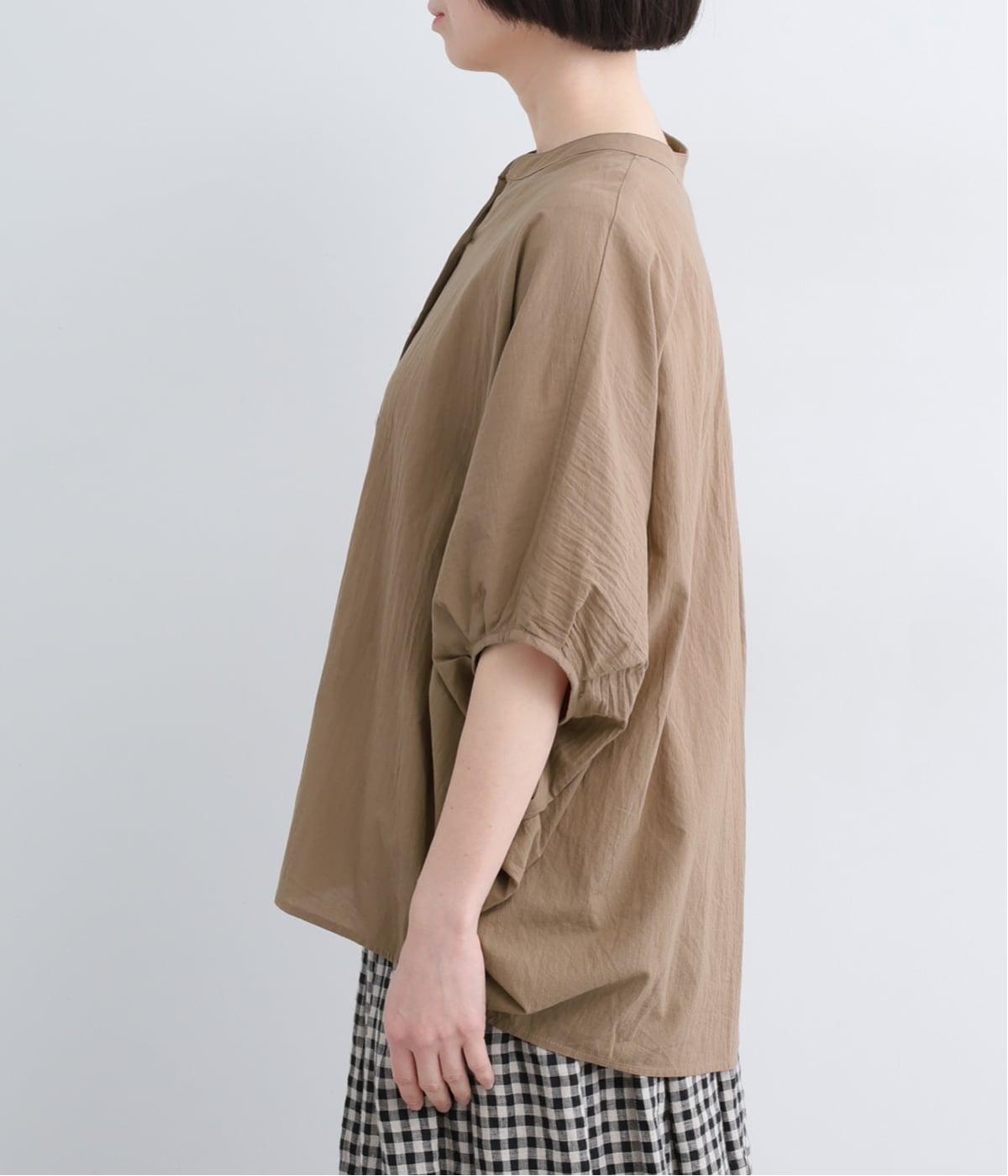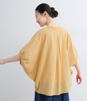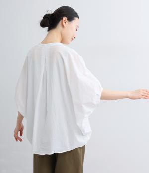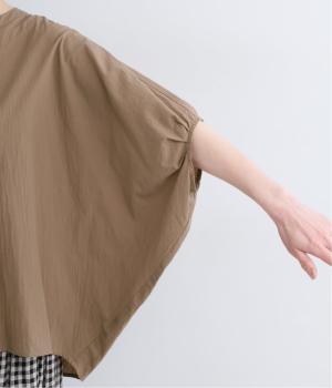 【素材】UVカット加工を施したコットン生地を使用。自然なシワ感がナチュラルな風合いを高めます。肌離れのいいさらりとした質感にほどよいふくらみが通気性の良さを確保し、汗ばむ季節も快適です。【デザイン】軽やかな生地感を活かした、ポンチョのようにたっぷりとしたシルエットが特徴的な一枚。タックを寄せた袖口やヘムラインなど丸みのあるデザインがやさしい印象に。スキッパーカラーで顔まわりに抜け感をもたせ、羽織りスタイルも◎。
