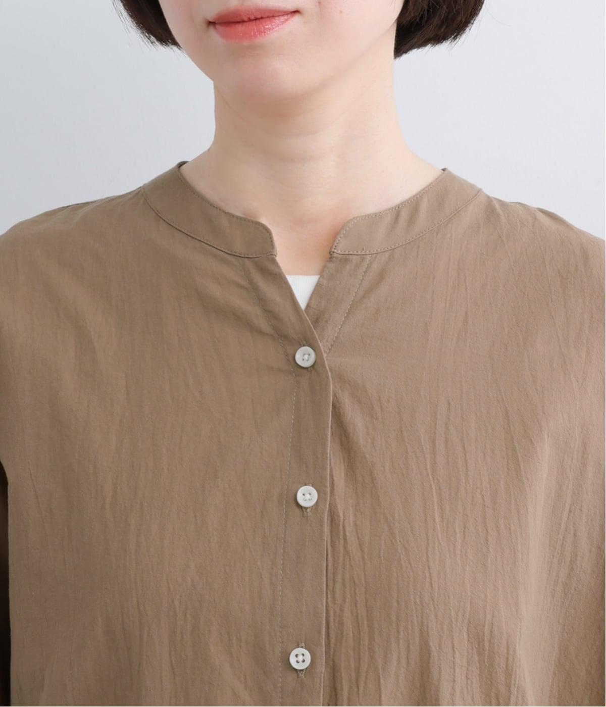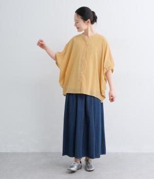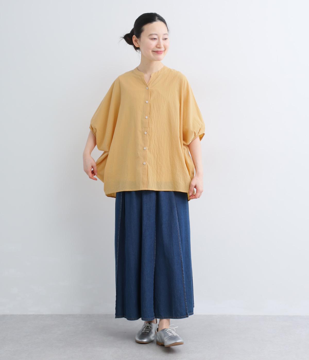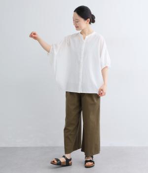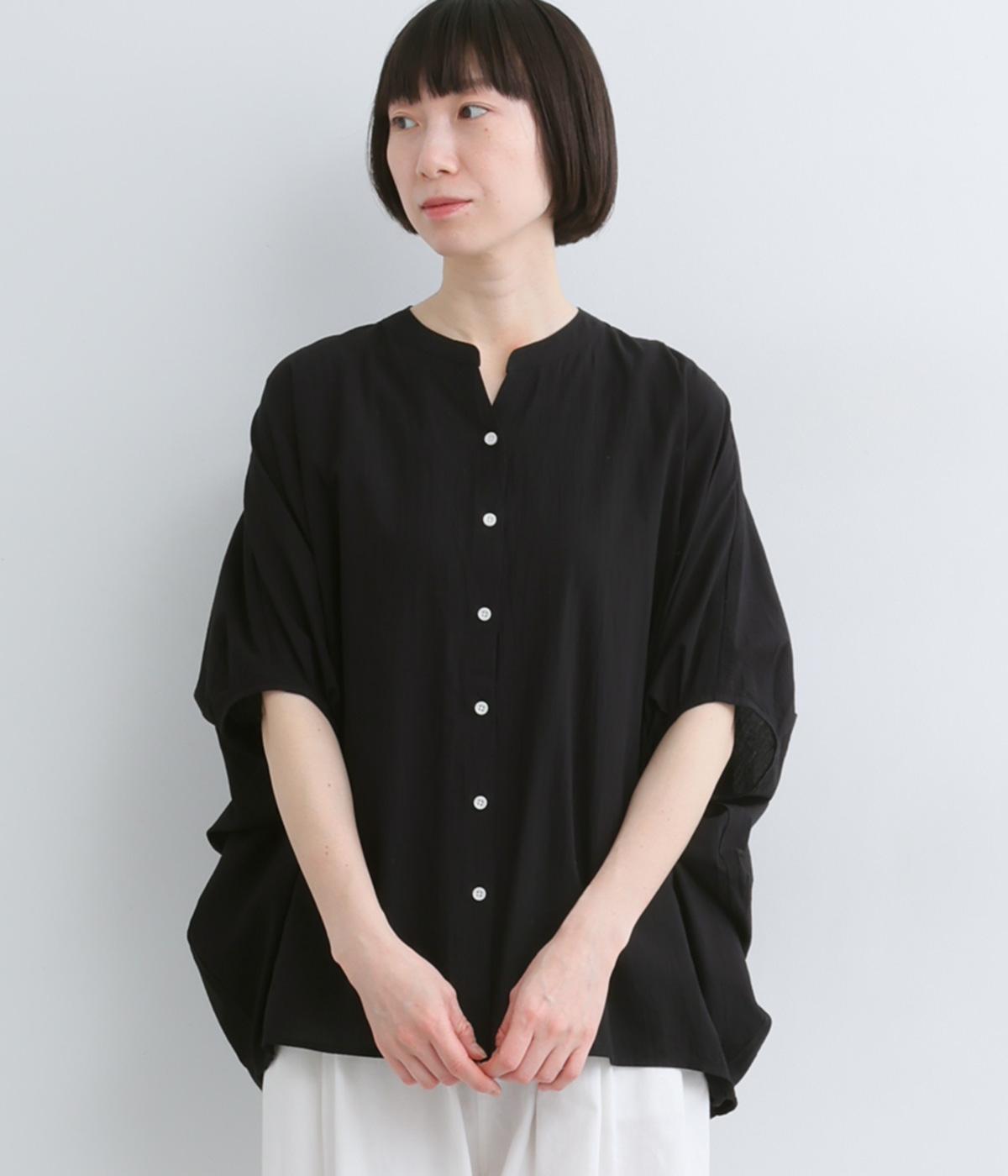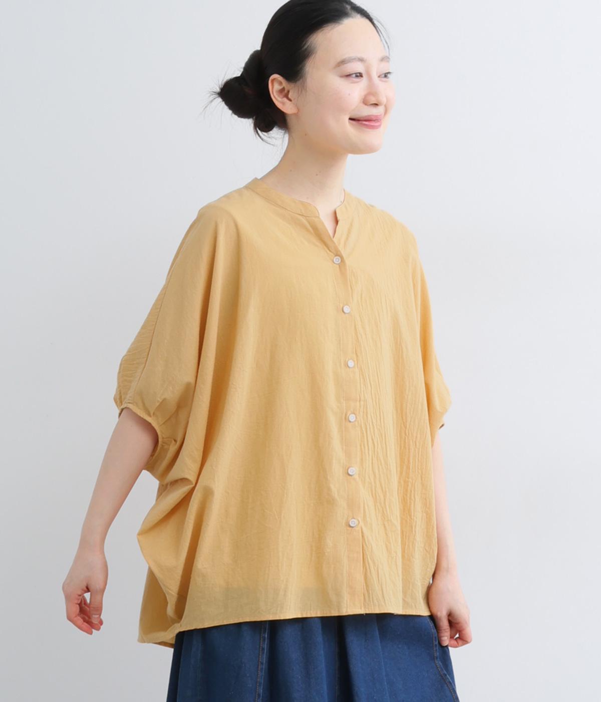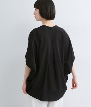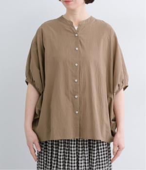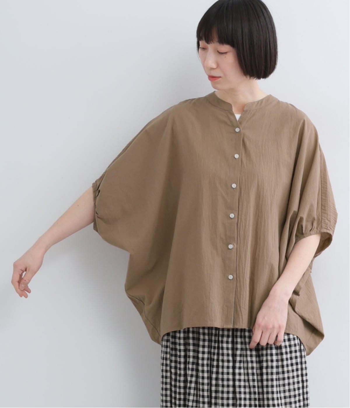 【素材】UVカット加工を施したコットン生地を使用。自然なシワ感がナチュラルな風合いを高めます。肌離れのいいさらりとした質感にほどよいふくらみが通気性の良さを確保し、汗ばむ季節も快適です。【デザイン】軽やかな生地感を活かした、ポンチョのようにたっぷりとしたシルエットが特徴的な一枚。タックを寄せた袖口やヘムラインなど丸みのあるデザインがやさしい印象に。スキッパーカラーで顔まわりに抜け感をもたせ、羽織りスタイルも◎。