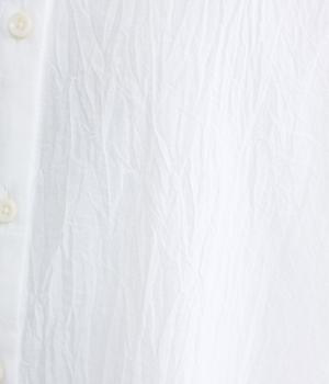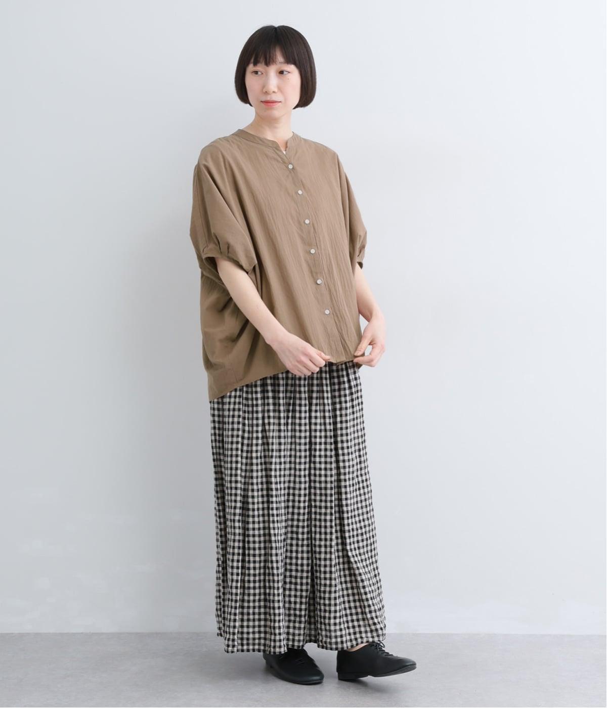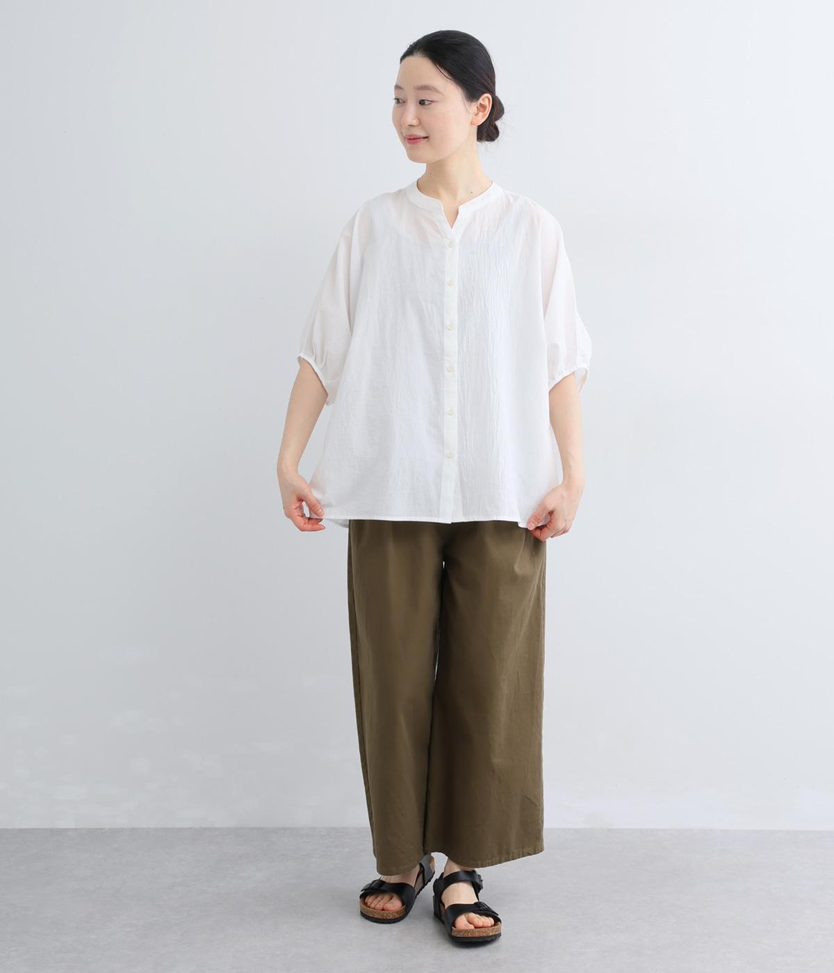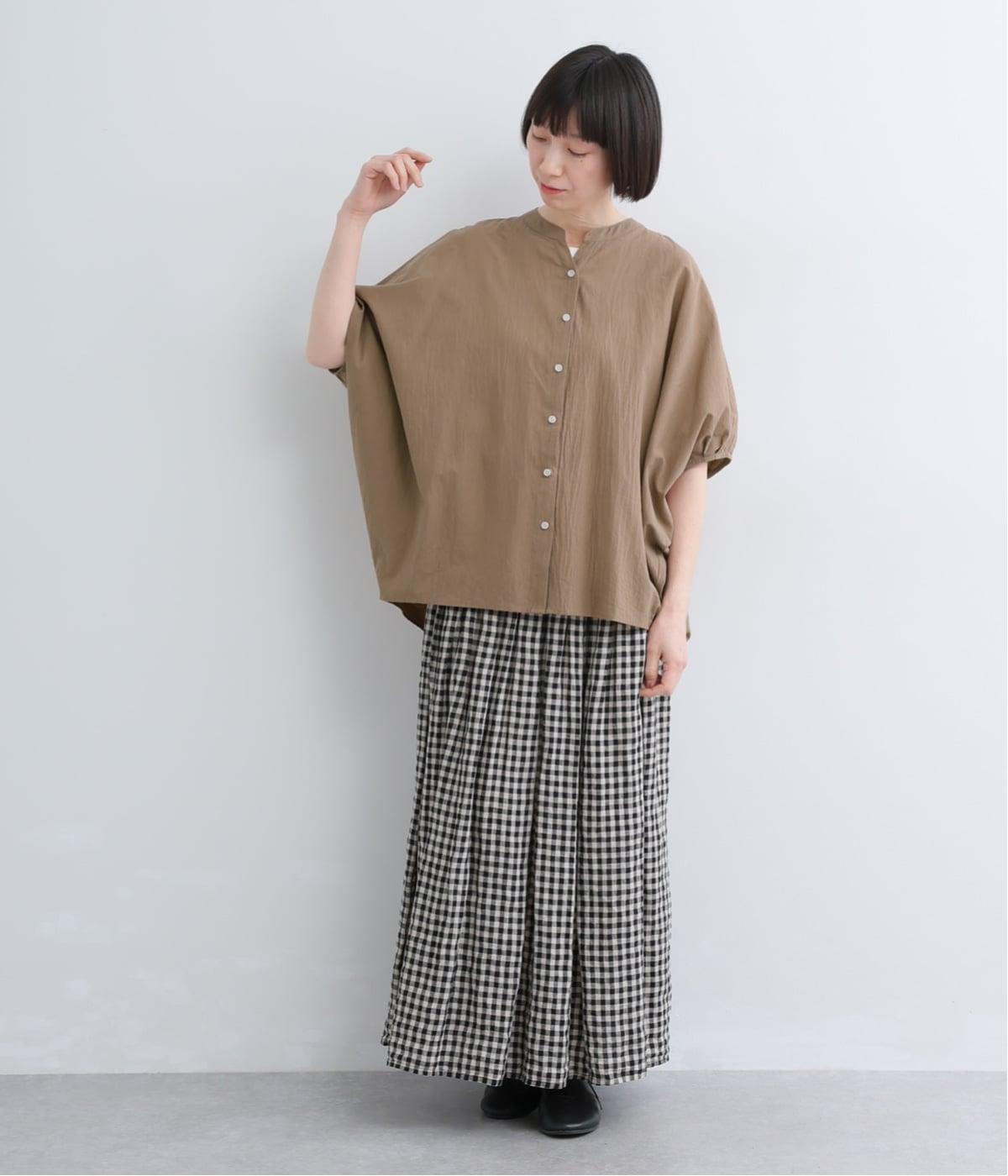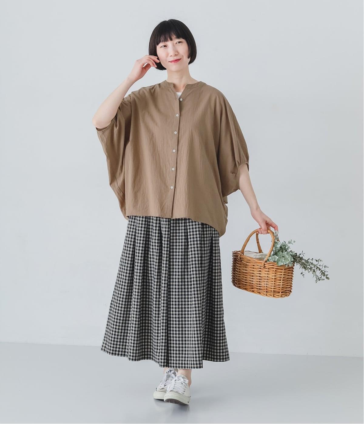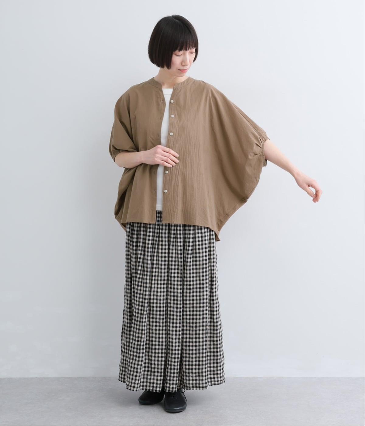 【素材】UVカット加工を施したコットン生地を使用。自然なシワ感がナチュラルな風合いを高めます。肌離れのいいさらりとした質感にほどよいふくらみが通気性の良さを確保し、汗ばむ季節も快適です。【デザイン】軽やかな生地感を活かした、ポンチョのようにたっぷりとしたシルエットが特徴的な一枚。タックを寄せた袖口やヘムラインなど丸みのあるデザインがやさしい印象に。スキッパーカラーで顔まわりに抜け感をもたせ、羽織りスタイルも◎。
