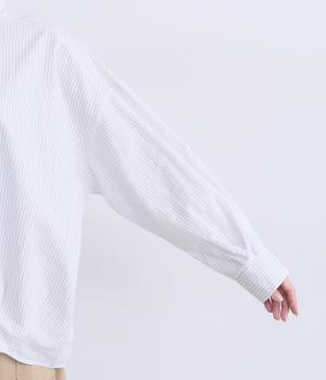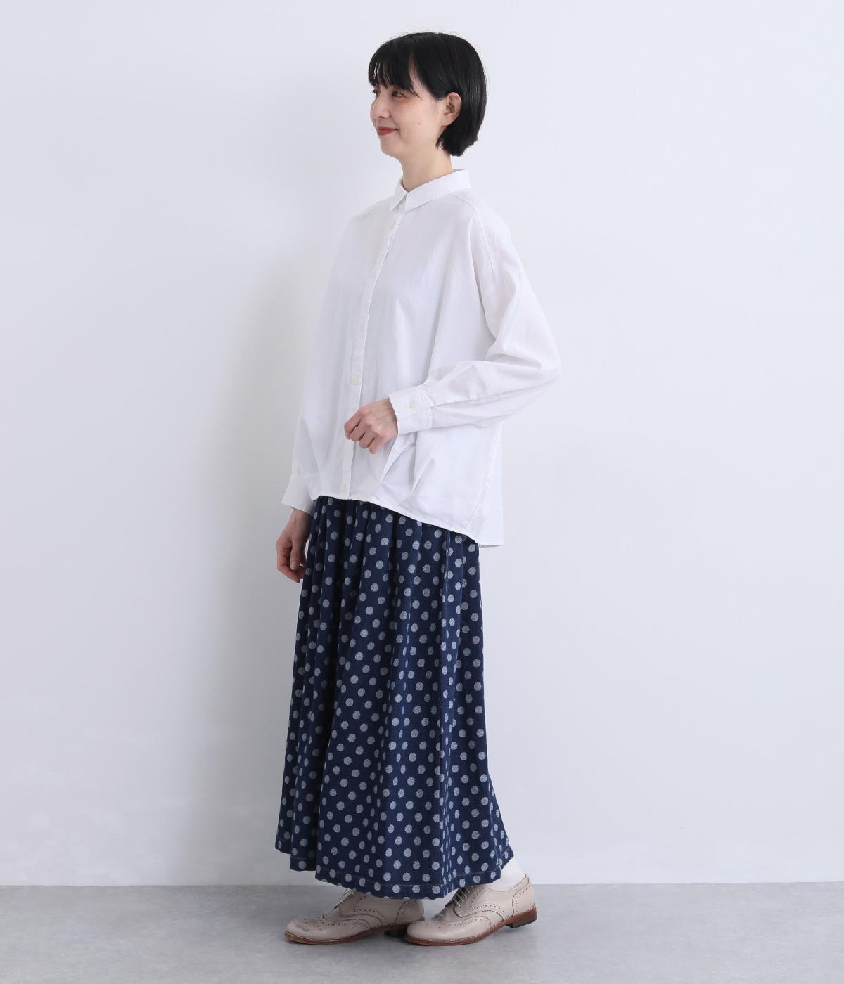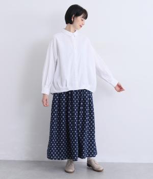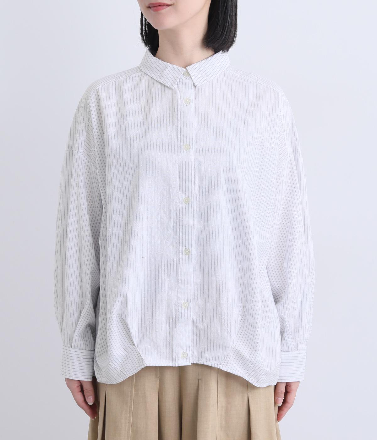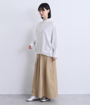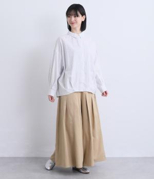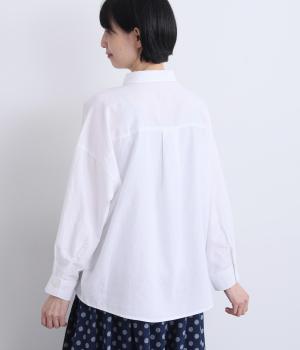 裾にダーツを入れてふくらみをもたせた前デザインが特徴的な一枚。袖もタックでふわりと立体感をつけ、女性らしいやさしい雰囲気のシャツスタイルが叶います。着丈は前後差をつけているので横姿もきれい見え。