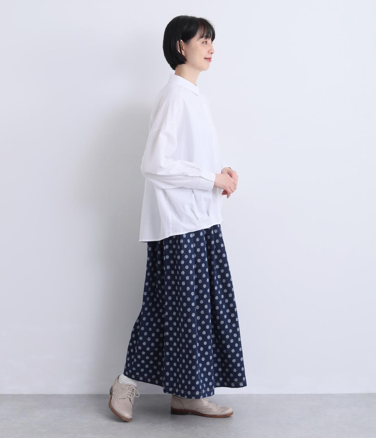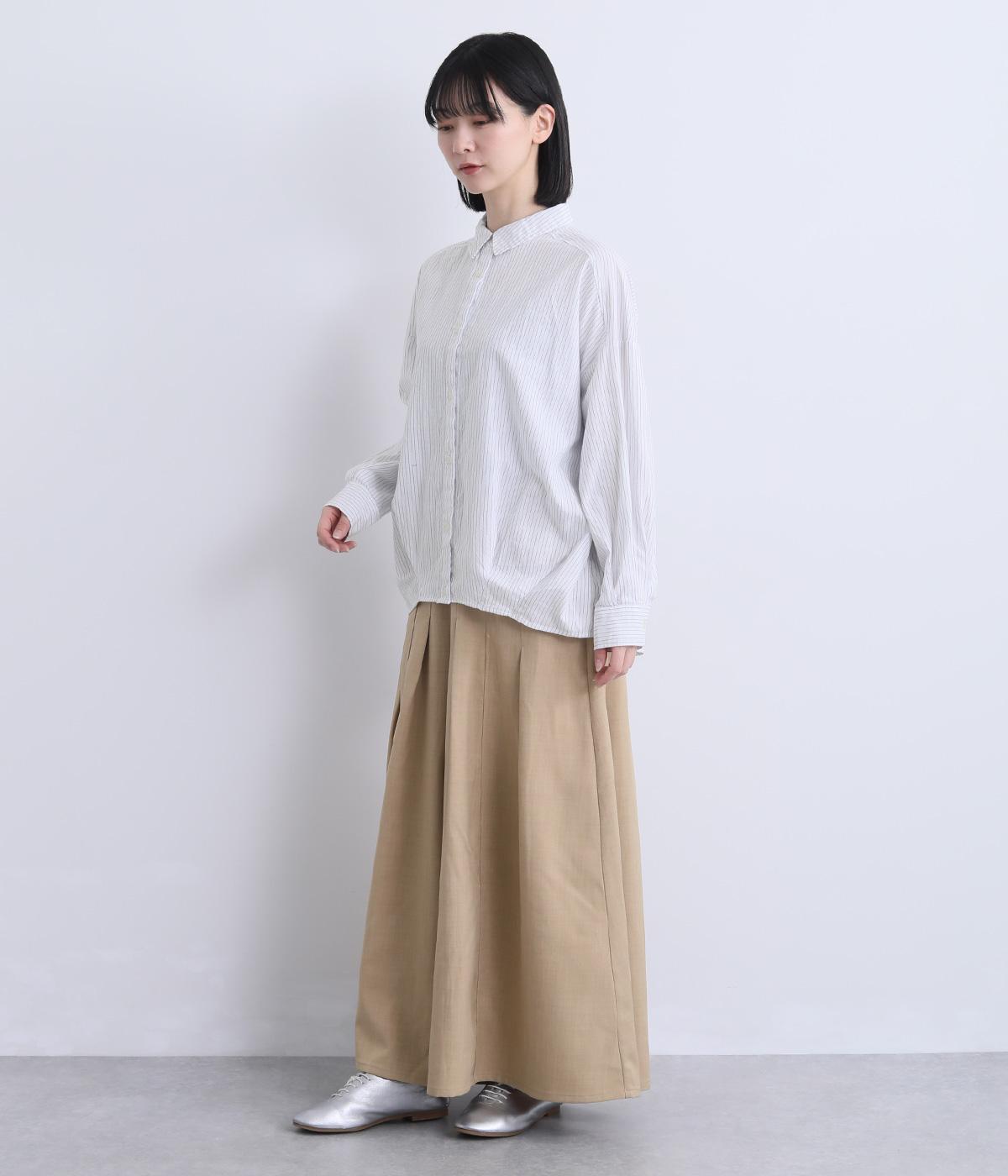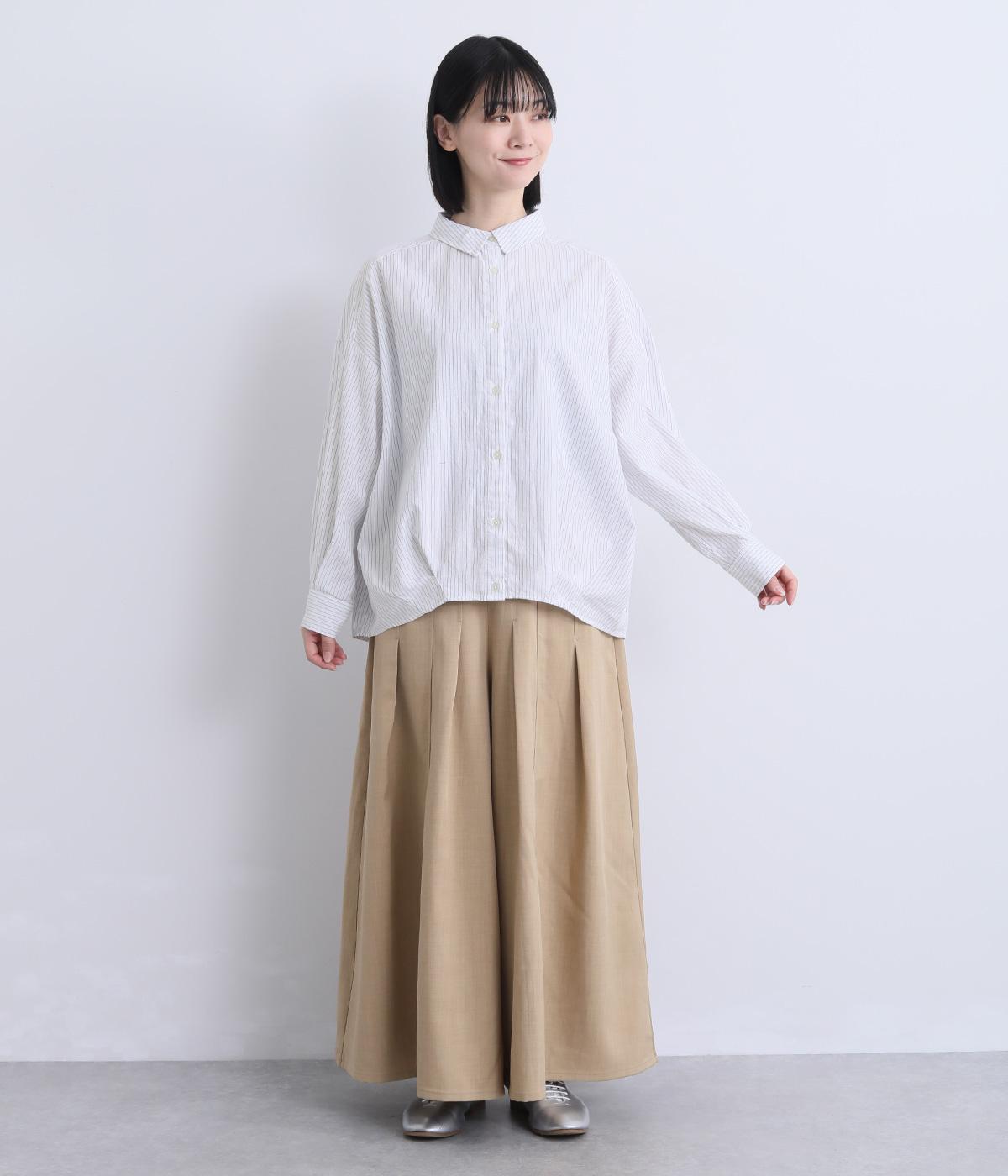 裾にダーツを入れてふくらみをもたせた前デザインが特徴的な一枚。袖もタックでふわりと立体感をつけ、女性らしいやさしい雰囲気のシャツスタイルが叶います。着丈は前後差をつけているので横姿もきれい見え。