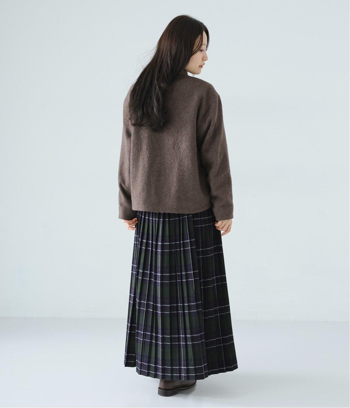 <イエローチェック>は、ゆるっとしたニットを合わせてラフなスタイリングに。ボリュームのあるトップスを合わせた着こなしも、細やかなプリーツが品良く仕上げてくれます。