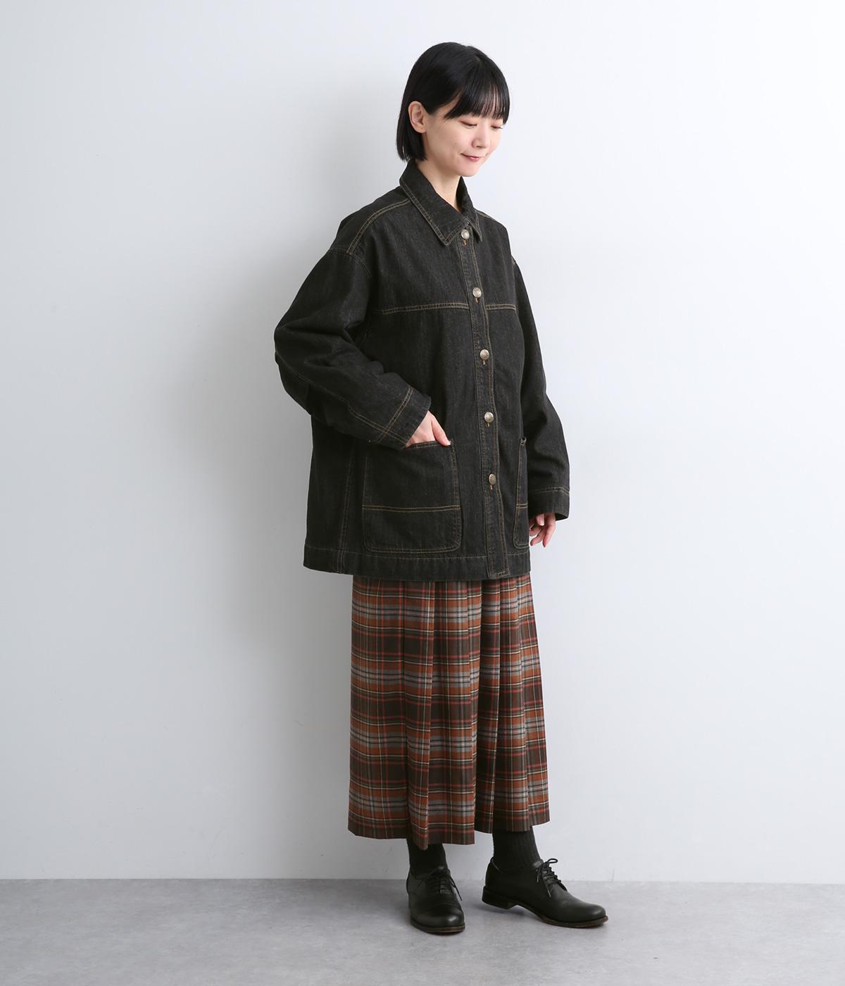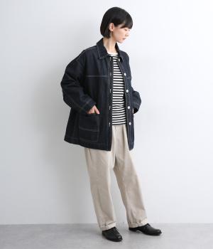 カジュアルダウンしたいときにぴったりのデニムコート。ヒップが隠れるくらいのオーバーサイズなので体のラインを拾いにくく、シルエット全体をきれいに整えてくれるデザインです。アイラインスカートと合わせて女性らしさをミックスする着こなしもおすすめ。