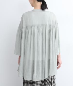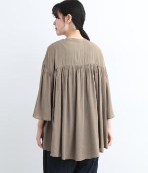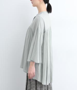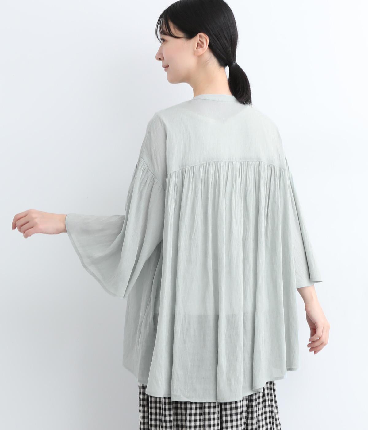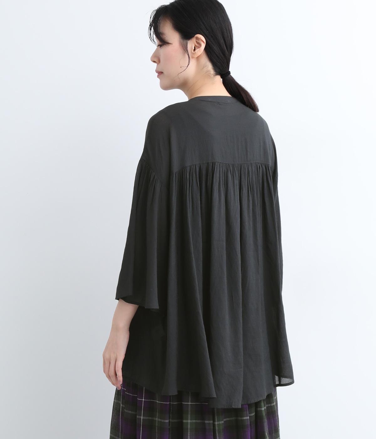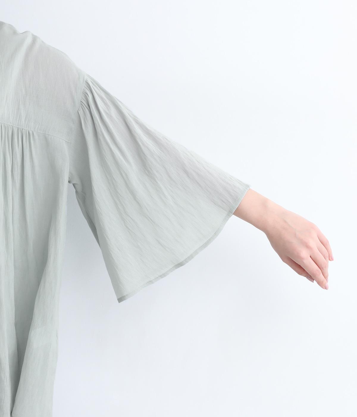 ふわりと広がるフレアスリーブが、コーディネートに動きを添えるチュニックです。前後に切り替えギャザーをあしらい、ドレープたっぷりのやわらかなシルエットに仕上げました。前をあけて、タンクトップなどに羽織って合わせるのもおすすめです。
