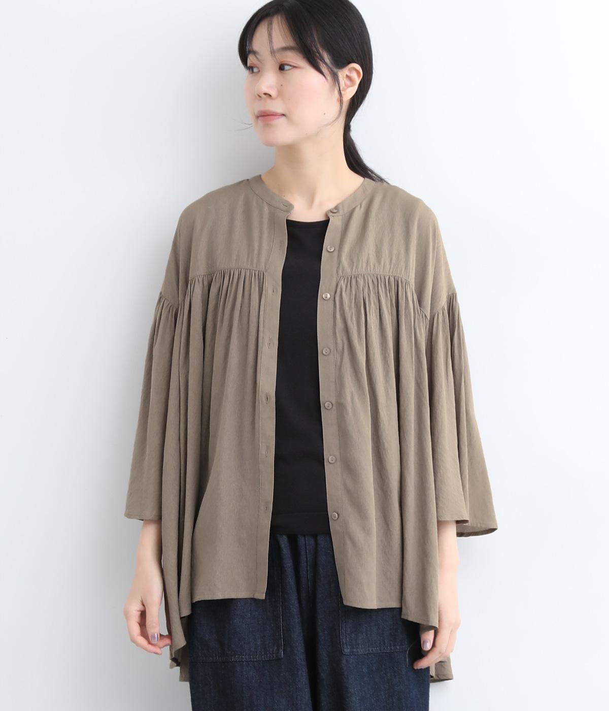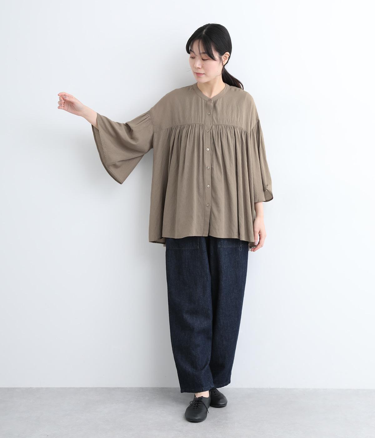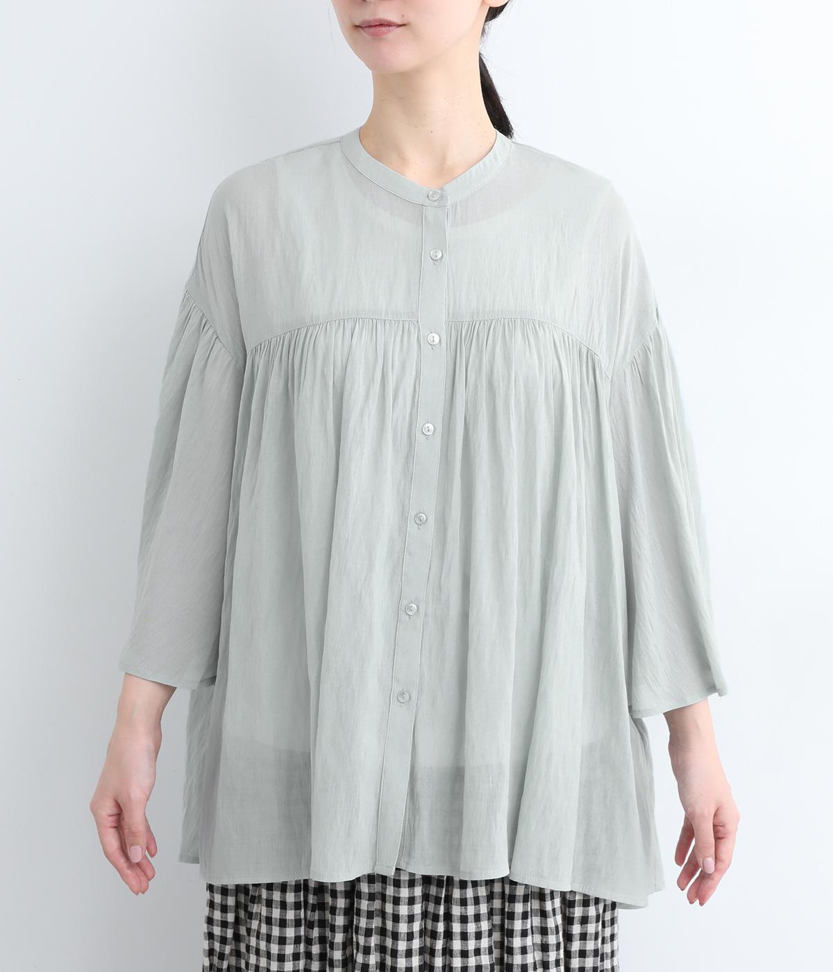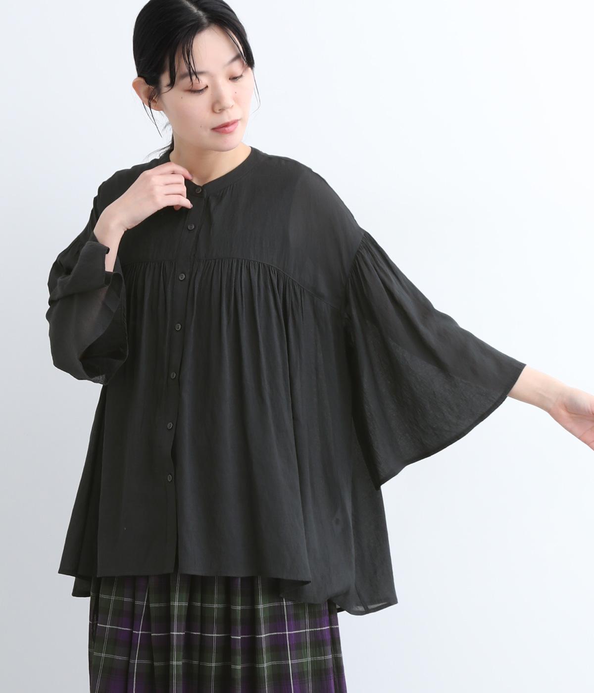 ふわりと広がるフレアスリーブが、コーディネートに動きを添えるチュニックです。前後に切り替えギャザーをあしらい、ドレープたっぷりのやわらかなシルエットに仕上げました。前をあけて、タンクトップなどに羽織って合わせるのもおすすめです。