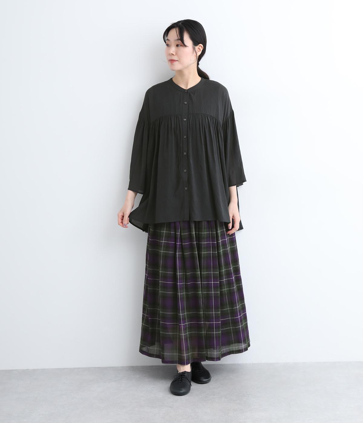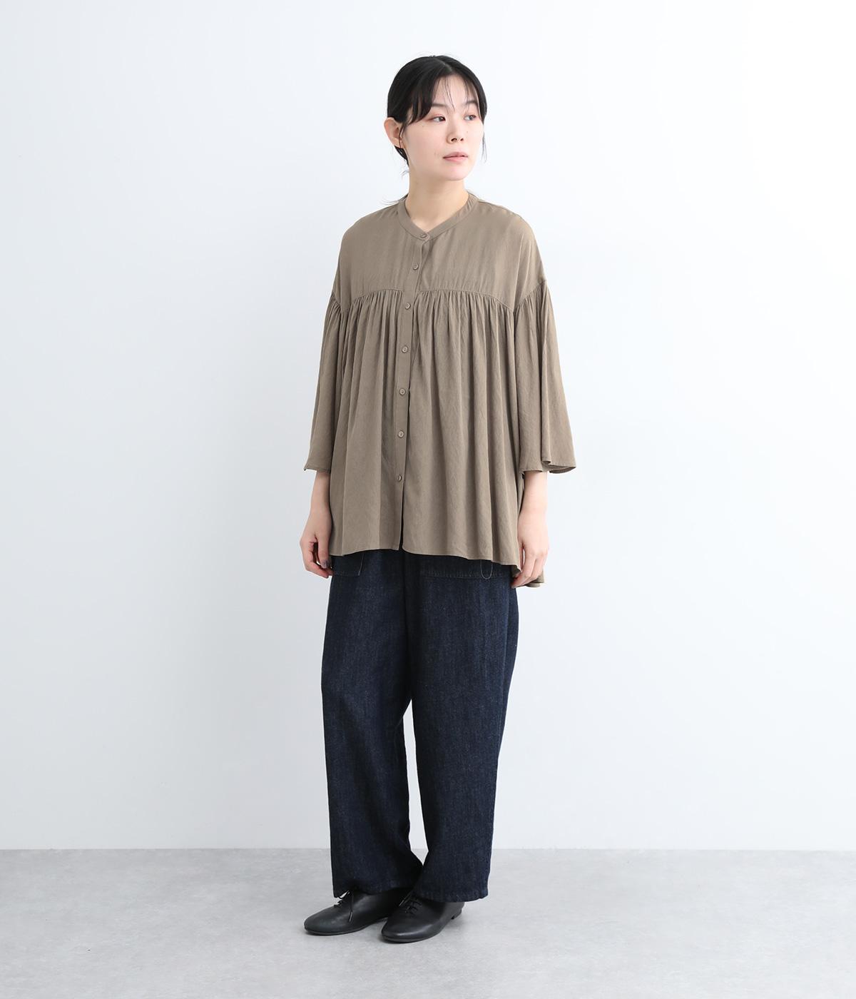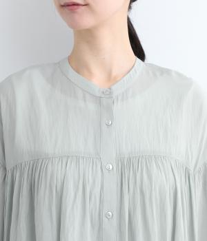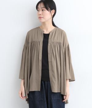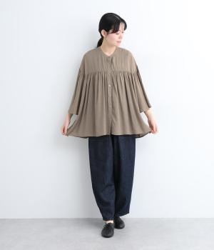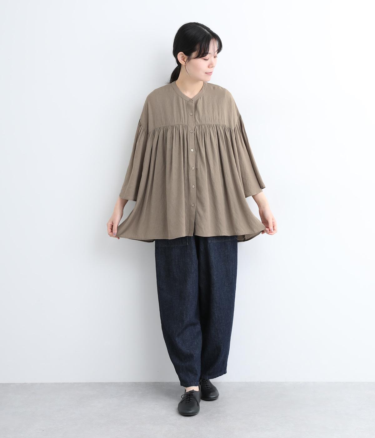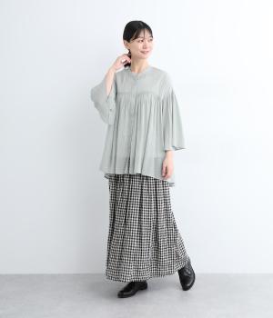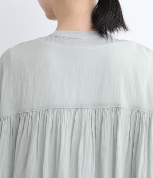 ふわりと広がるフレアスリーブが、コーディネートに動きを添えるチュニックです。前後に切り替えギャザーをあしらい、ドレープたっぷりのやわらかなシルエットに仕上げました。前をあけて、タンクトップなどに羽織って合わせるのもおすすめです。