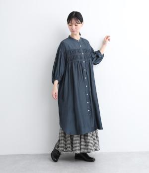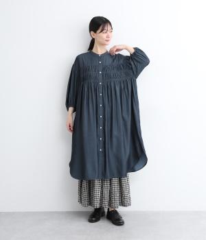 胸元にたっぷりとあしらったシャーリングによって立体的で、動きのあるシルエットを表現。袖口にゴムを通したボリューム袖も大人のかわいさを引き立てるポイントに。前あきで羽織って合わせるのもおすすめな一枚です。