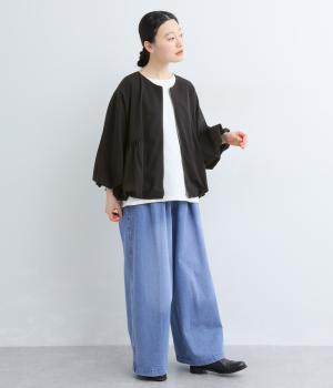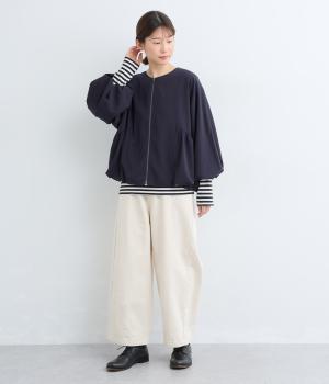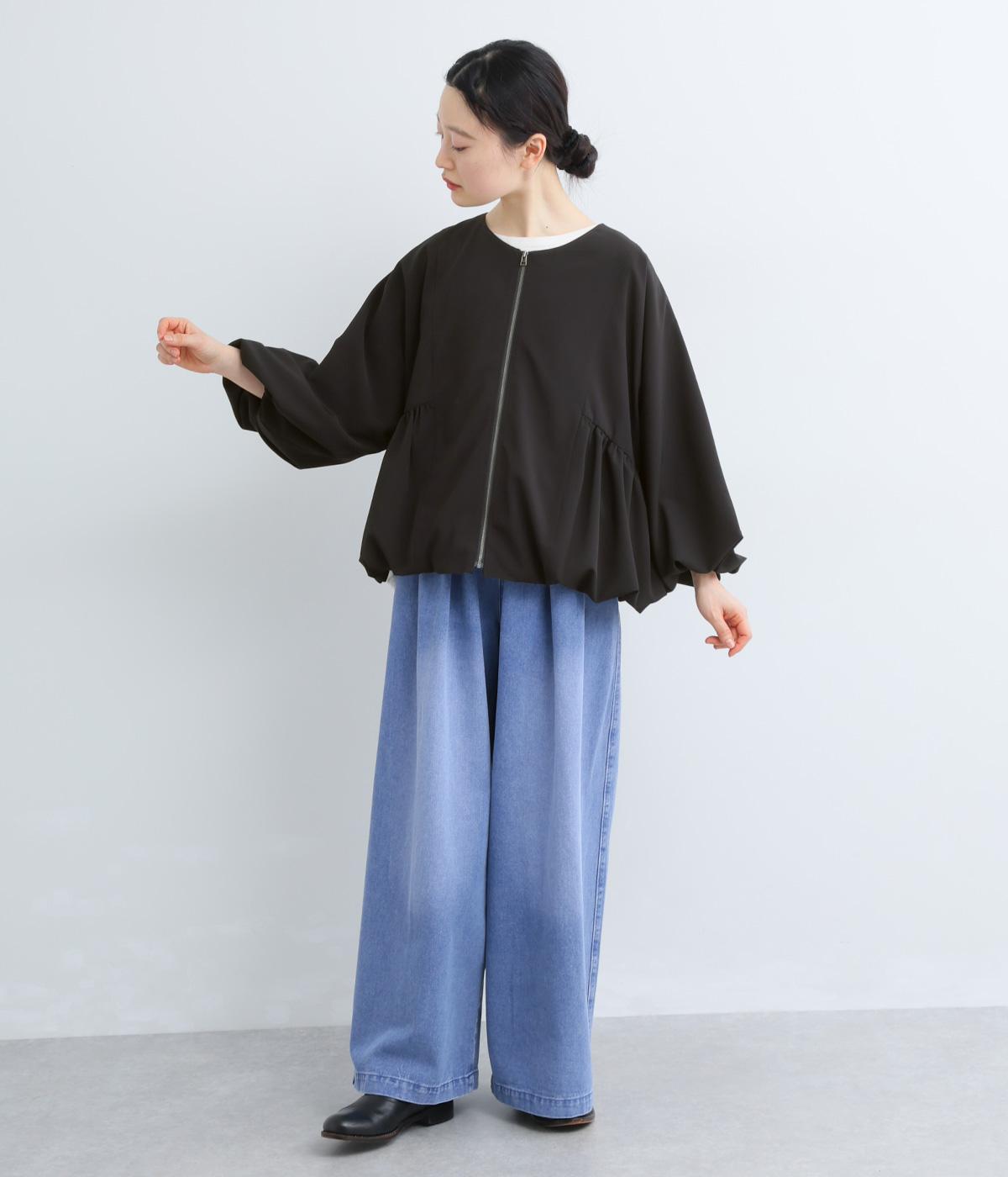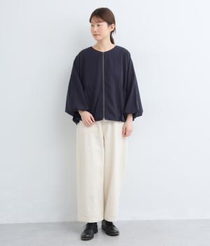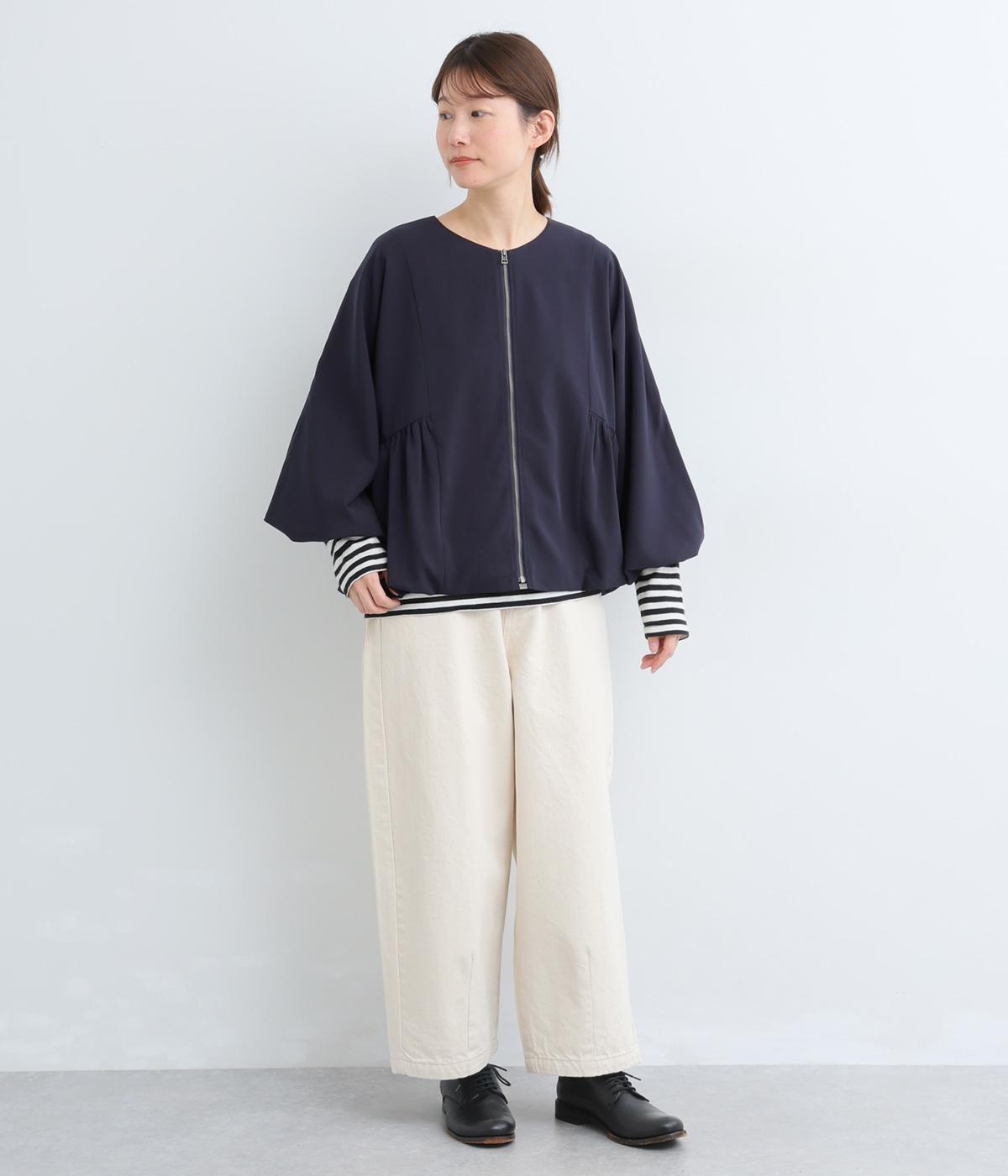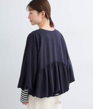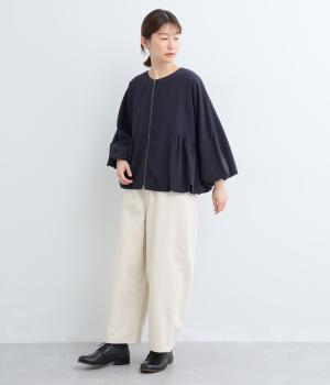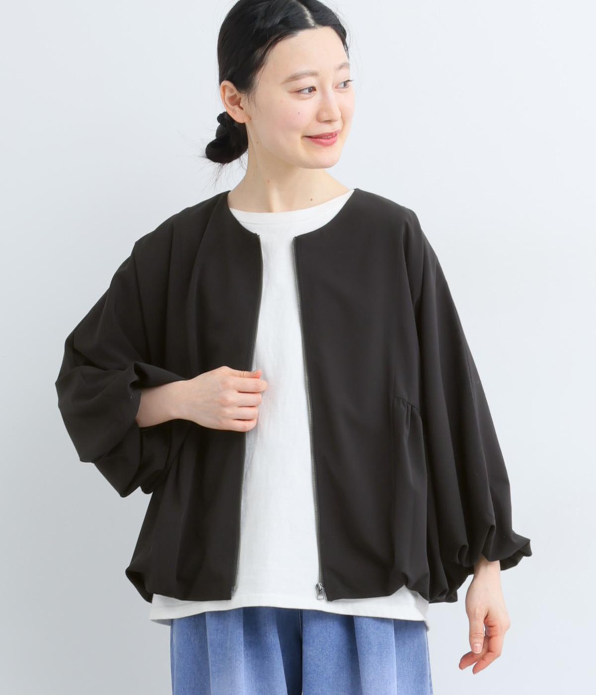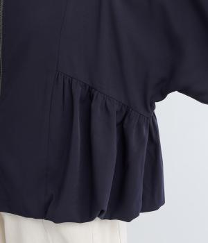 裾と袖口にゴムを配して、ふんわりとバルーンシルエットを描くジャケットです。優雅なドレープが華やかな印象を与えつつ、ノーカラーですっきりとバランスよく仕上げました。パンツにもスカートにも合わせやすい着丈にもこだわりました。