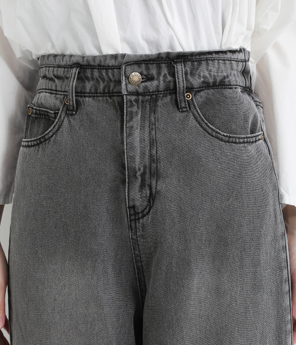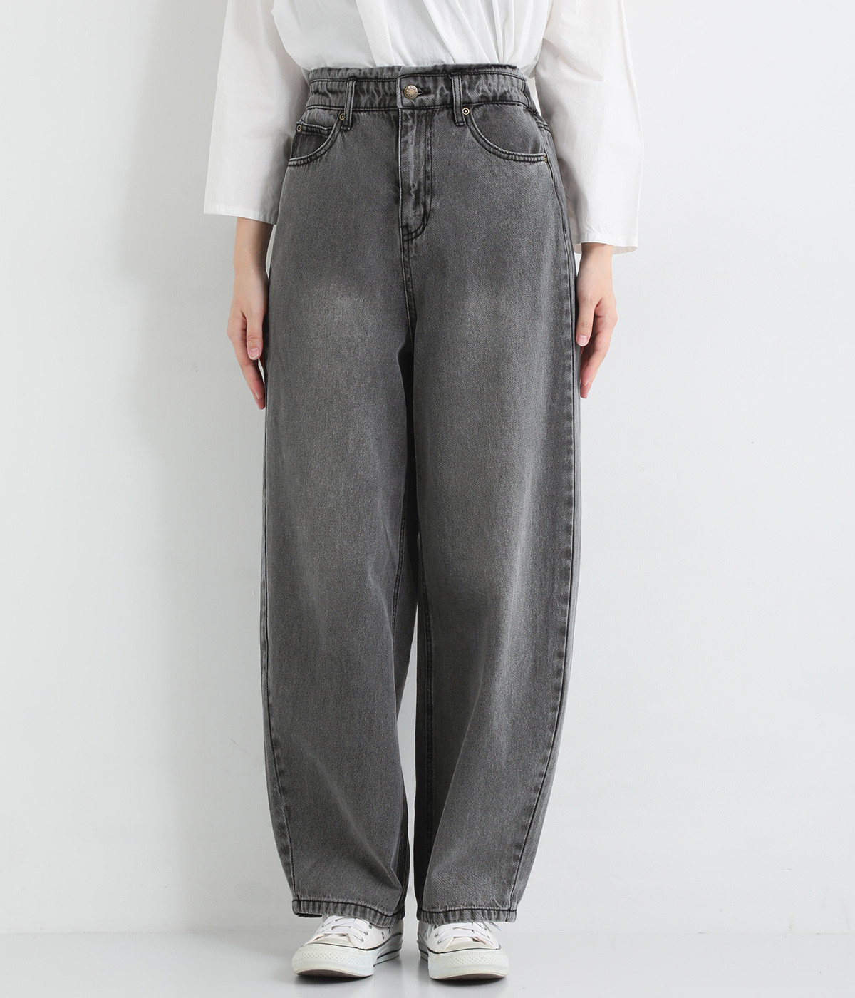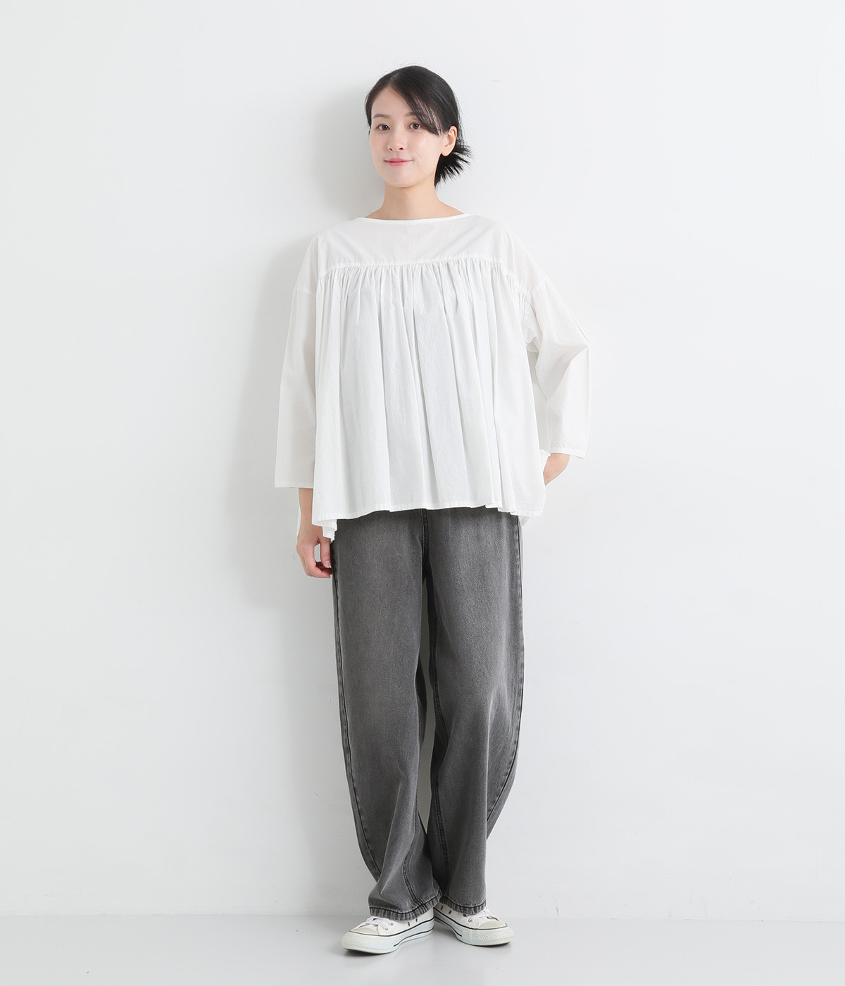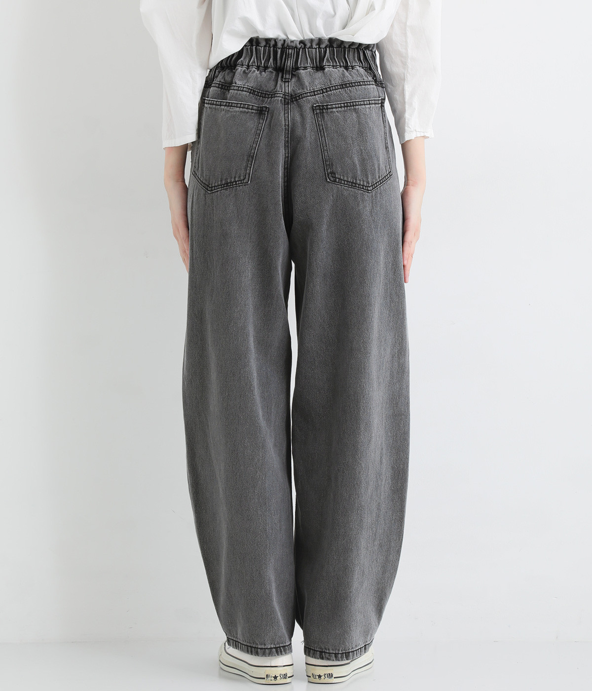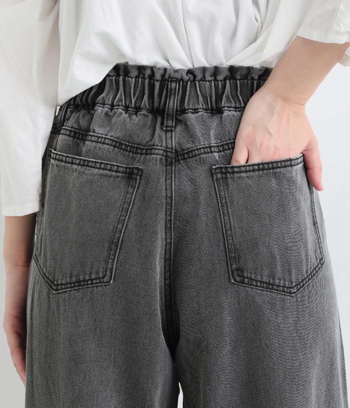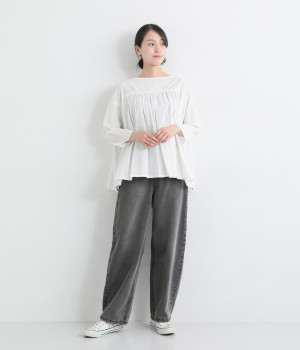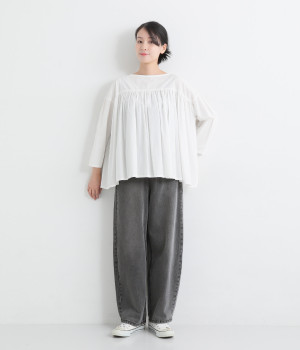 サイドに丸みを出したカーブパンツはナチュラルになり過ぎないよう、きれいに見えるシルエットにこだわっています。ウエスト位置を高めにしたのもポイント。バックウエストのギャザーゴムはギャザーを少なくしてすっきりとさせました。