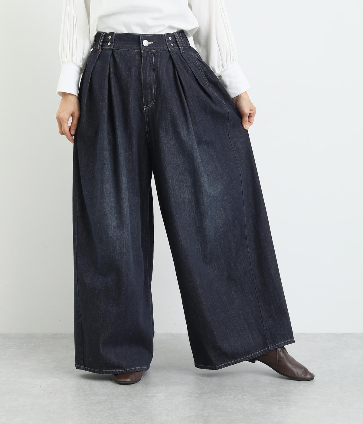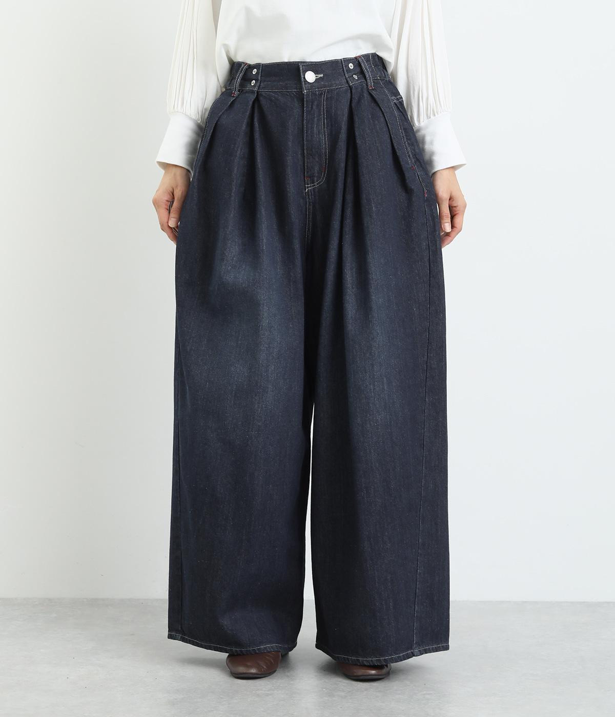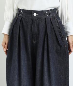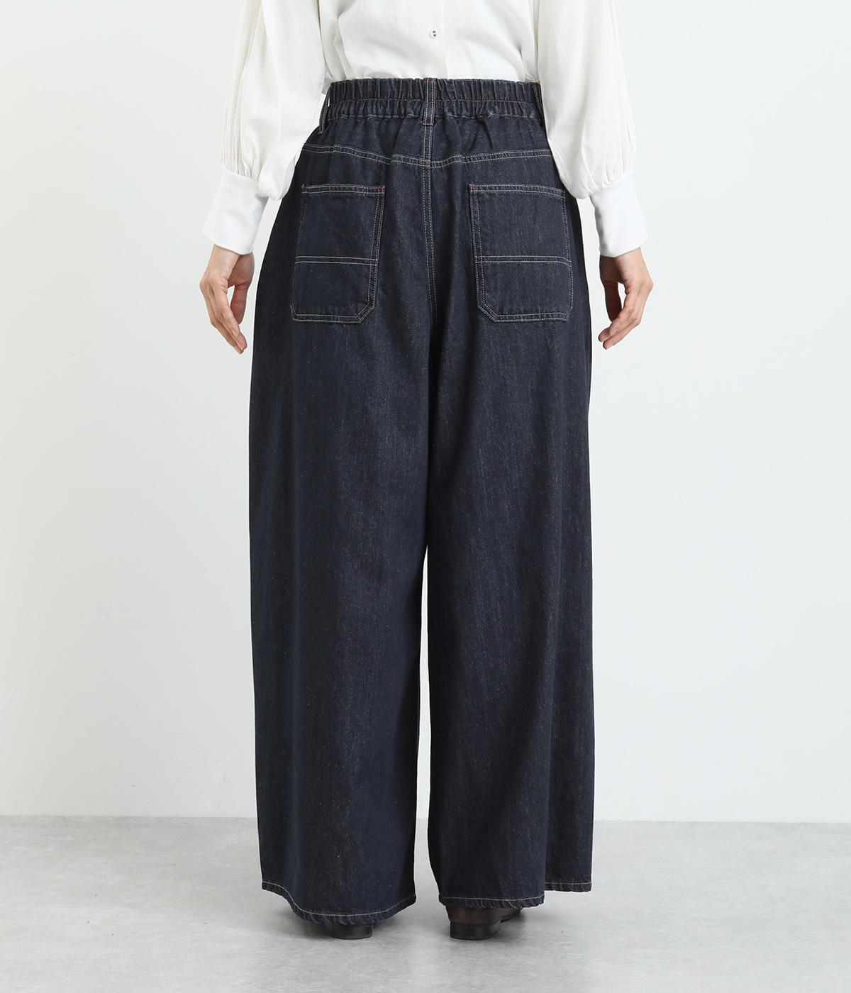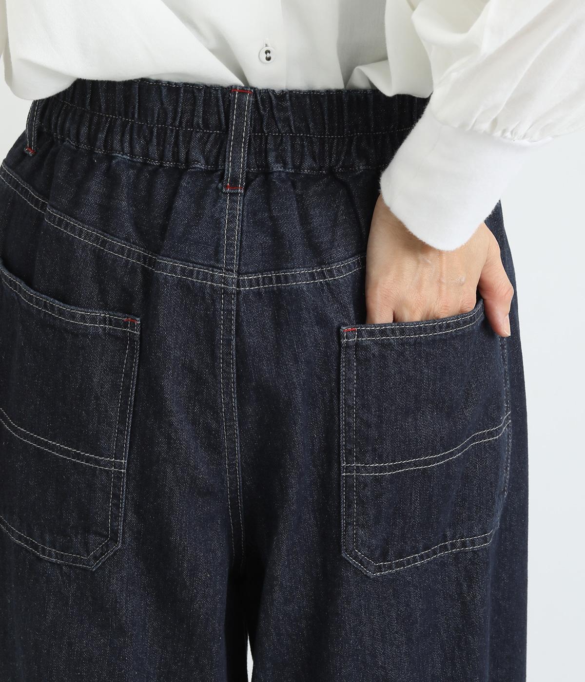 ラフなのに品よく着こなせるデニムのコクーンワイドパンツです。腰まわりから裾にかけて、若干のまるみを帯びたシルエットは動きやすく、こなれた印象を与えてくれます。ウエストラインは後身ごろがゴム入りで快適なフィット感が楽しめます。