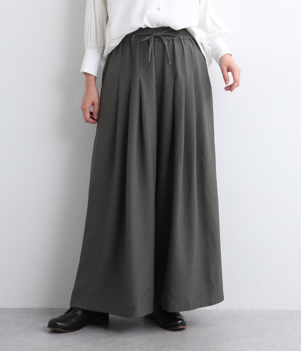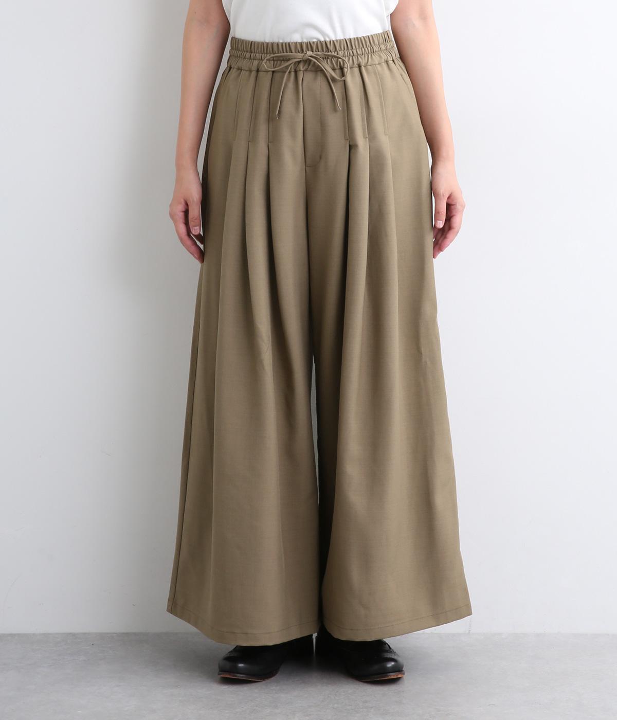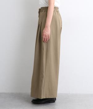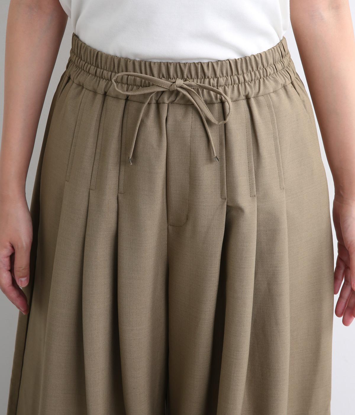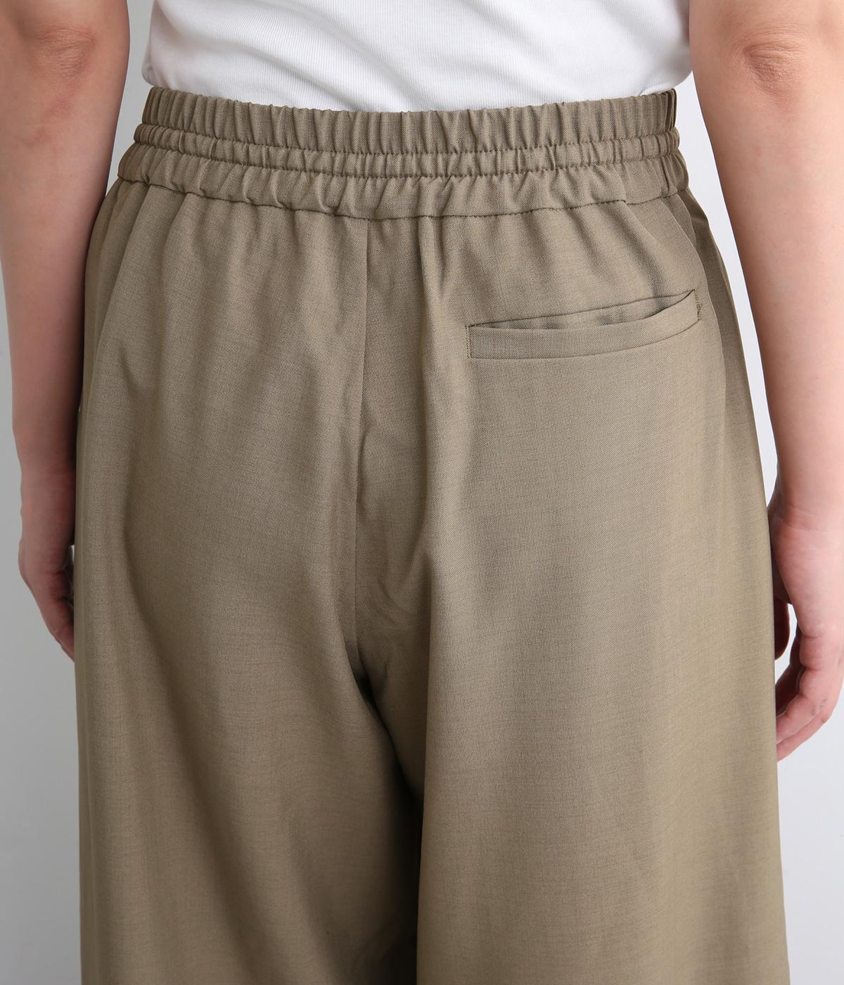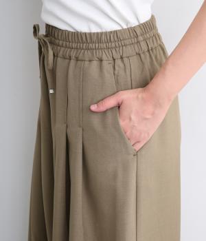 複数のタックを入れ、腰まわりにゆとりを持たせたバギーパンツ。タック効果により、クラシカルでフォーマルな印象を与えてくれるほか、きれいなシルエットをつくり出し、動きやすさにも配慮しました。両サイドと右側のヒップ部分にポケットがついています。ウエストはぐるりと一周ゴム。