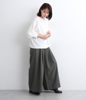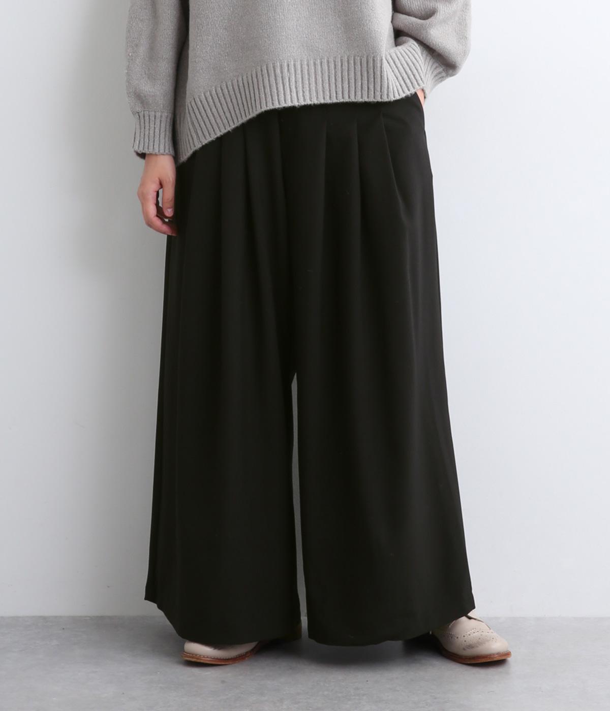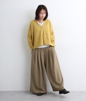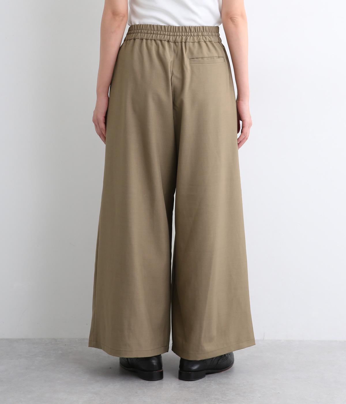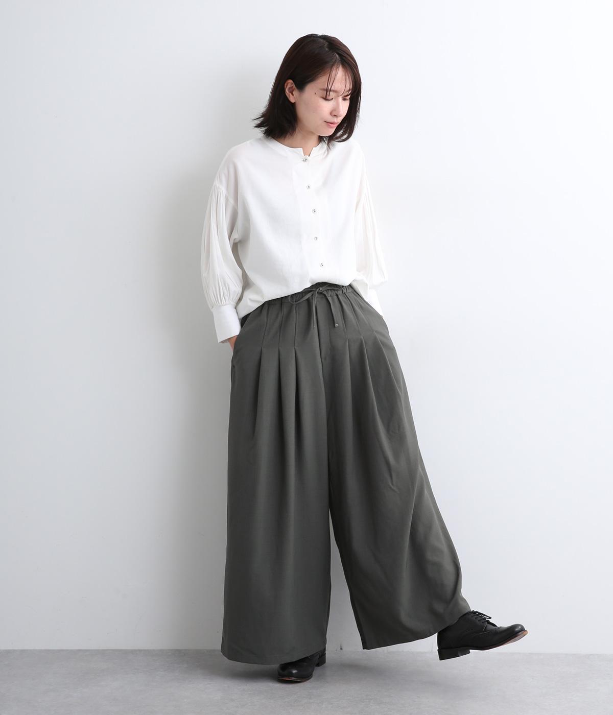 複数のタックを入れ、腰まわりにゆとりを持たせたバギーパンツ。タック効果により、クラシカルでフォーマルな印象を与えてくれるほか、きれいなシルエットをつくり出し、動きやすさにも配慮しました。両サイドと右側のヒップ部分にポケットがついています。ウエストはぐるりと一周ゴム。