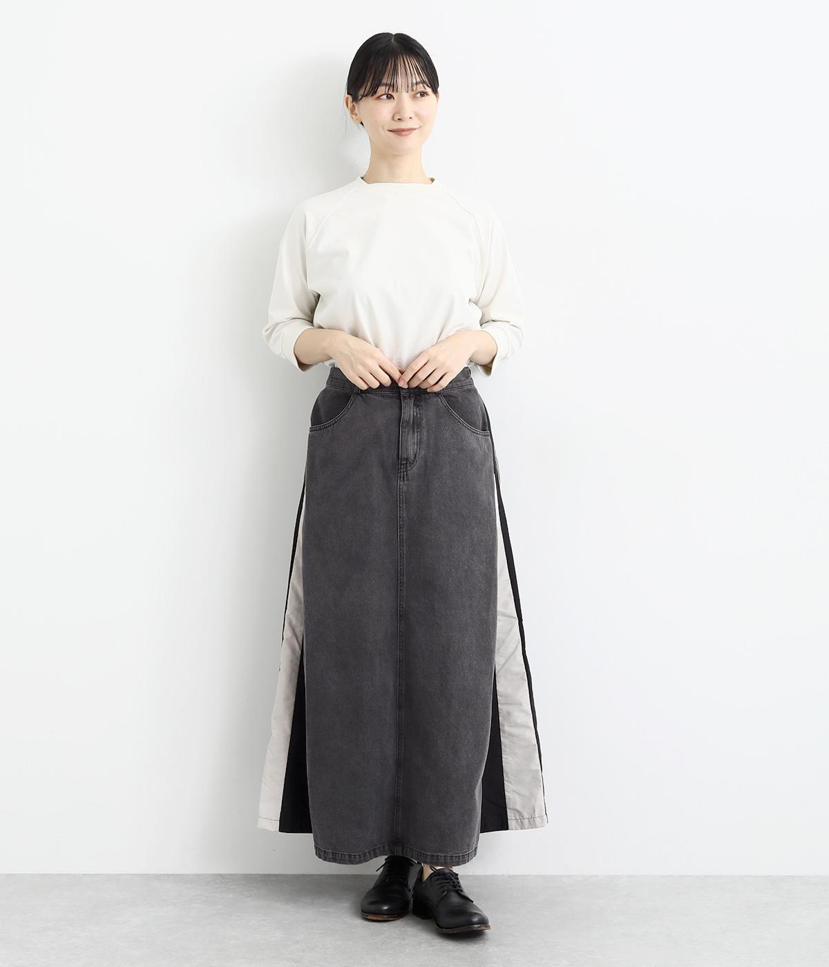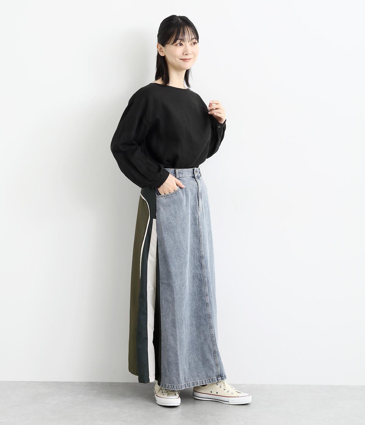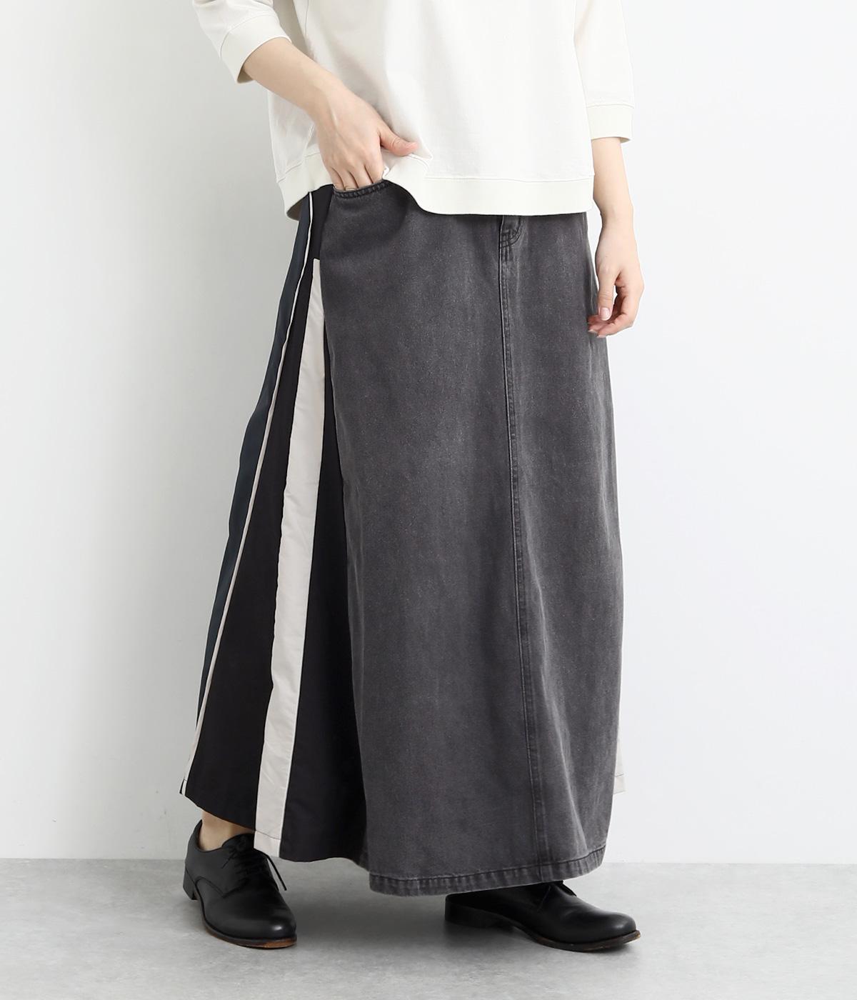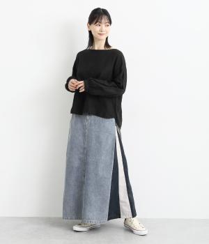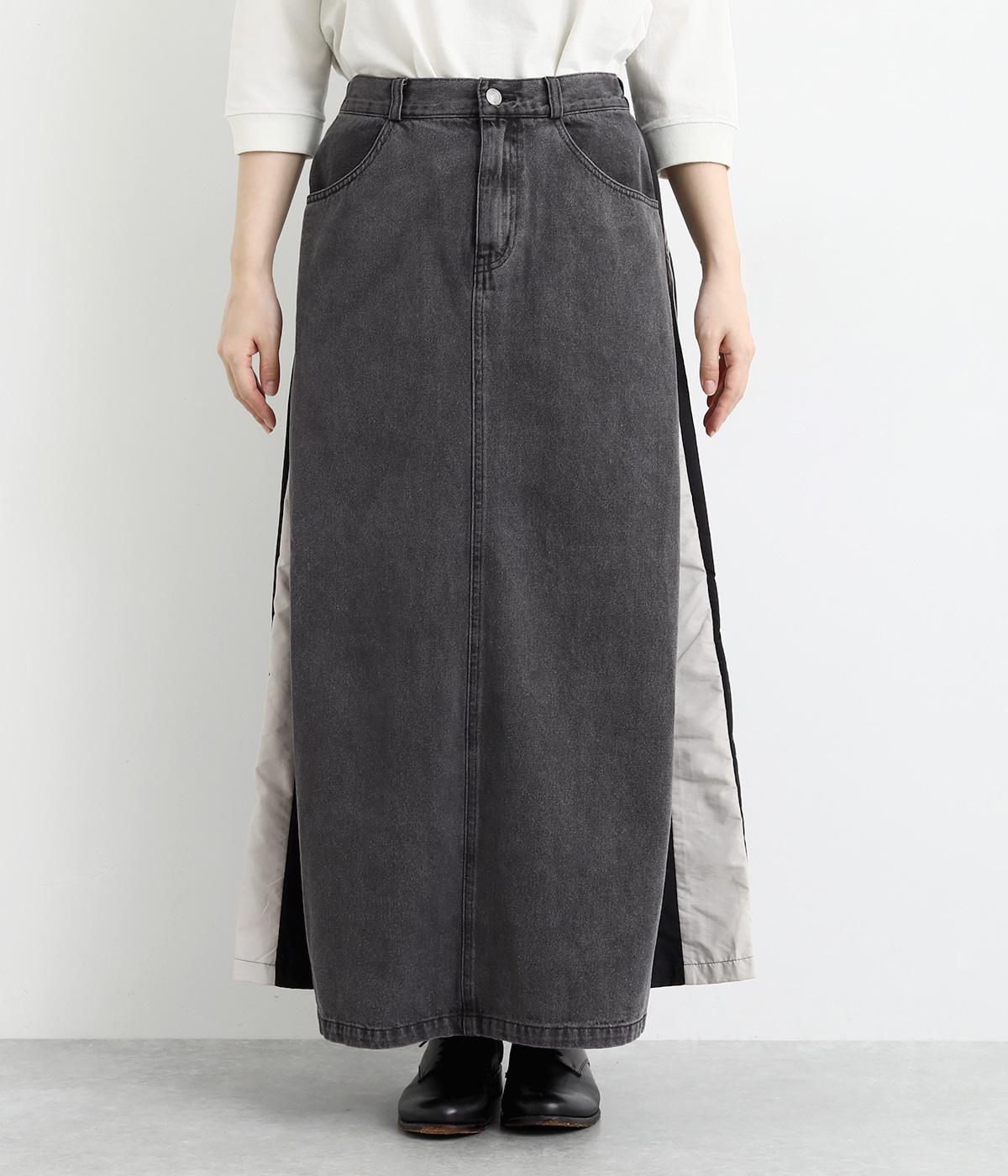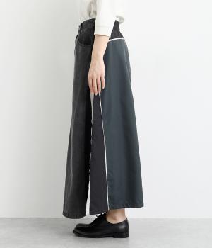 裾にかけて少しだけ広がるマキシ丈のスカート。リメイク風のデザインが、コーディネートに遊び心を添えてくれます。ベルトループ付きなので、お手持ちのベルトでのアレンジも可能。シンプルなニットなどに合わせるだけでサマになります。