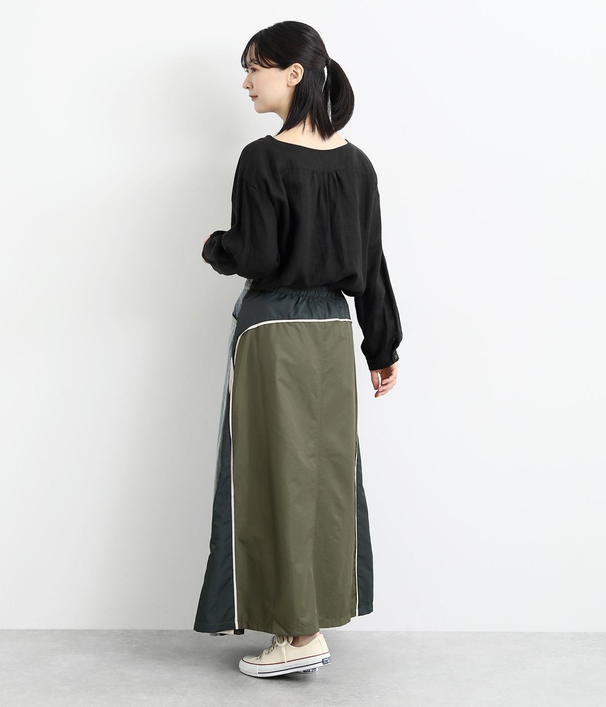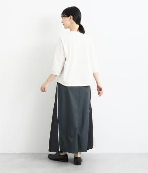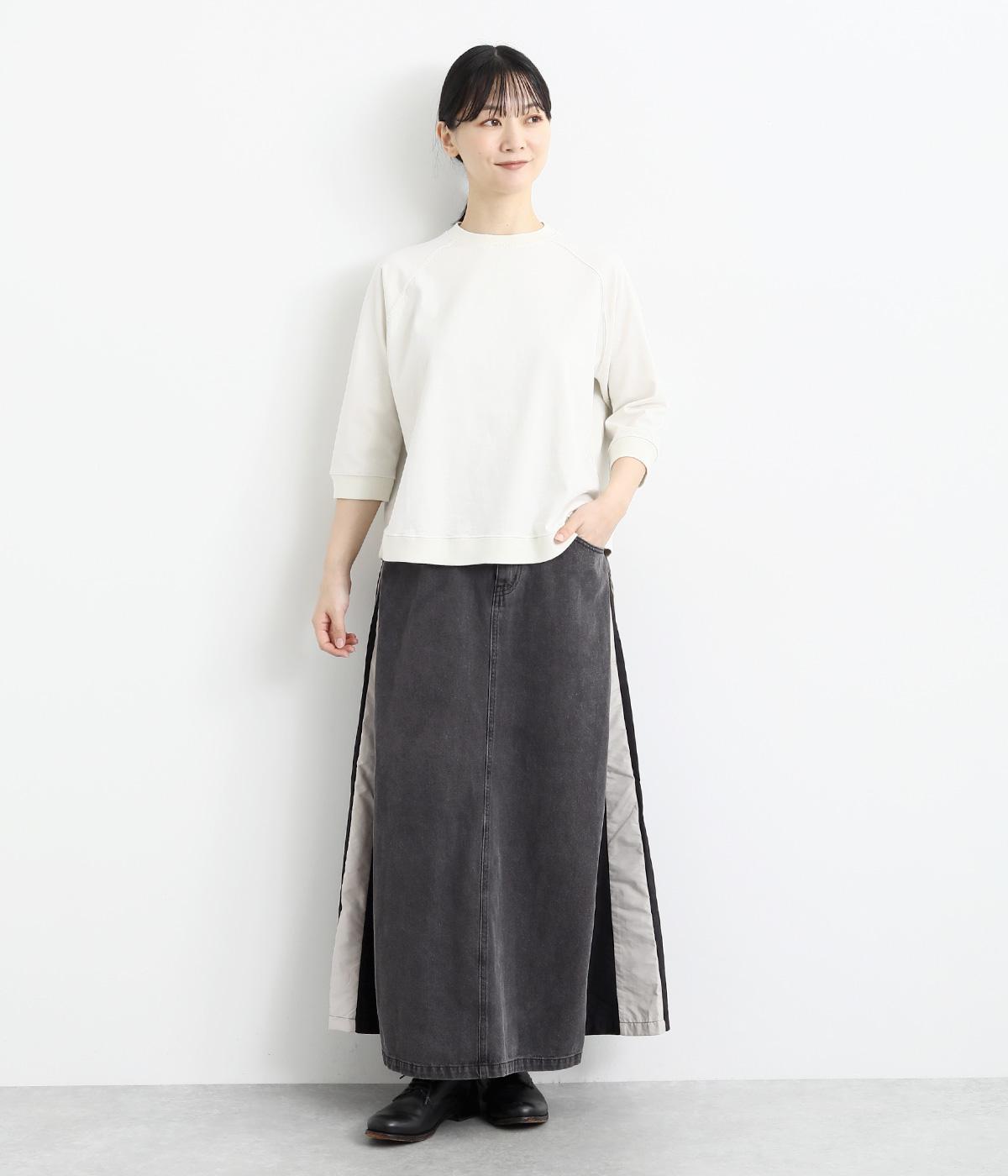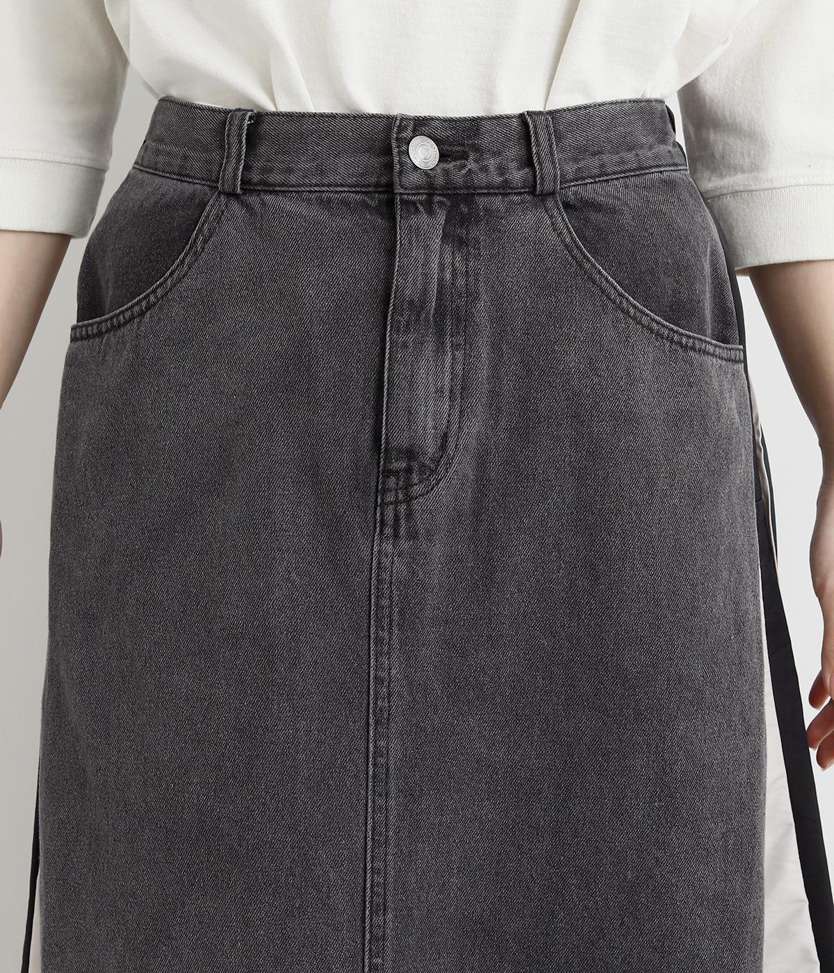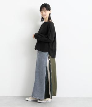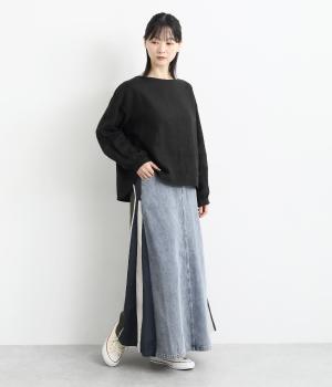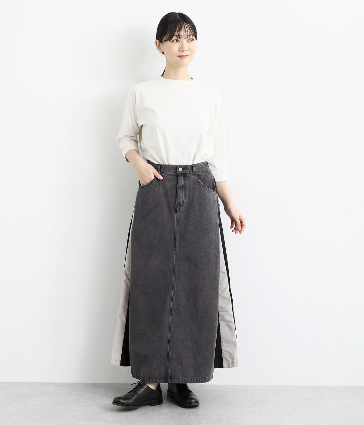 裾にかけて少しだけ広がるマキシ丈のスカート。リメイク風のデザインが、コーディネートに遊び心を添えてくれます。ベルトループ付きなので、お手持ちのベルトでのアレンジも可能。シンプルなニットなどに合わせるだけでサマになります。