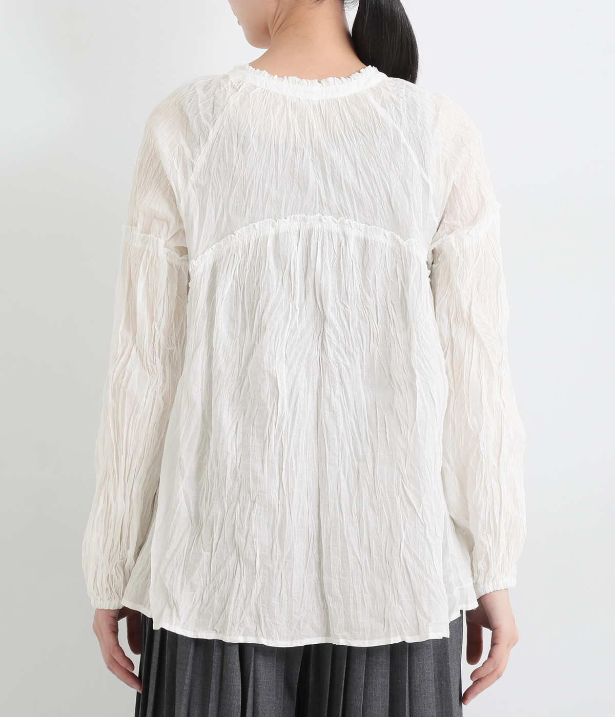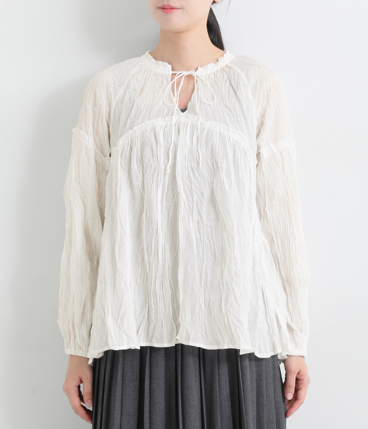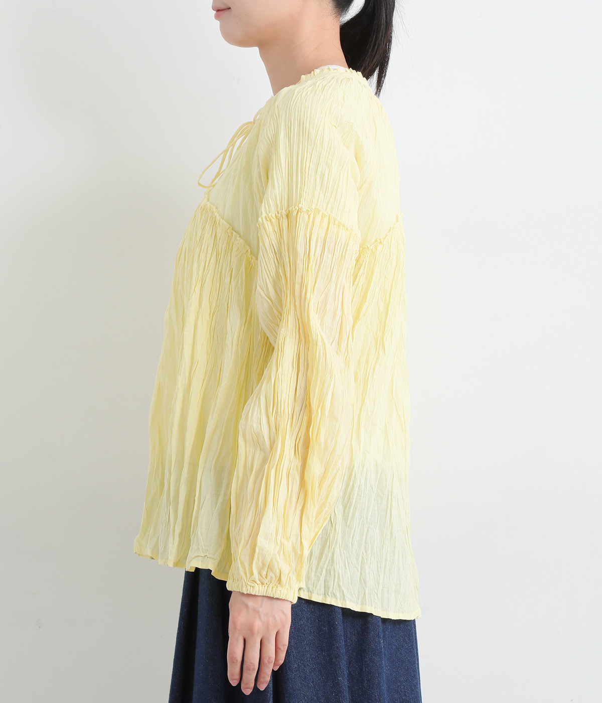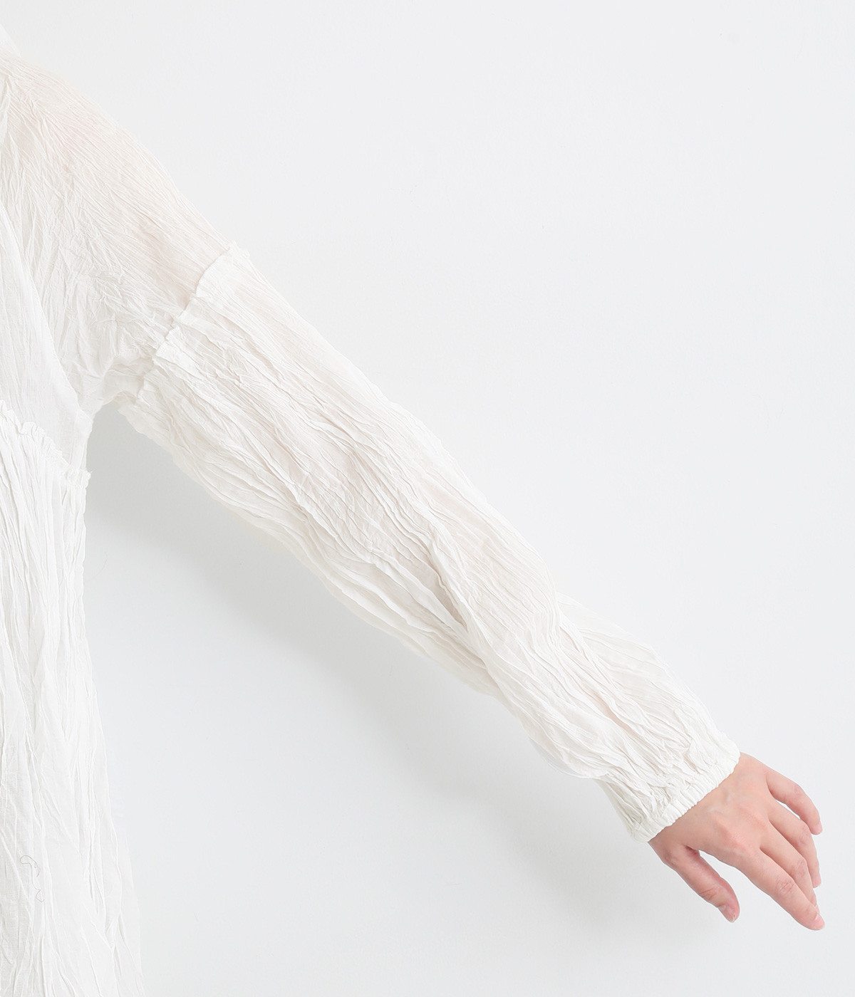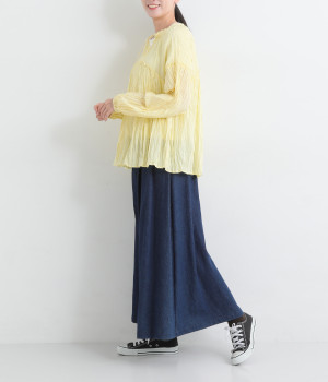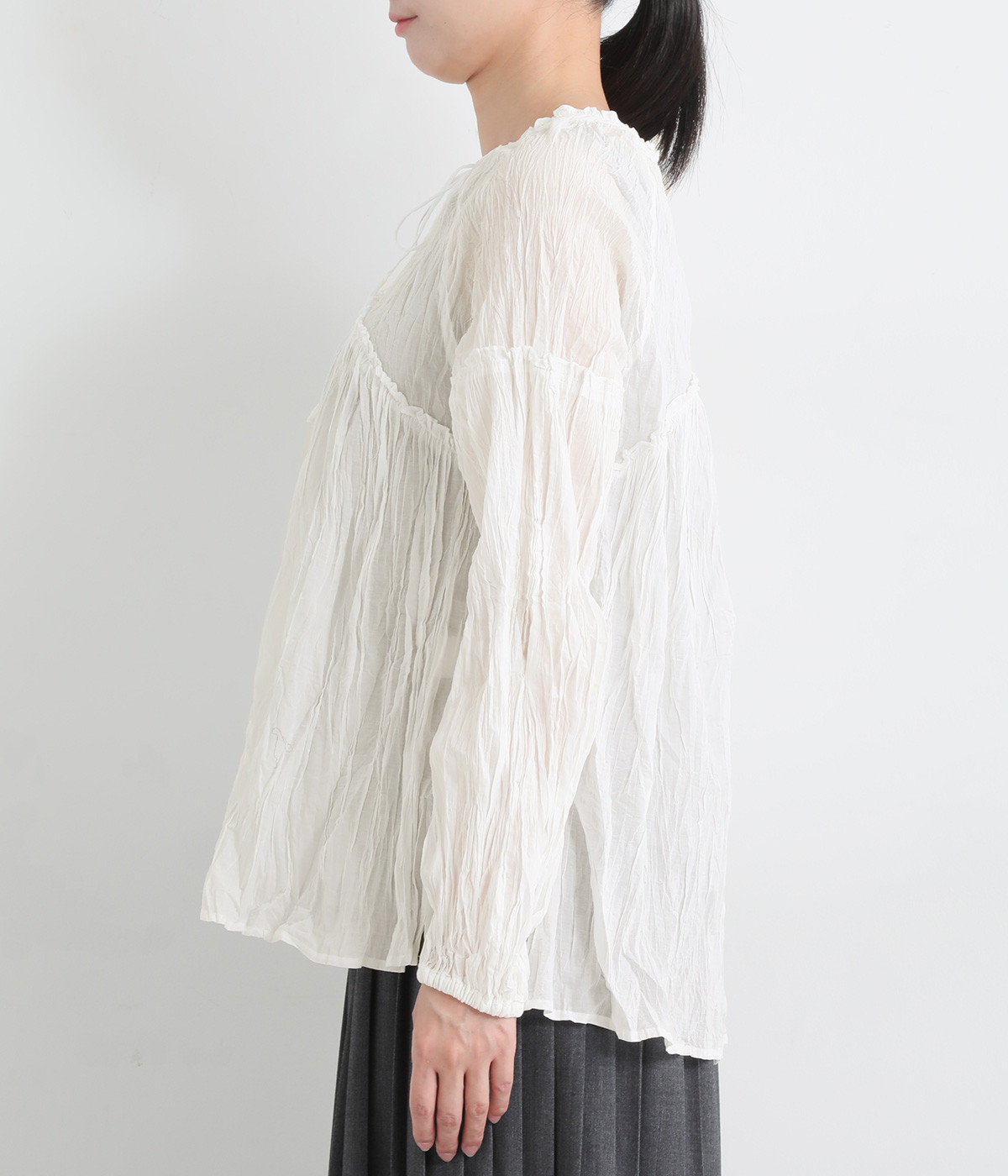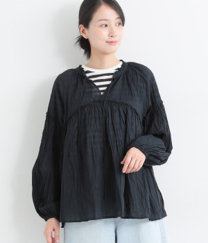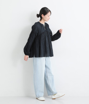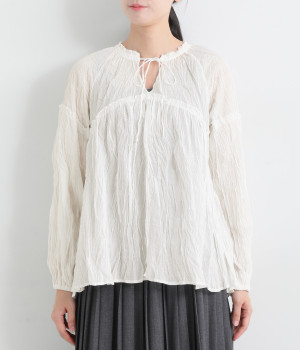 ふわりと風をはらむ薄手のコットンボイル生地は、製品洗い後クリンクル仕上げに。立体感が出るよう縦じわを入れることで、やさしいニュアンスが高まります。透け感があり、着こなしを軽やかに演出。