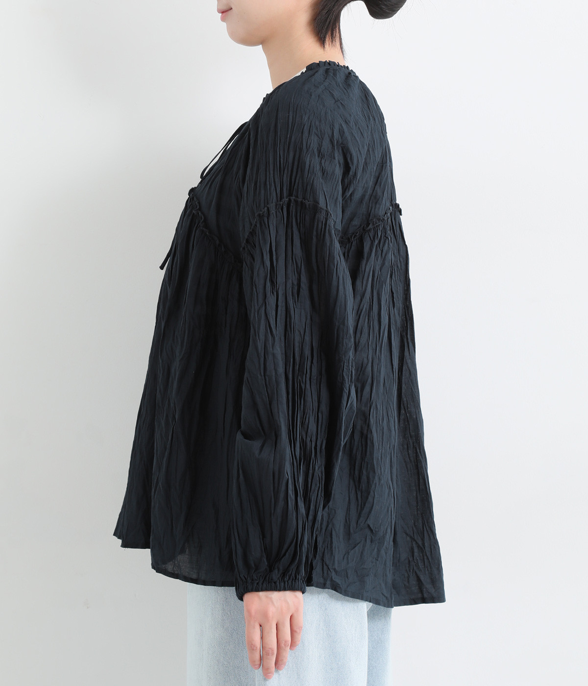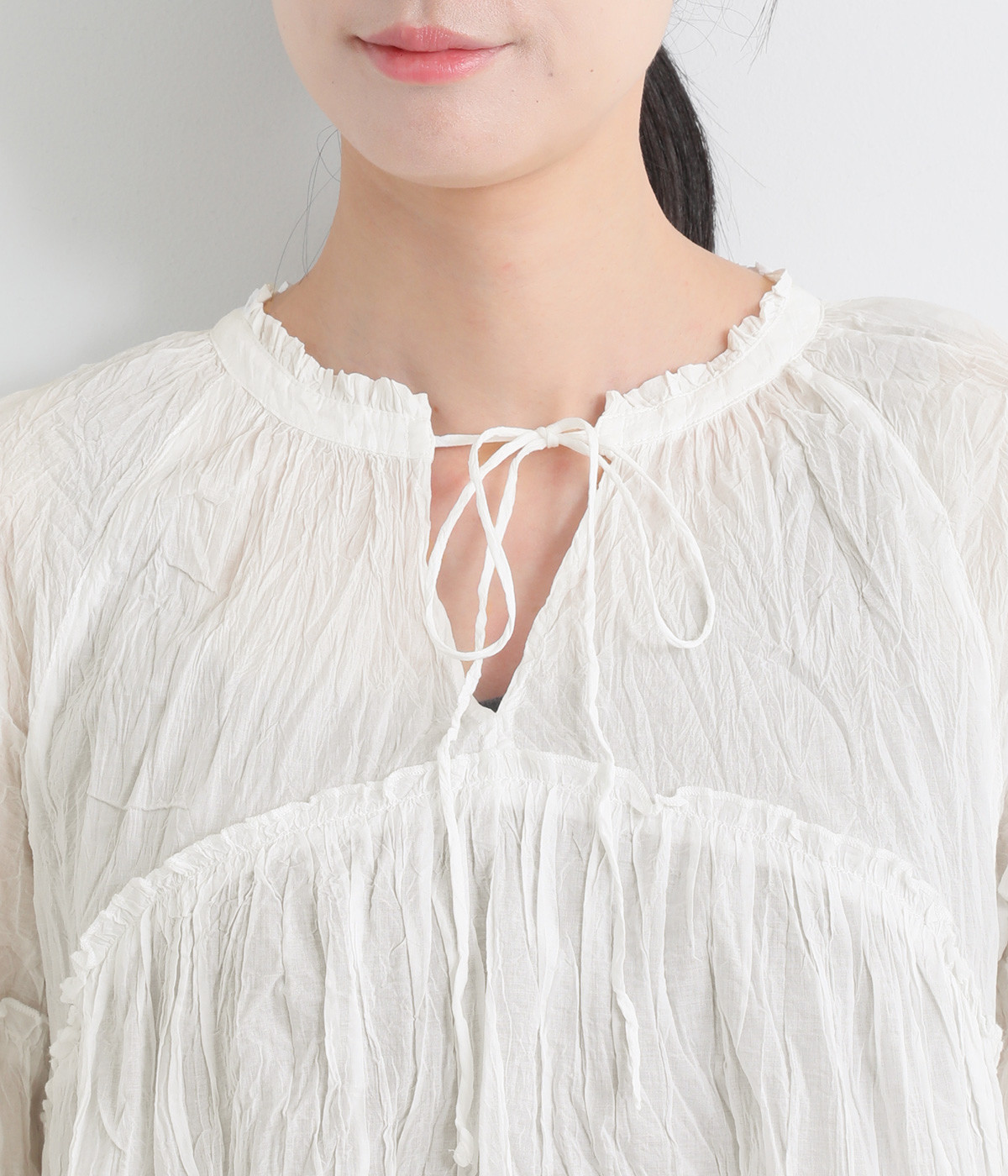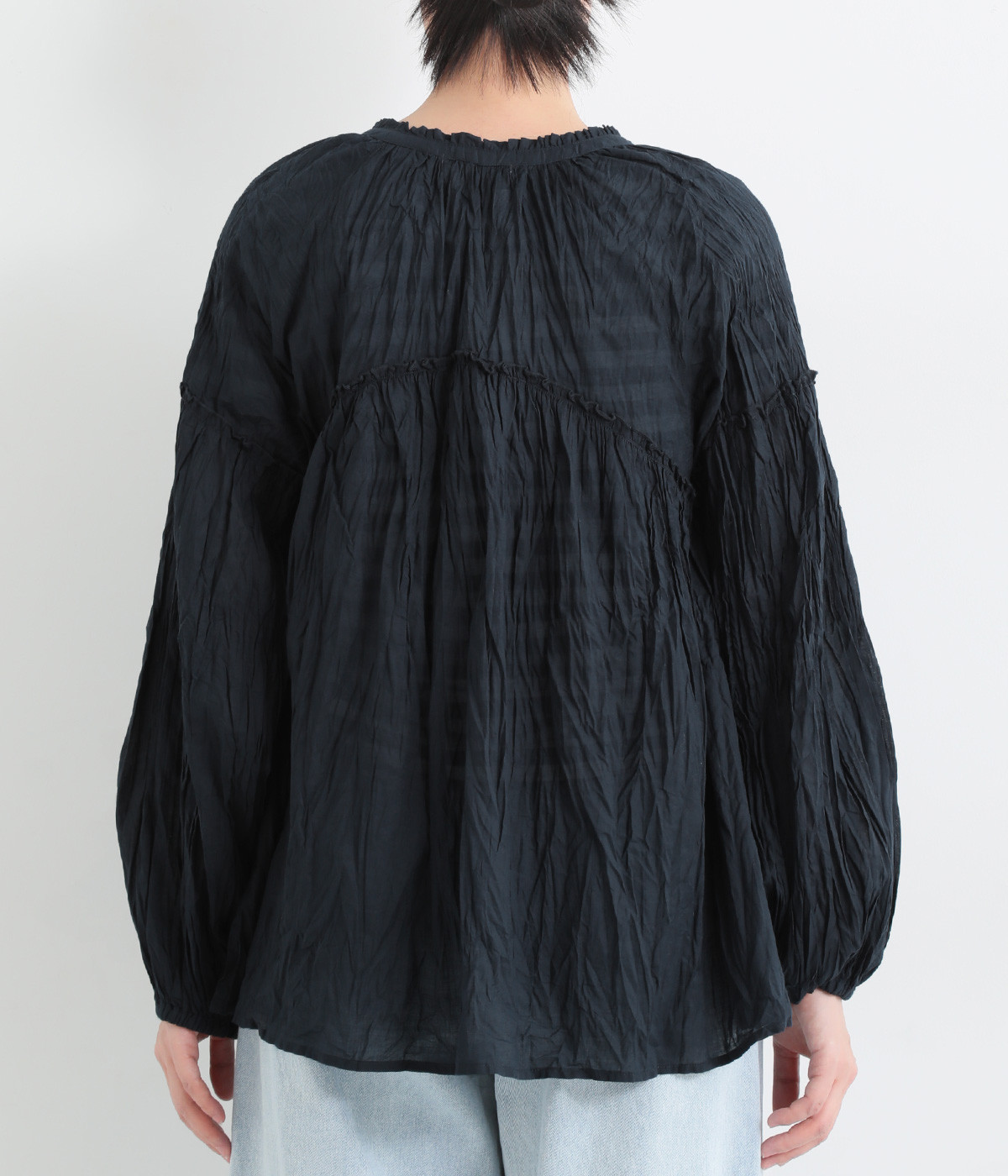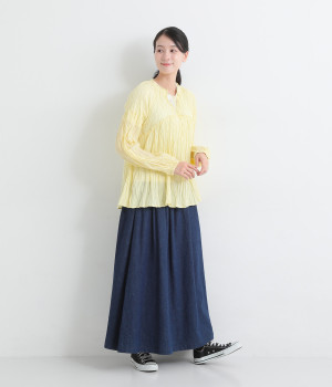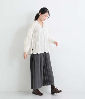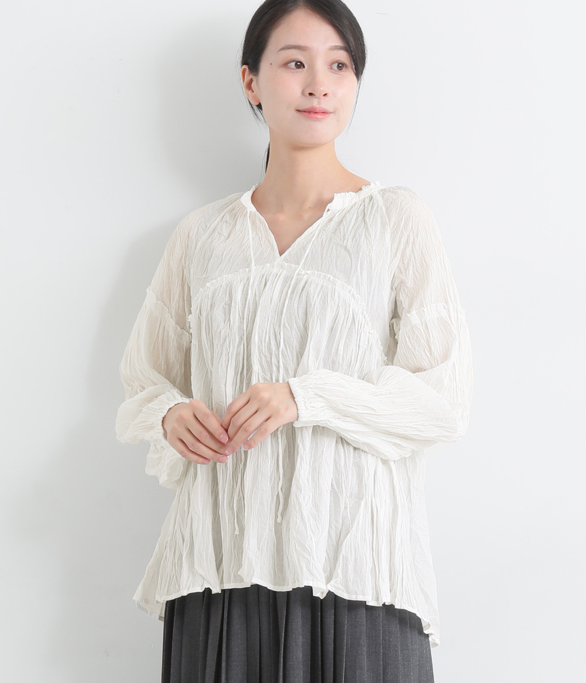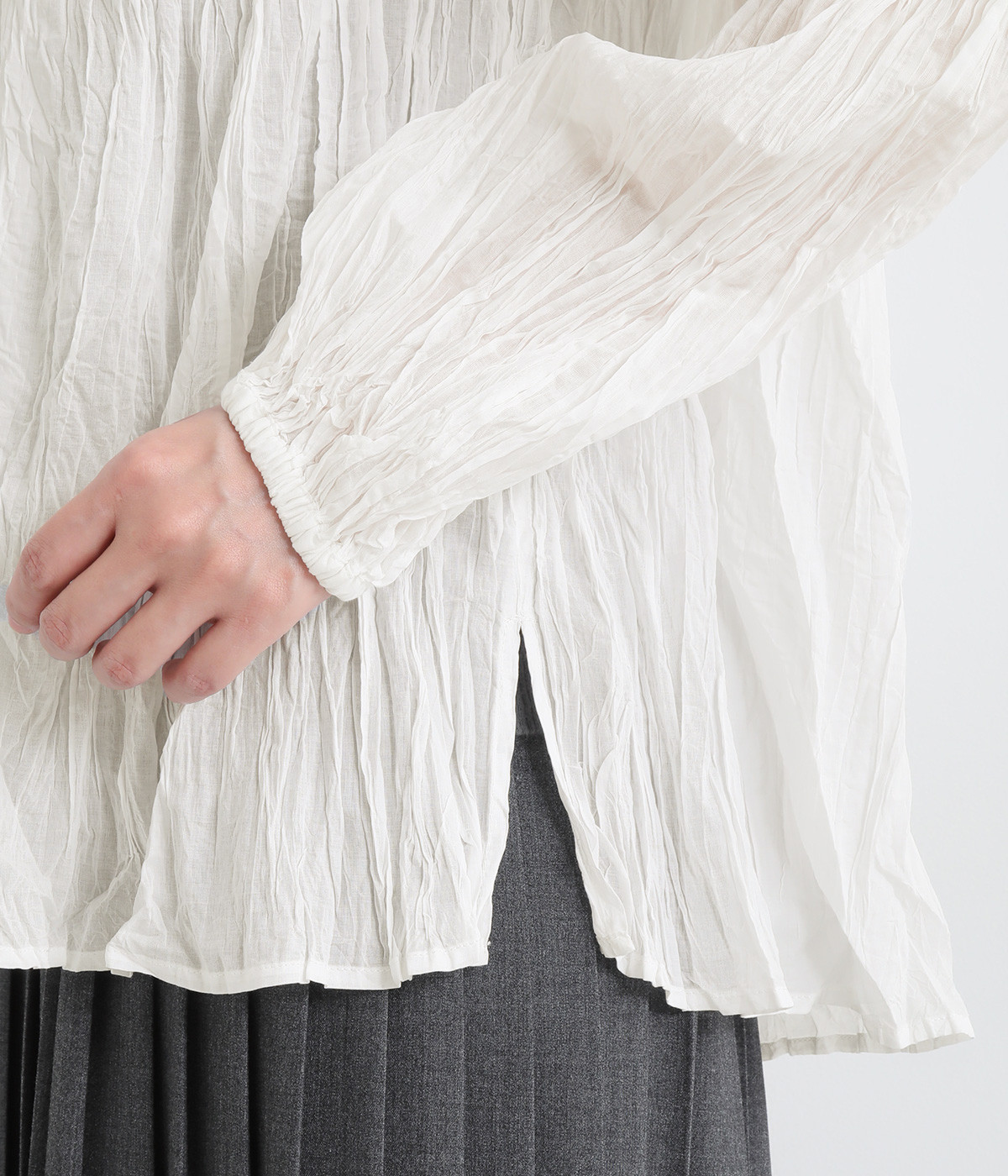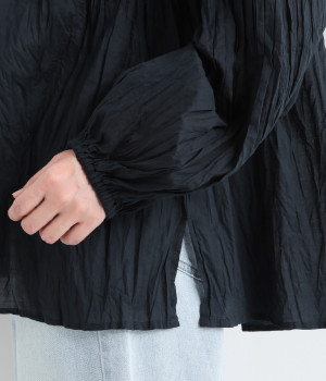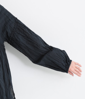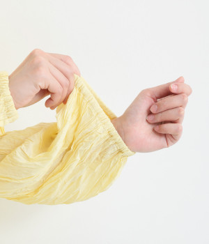 ふわりと風をはらむ薄手のコットンボイル生地は、製品洗い後クリンクル仕上げに。立体感が出るよう縦じわを入れることで、やさしいニュアンスが高まります。透け感があり、着こなしを軽やかに演出。