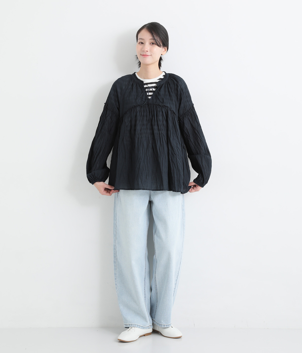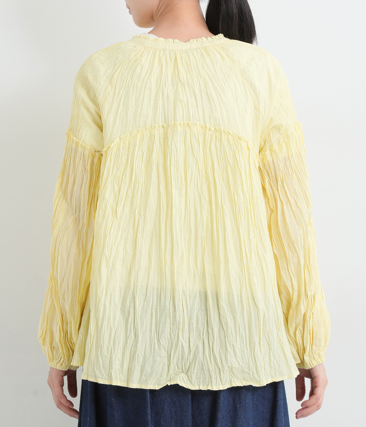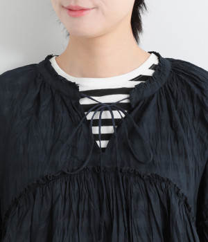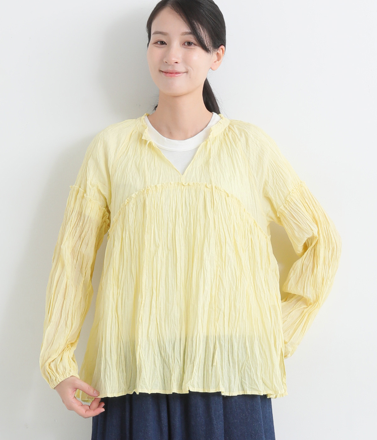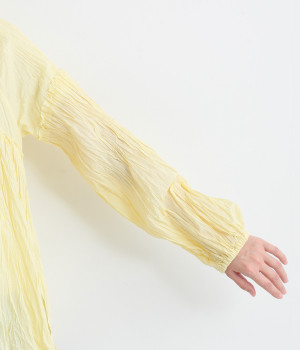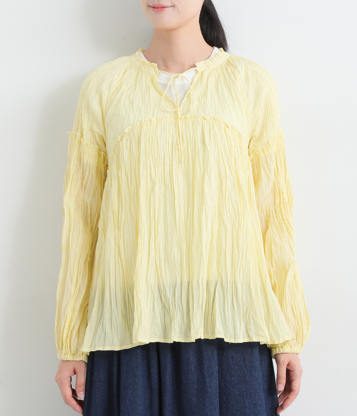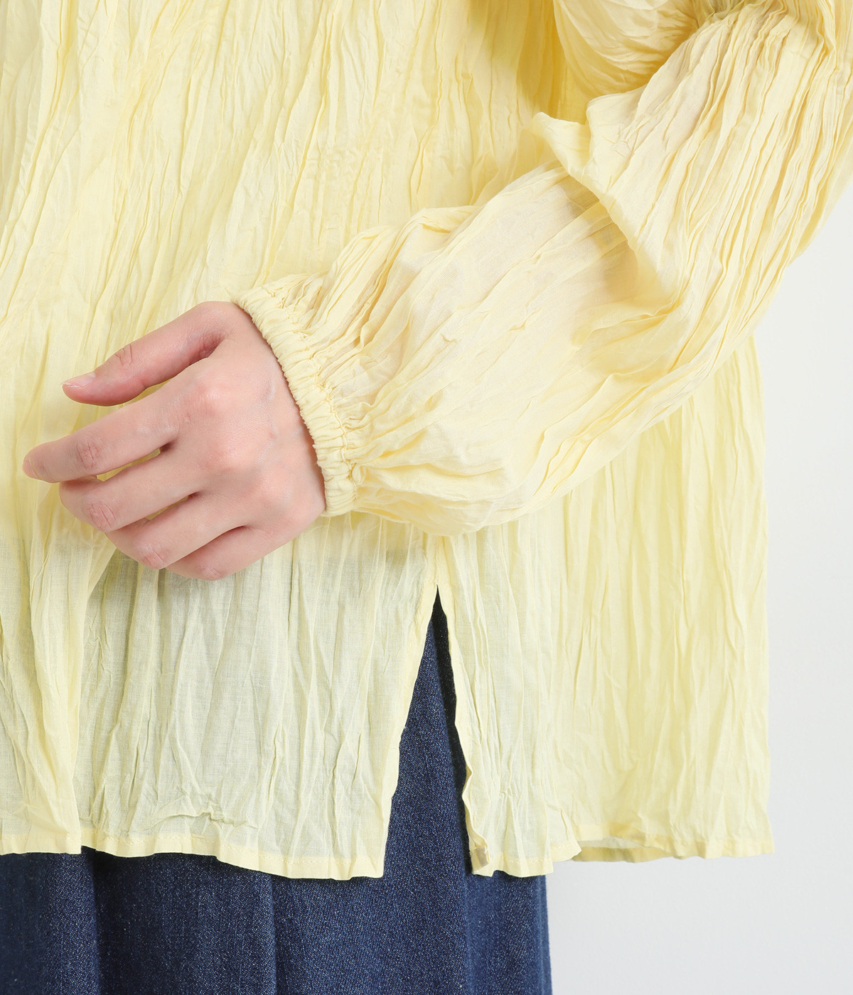 ふわりと風をはらむ薄手のコットンボイル生地は、製品洗い後クリンクル仕上げに。立体感が出るよう縦じわを入れることで、やさしいニュアンスが高まります。透け感があり、着こなしを軽やかに演出。