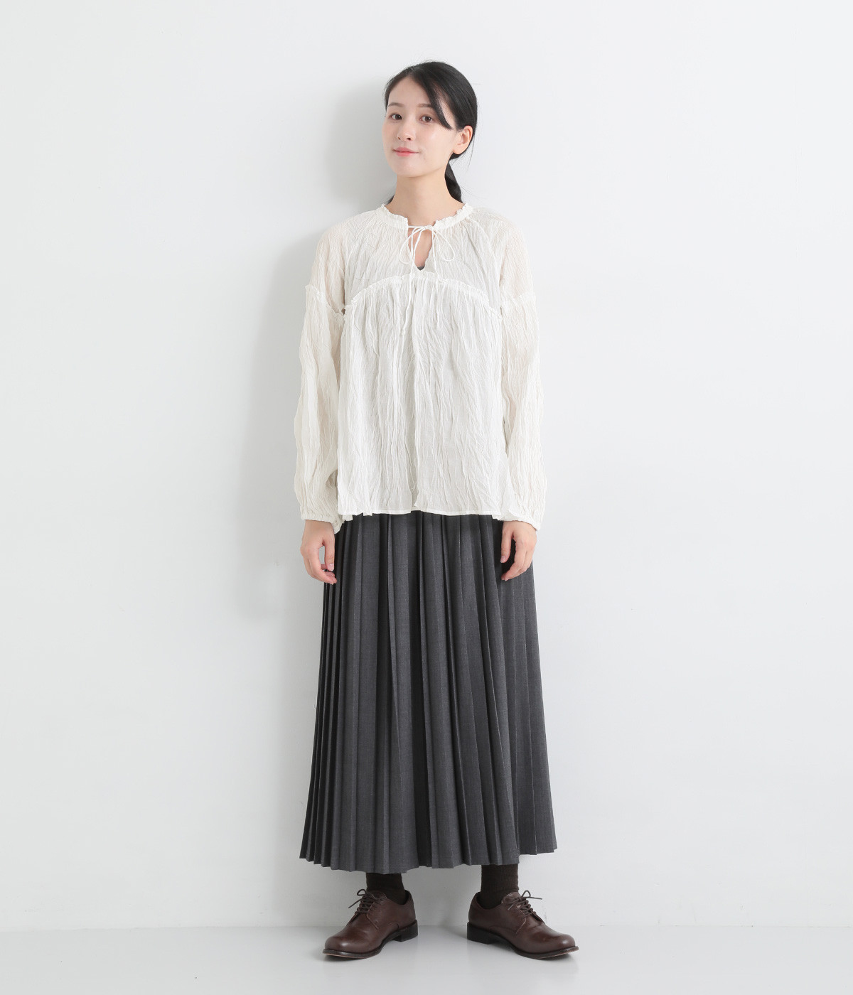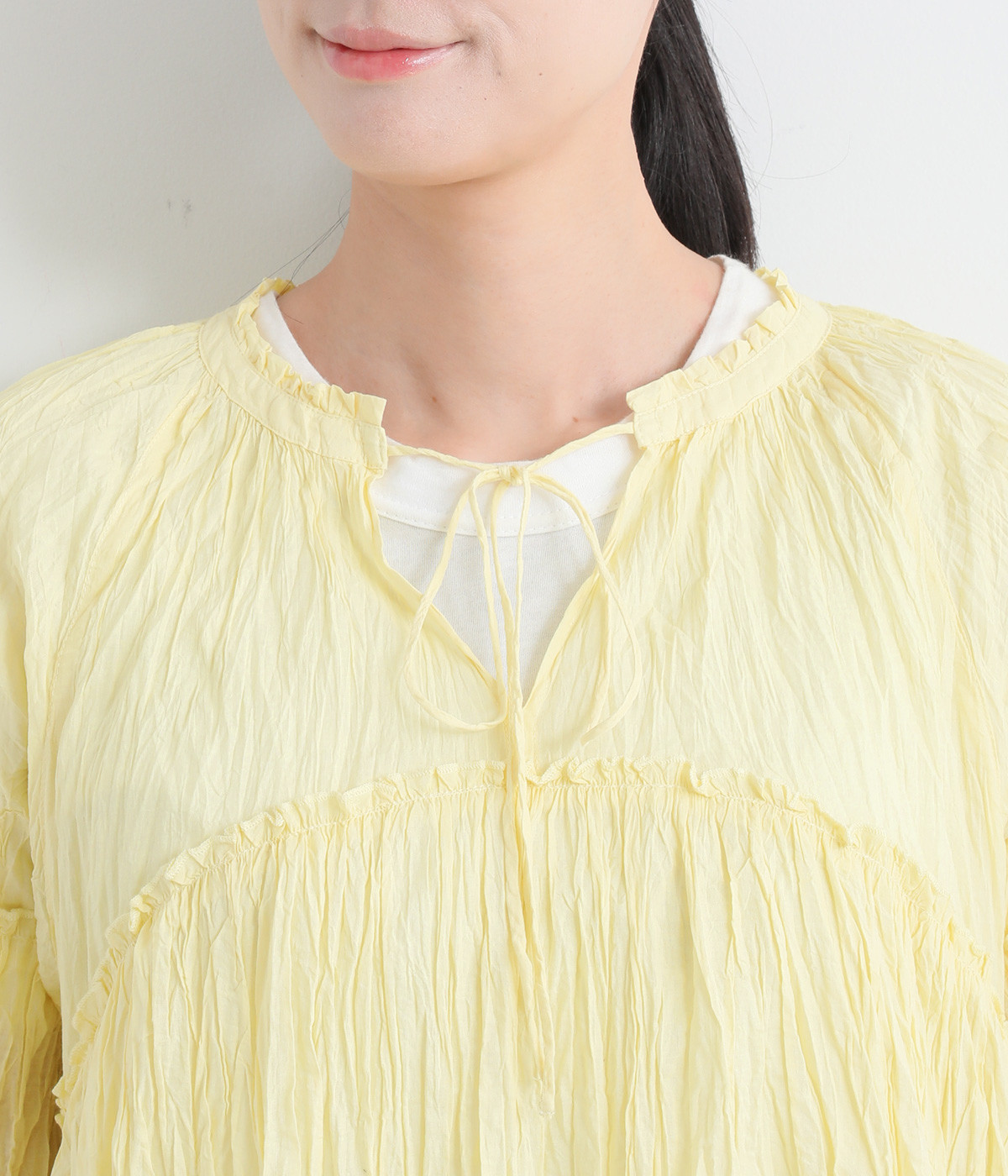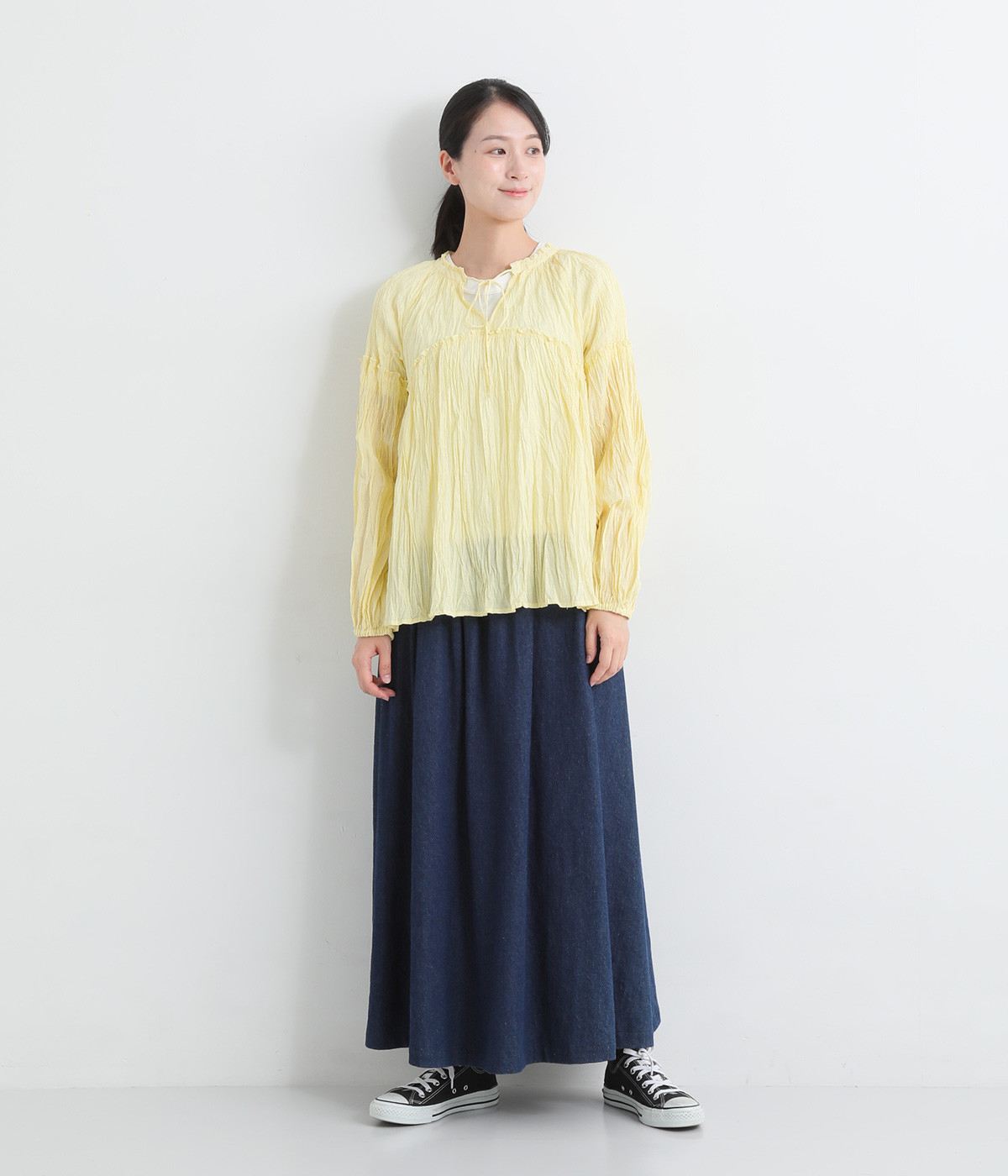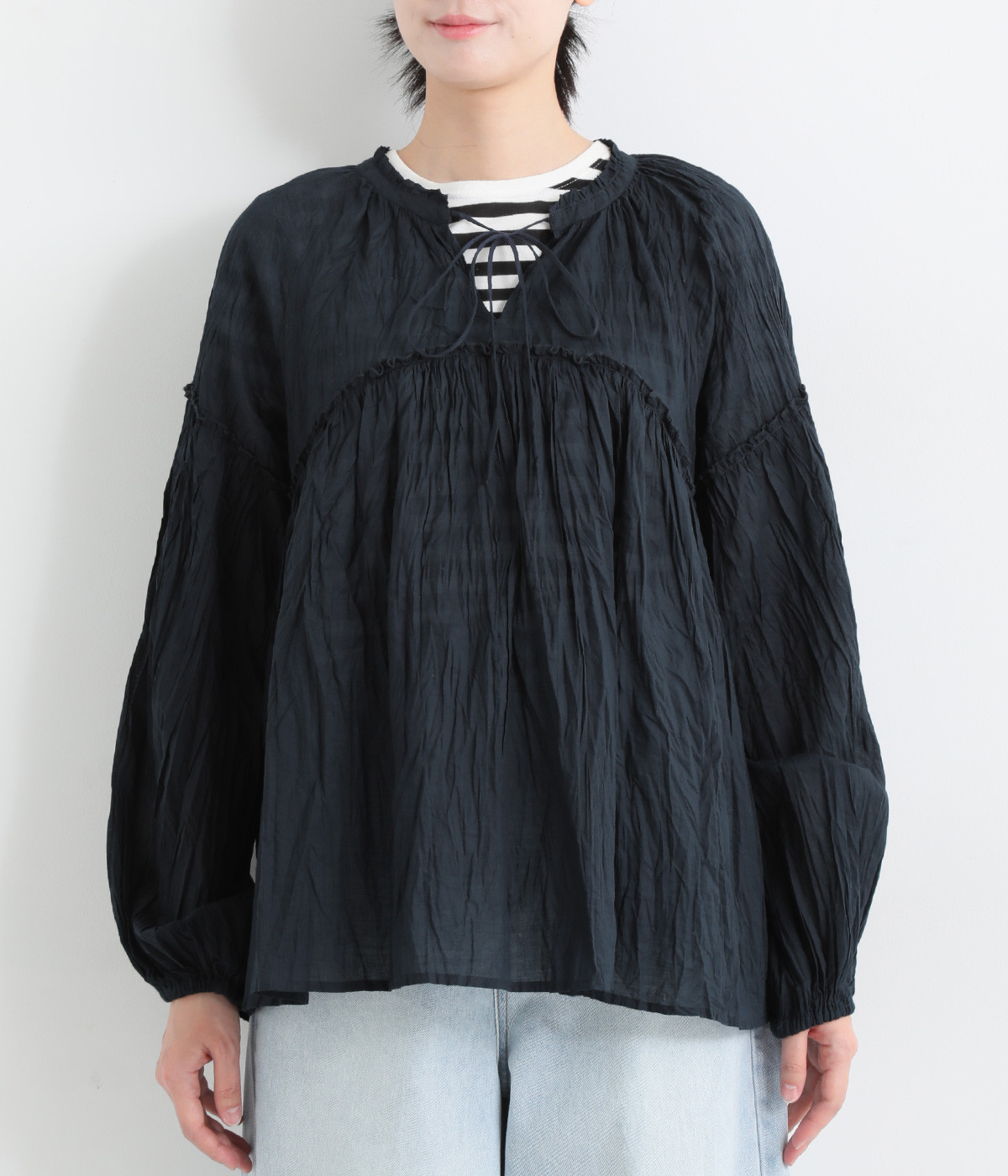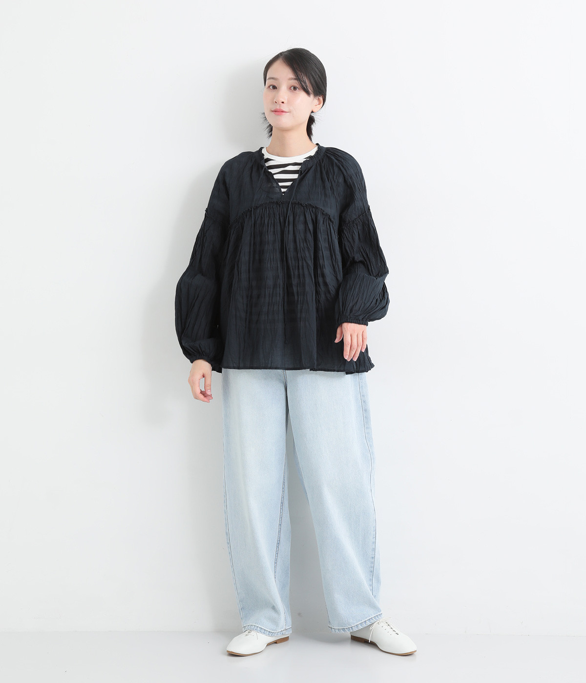 ふわりと風をはらむ薄手のコットンボイル生地は、製品洗い後クリンクル仕上げに。立体感が出るよう縦じわを入れることで、やさしいニュアンスが高まります。透け感があり、着こなしを軽やかに演出。