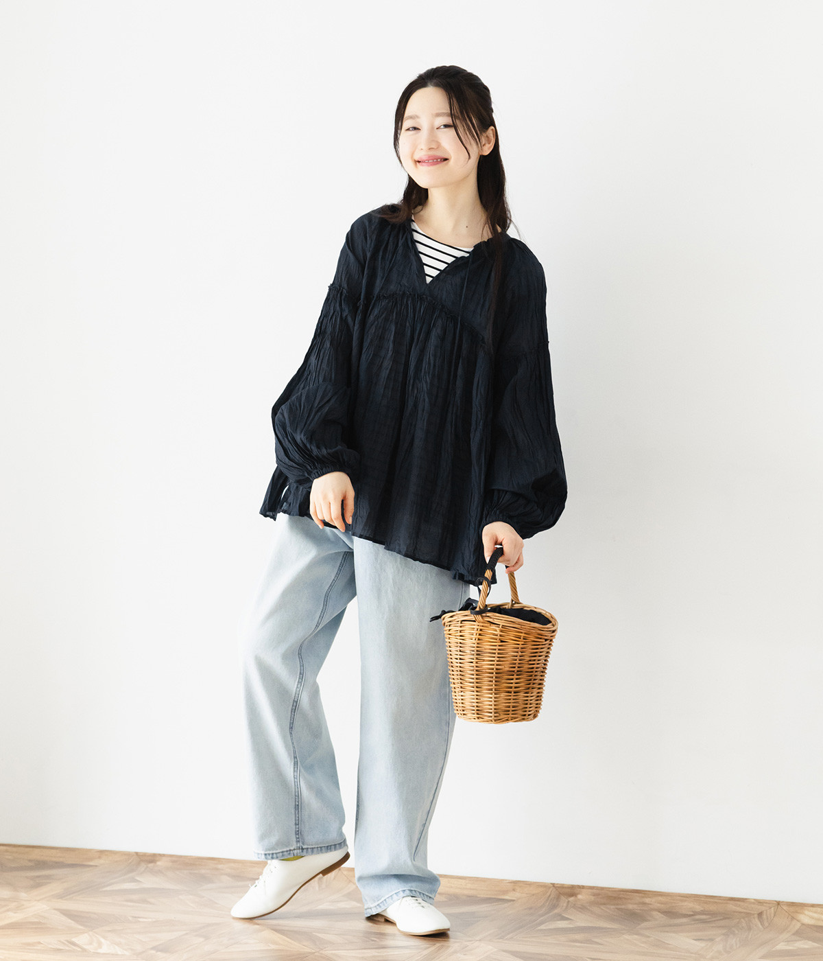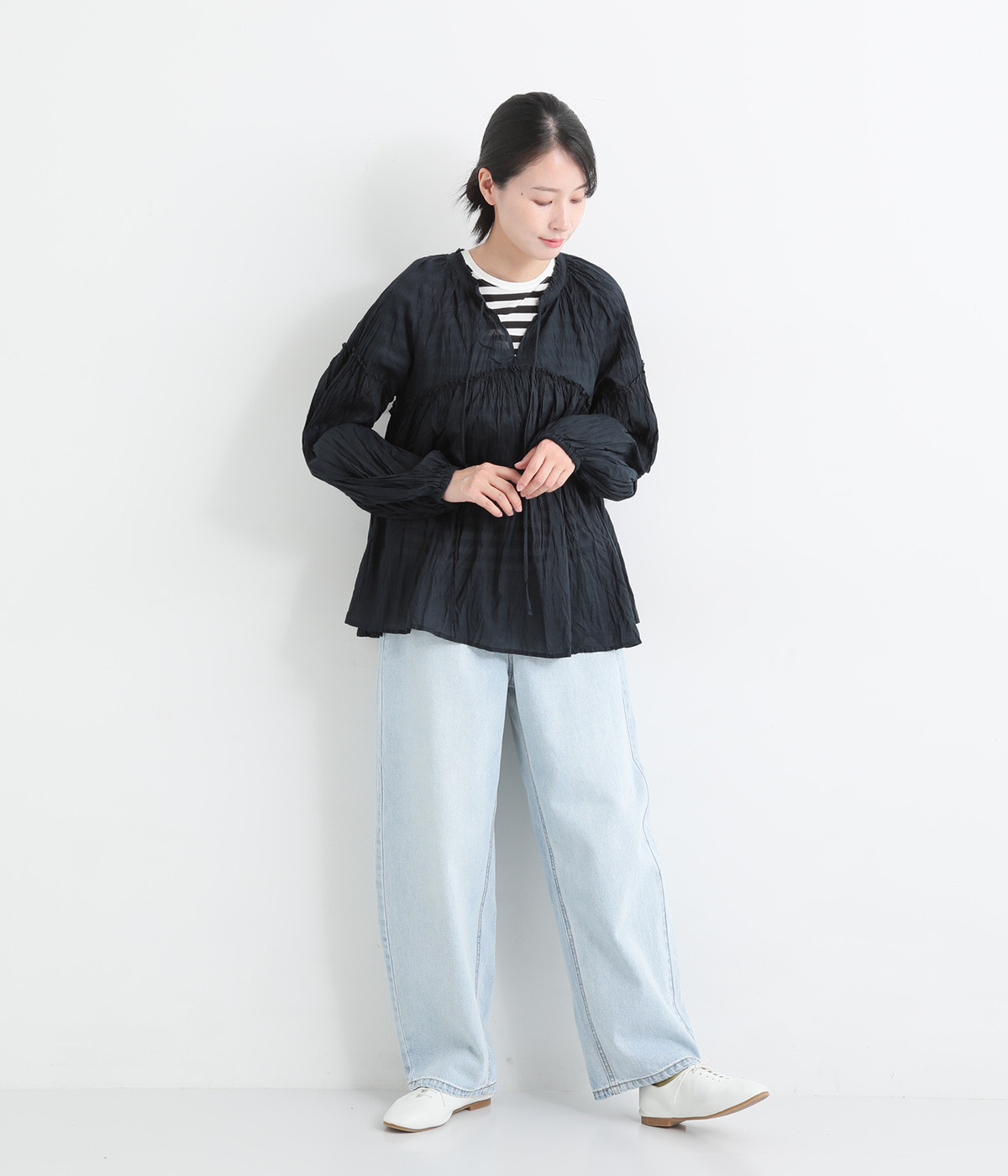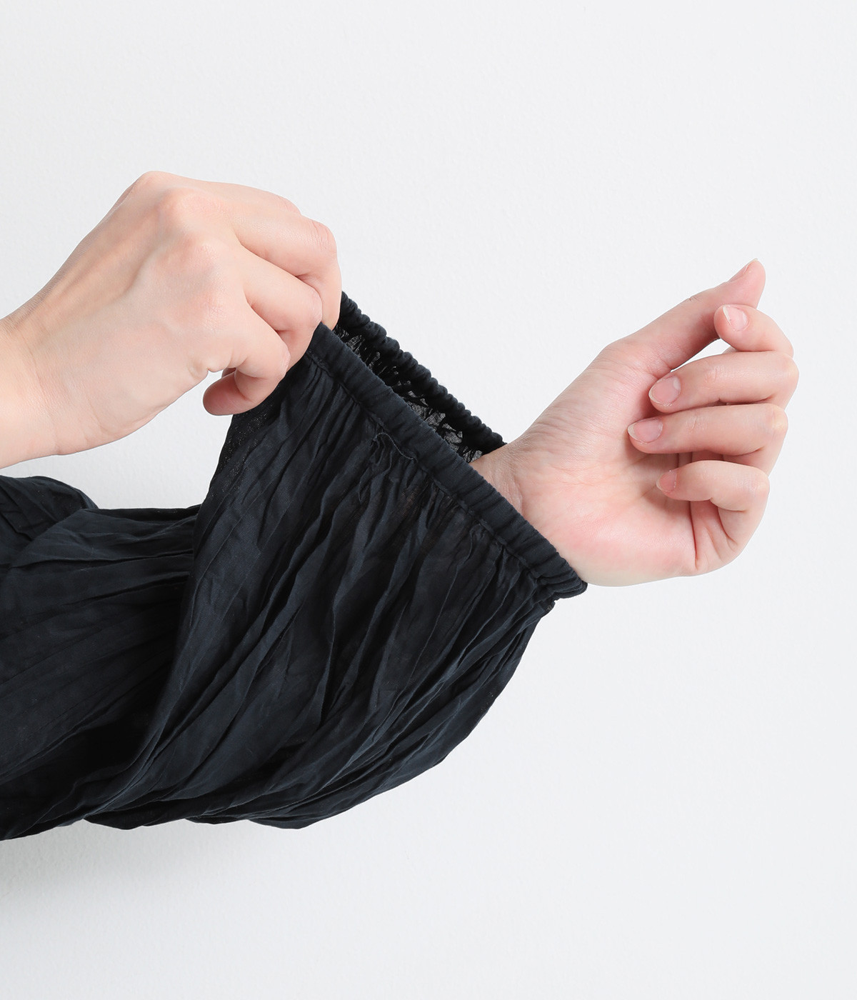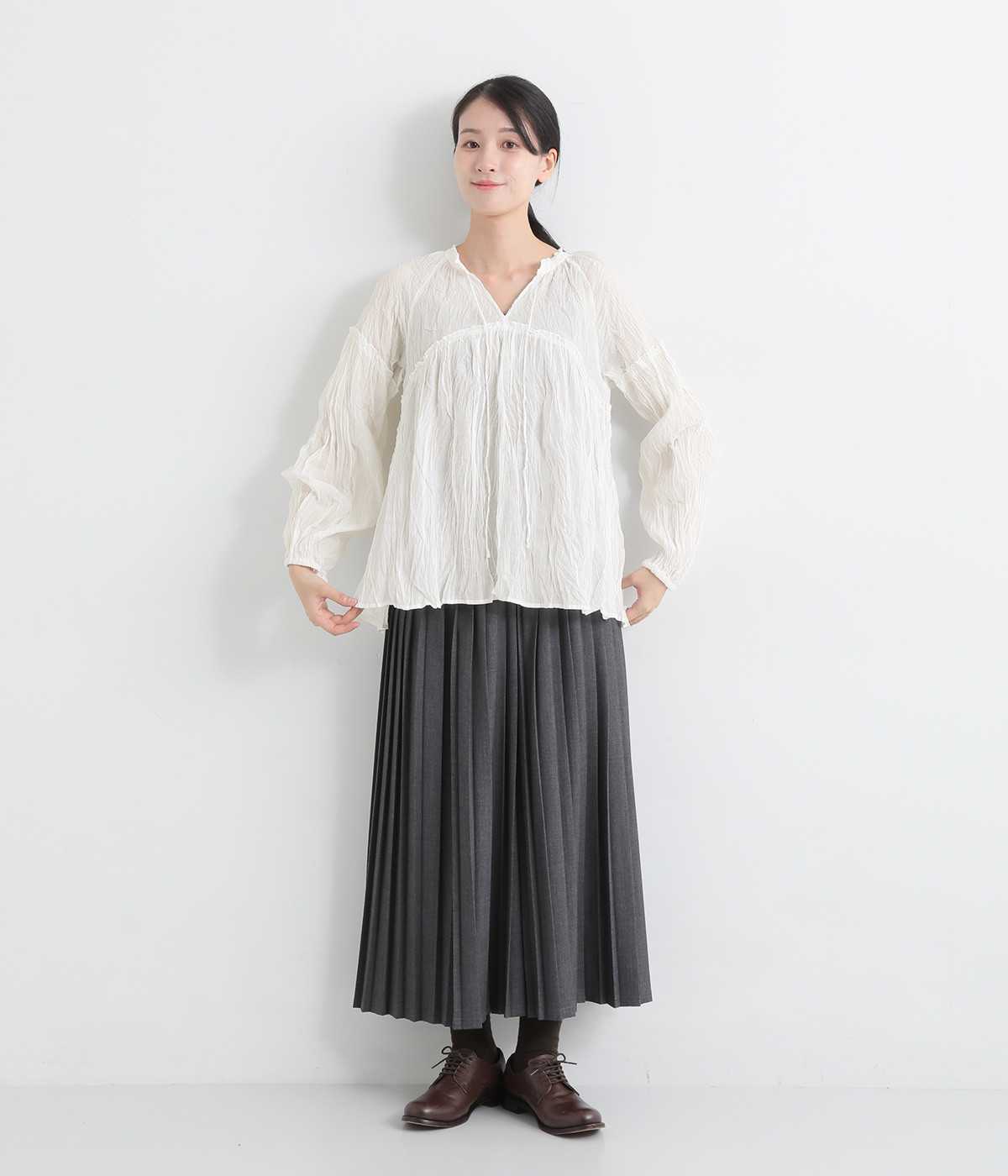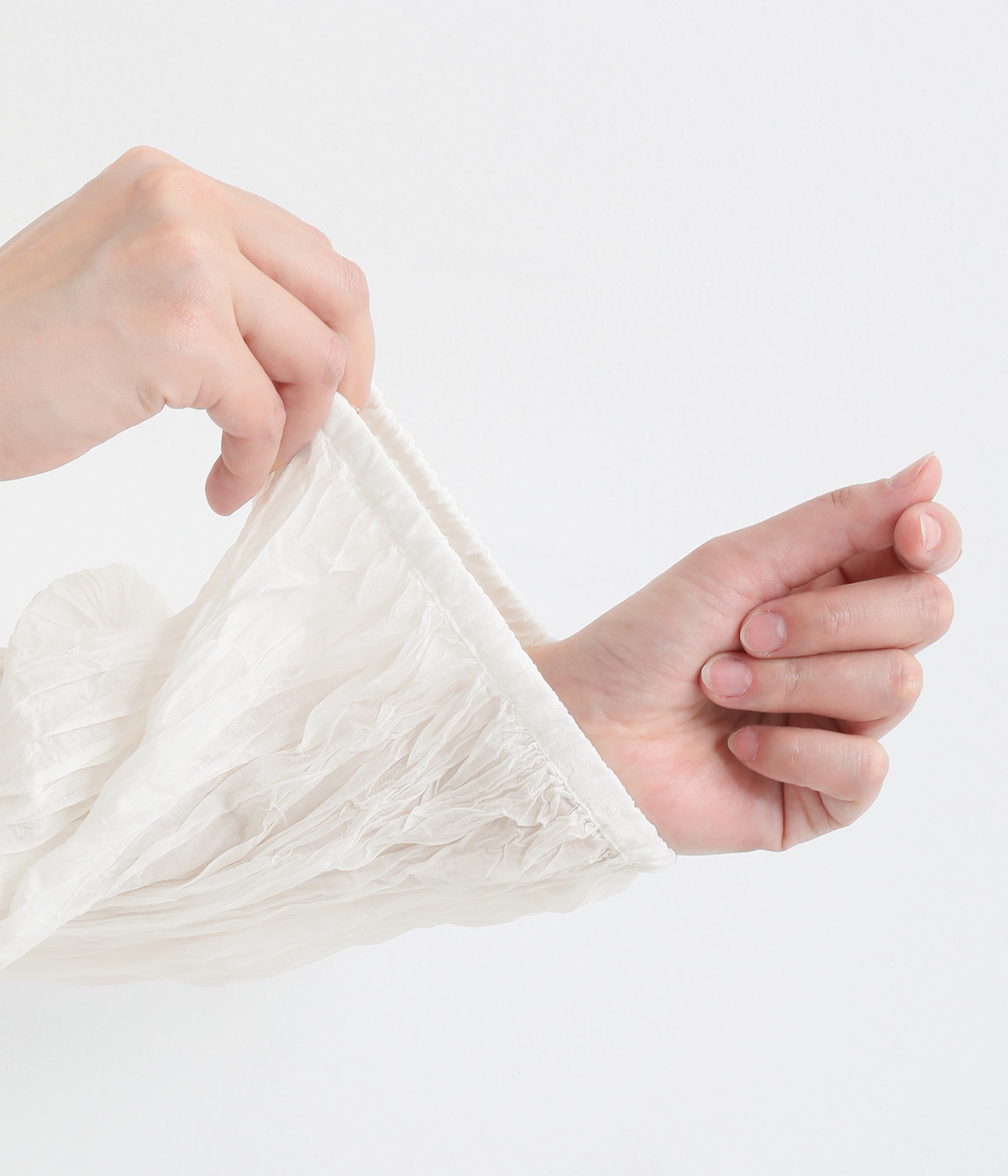 ふわりと風をはらむ薄手のコットンボイル生地は、製品洗い後クリンクル仕上げに。立体感が出るよう縦じわを入れることで、やさしいニュアンスが高まります。透け感があり、着こなしを軽やかに演出。