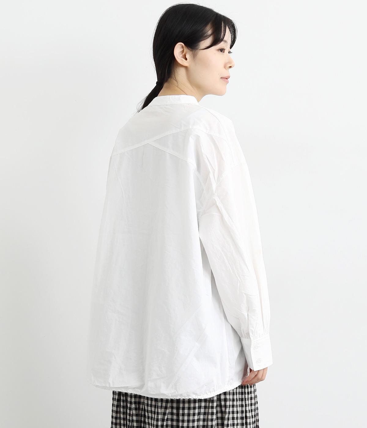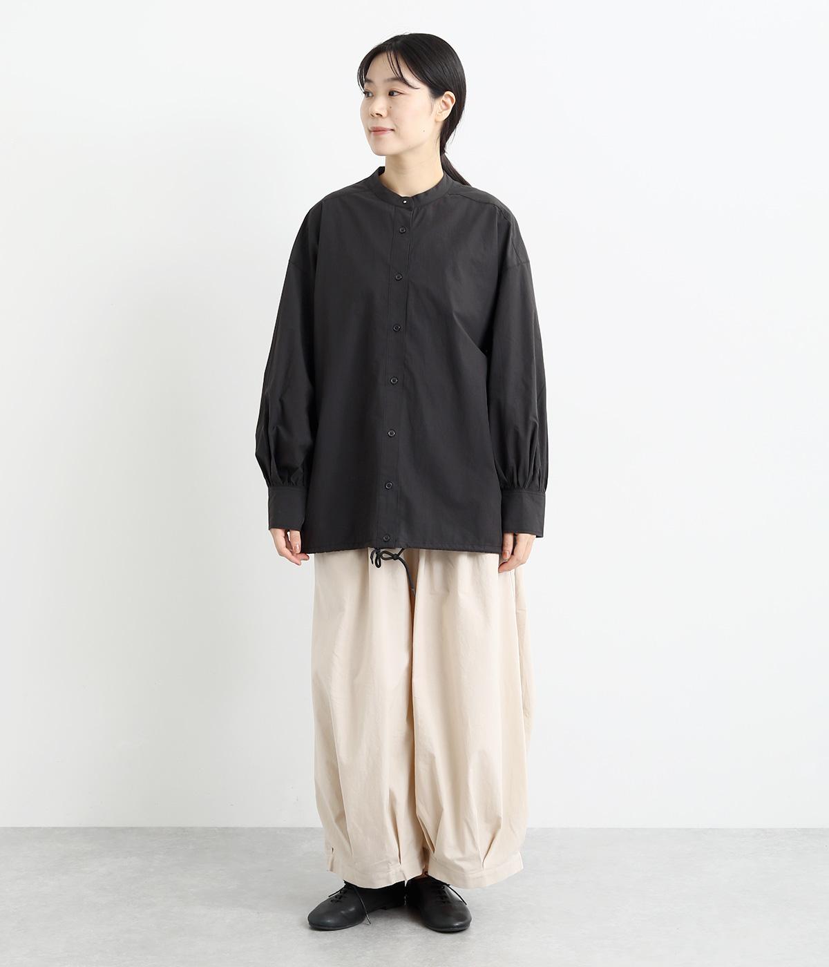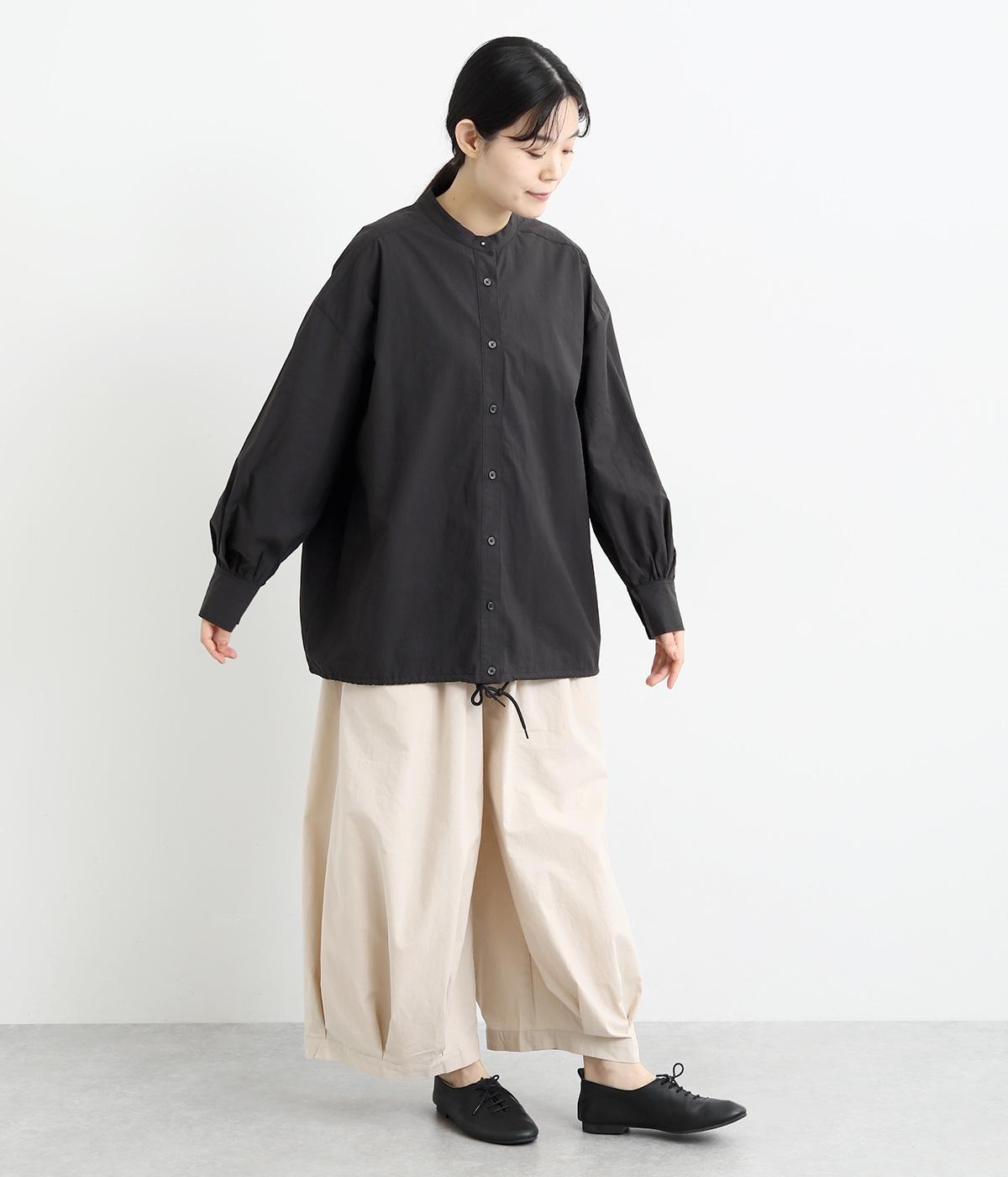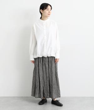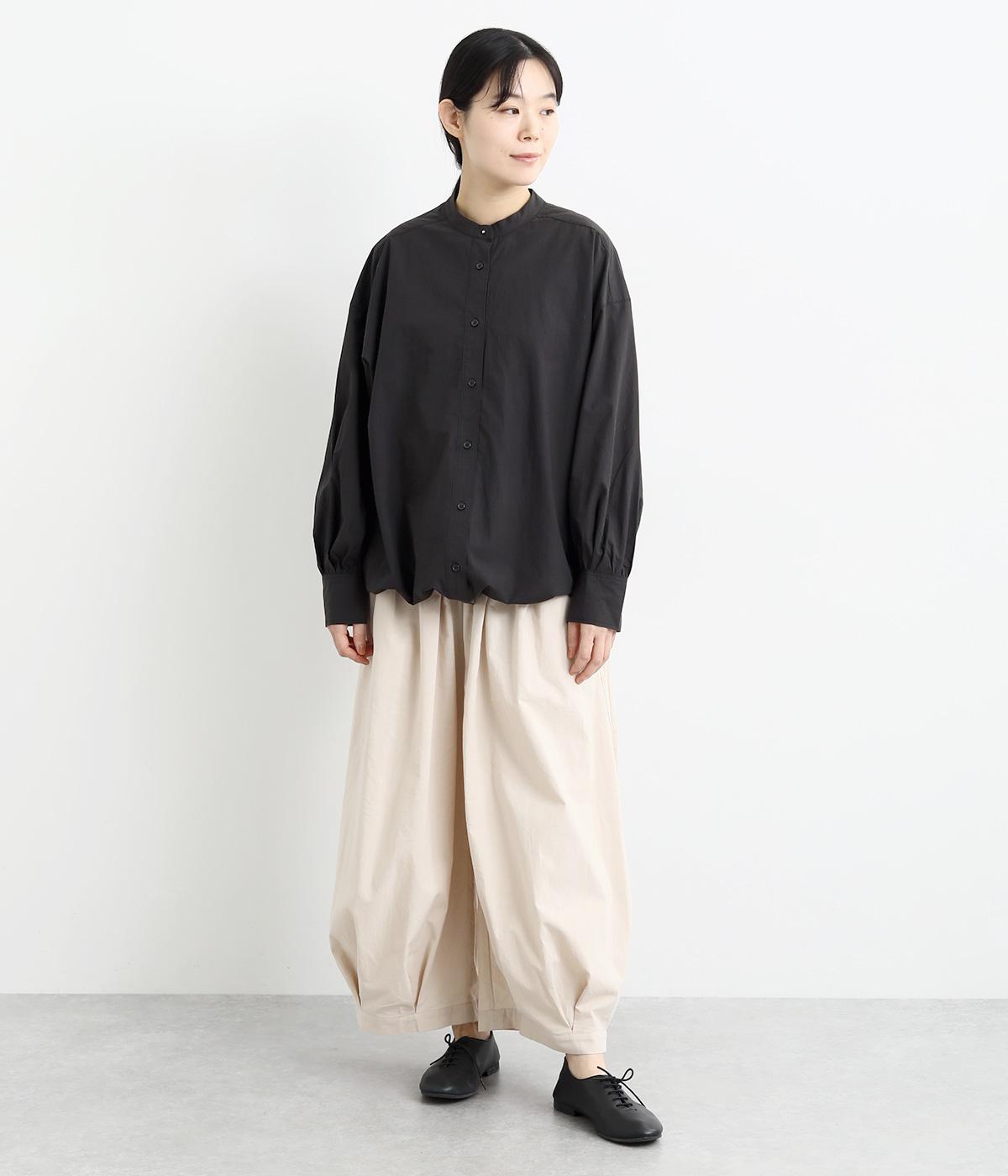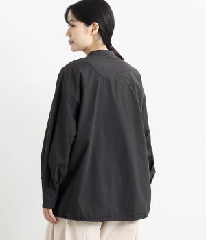 裾にスピンドルの入ったコクーンチュニックです。袖口にタックを入れたボリューム袖や、後ろヨークがクロスしたデザインがポイント。キボシボタンになった第一ボタンが、上品な印象を与えてくれます。