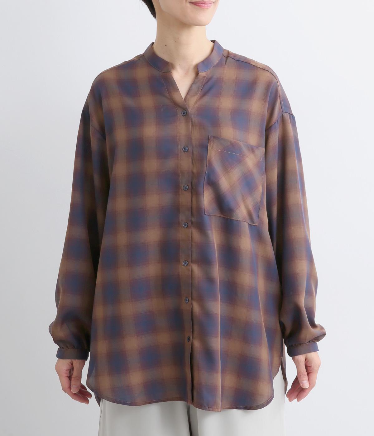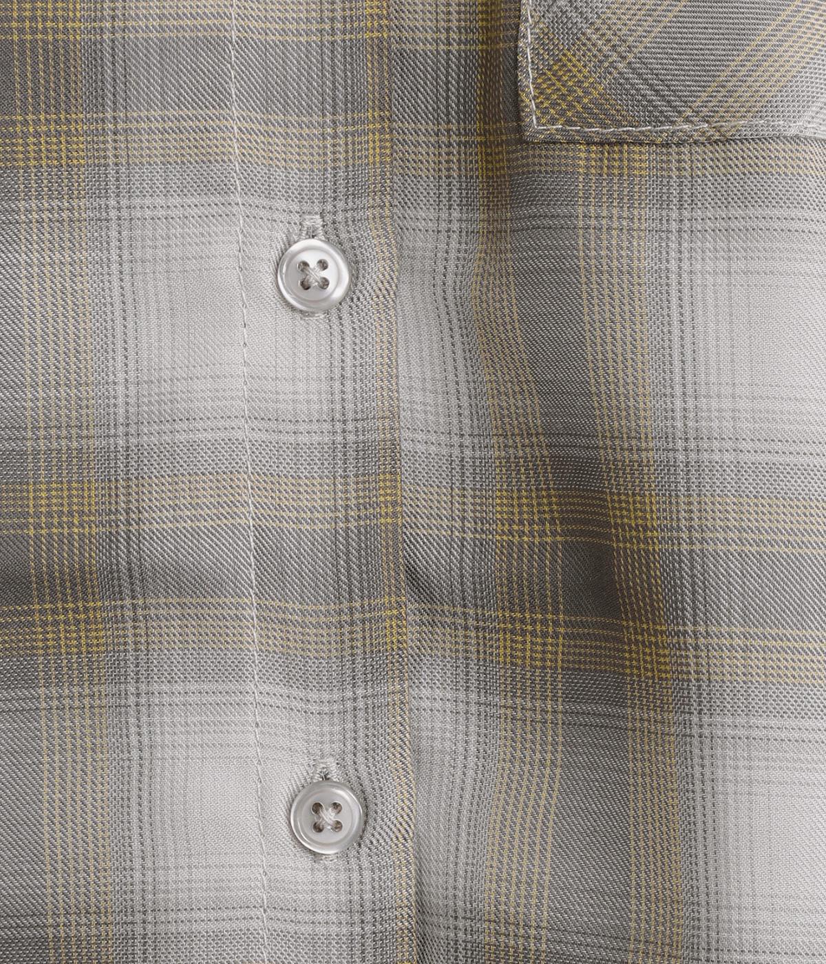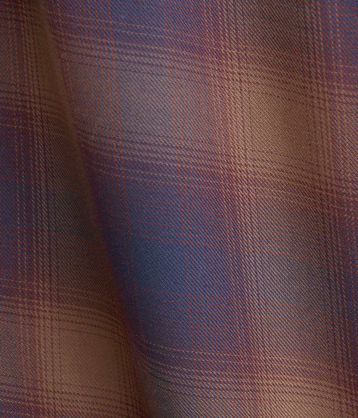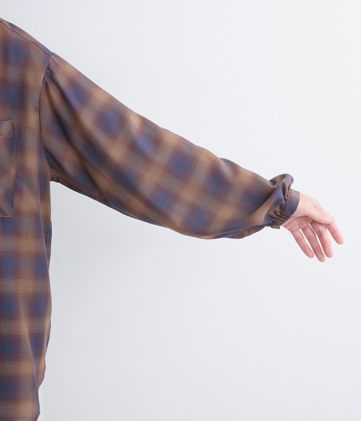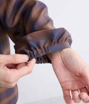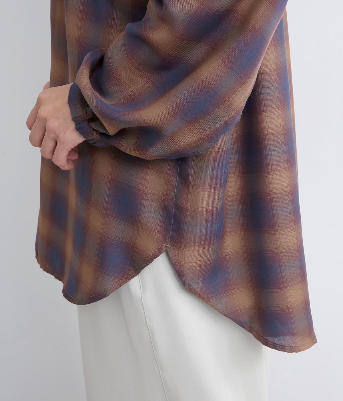 ポリエステルのさらっとしたオンブレーチェック生地です。生地は透け感が気になりにくい薄手生地なので、羽織りものとしても着用可能です。