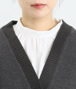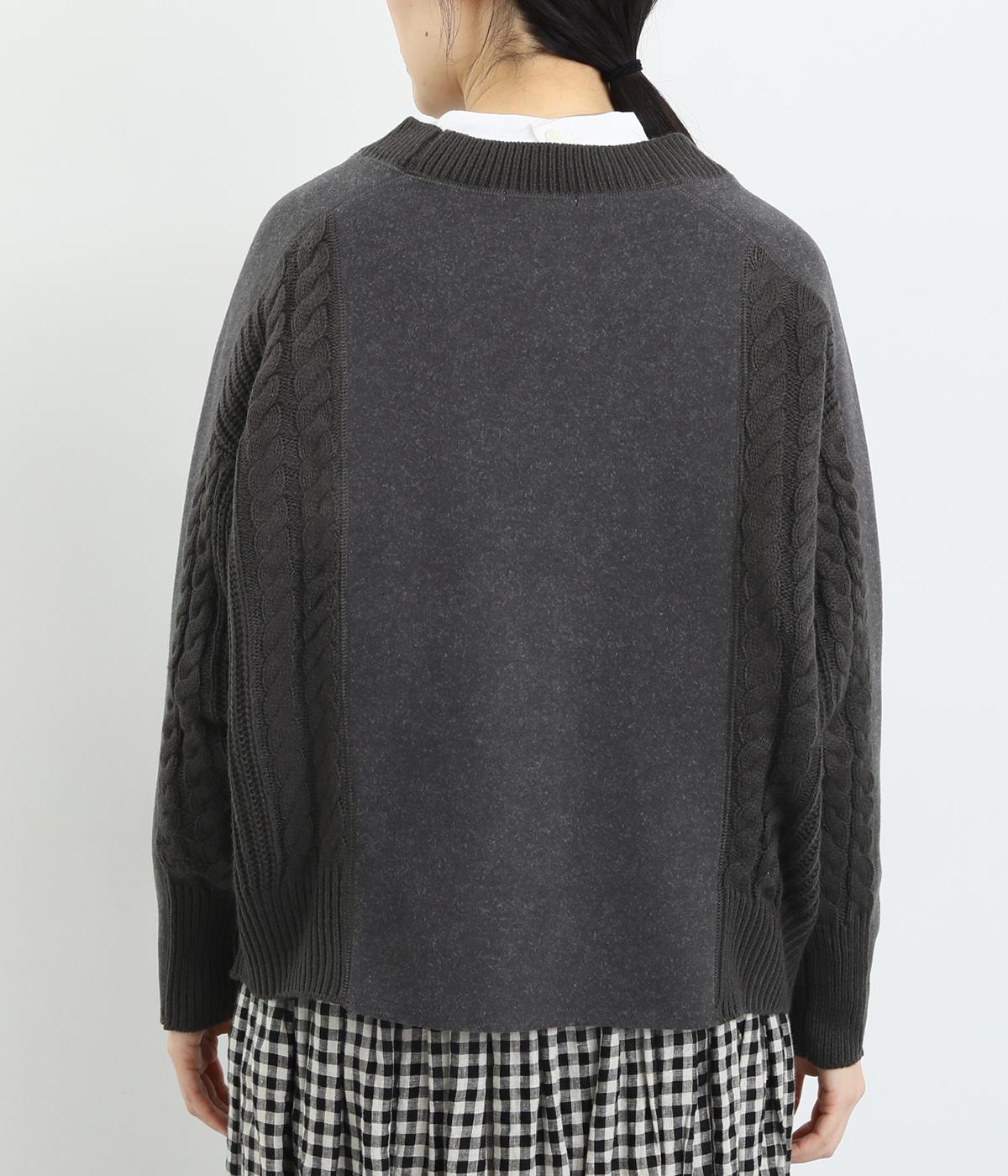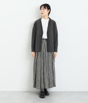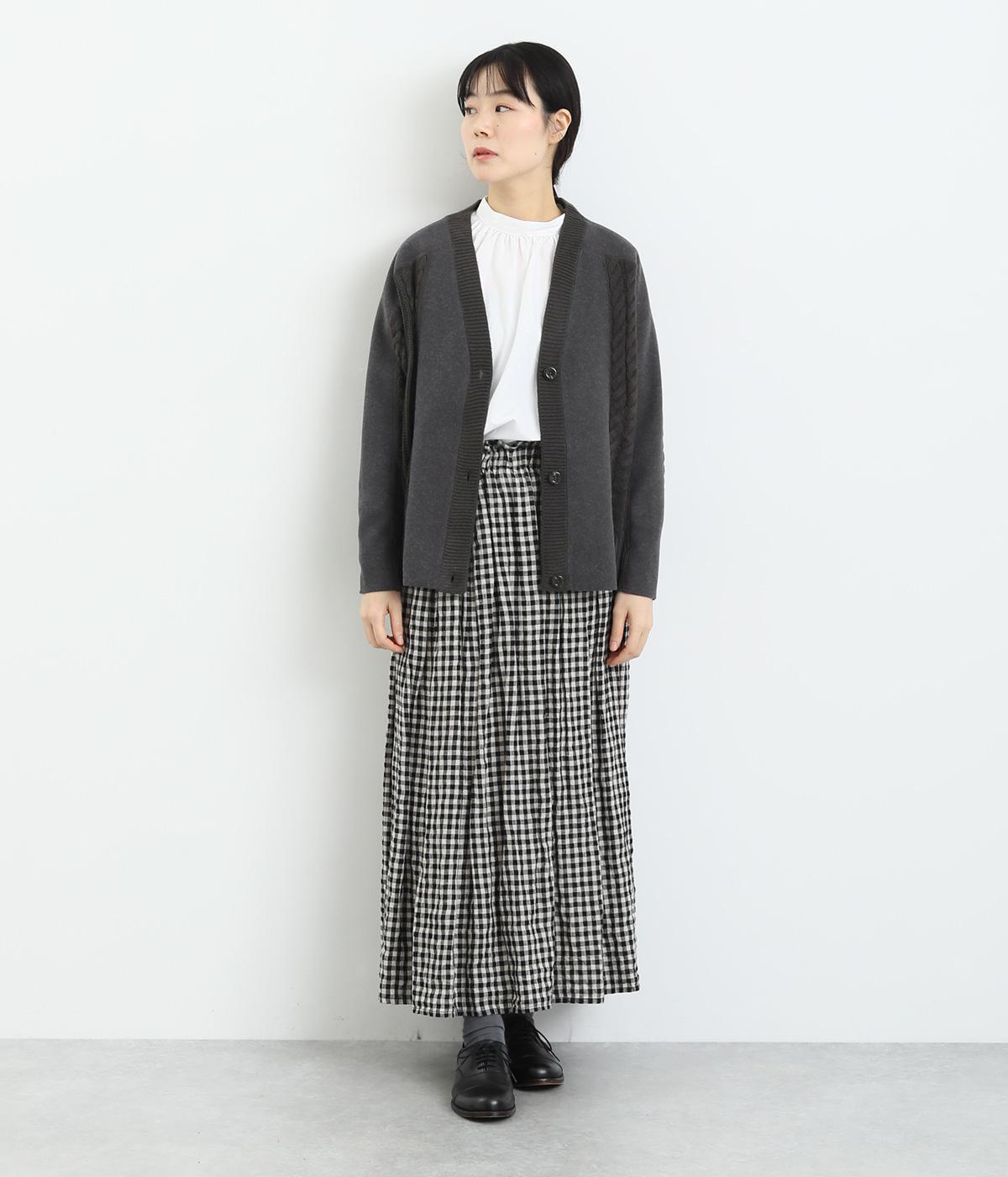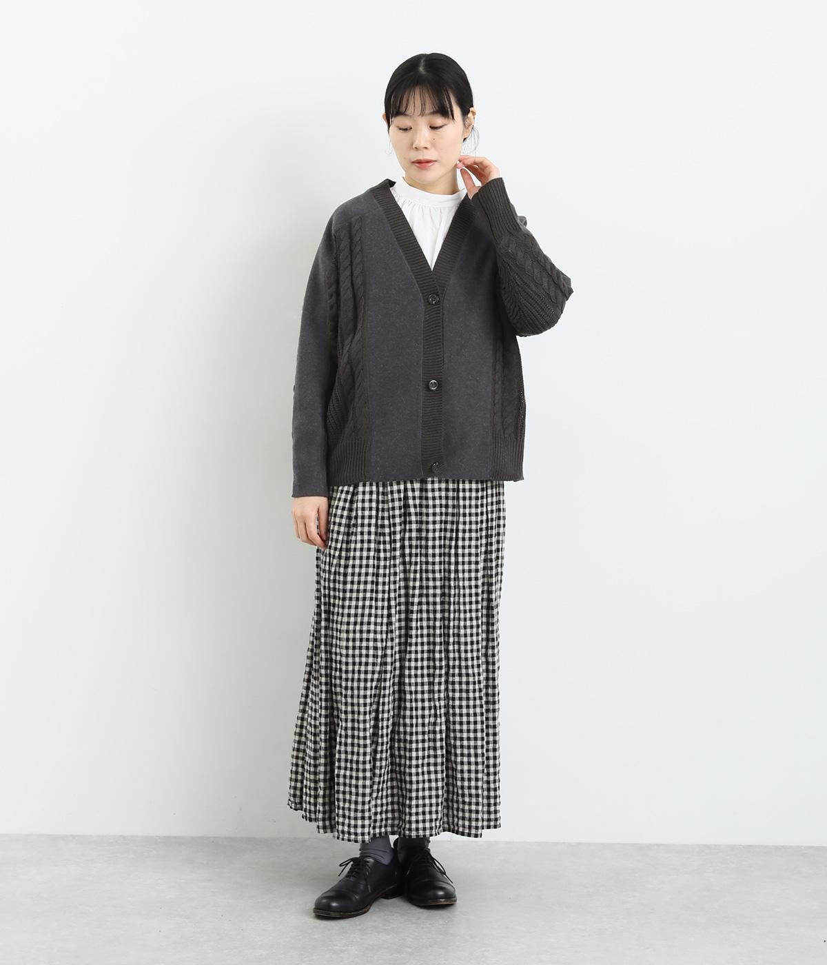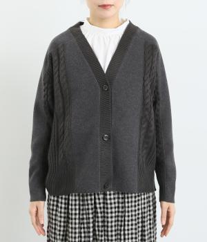 素材違いの切り替えがユニークでありながらも、同じ色みで落ち着いた雰囲気のカーディガン。カジュアルさときちんと感の両方を叶えてくれる一枚です。ウエストラインもカバーし、包まれるような安心感も素敵です。