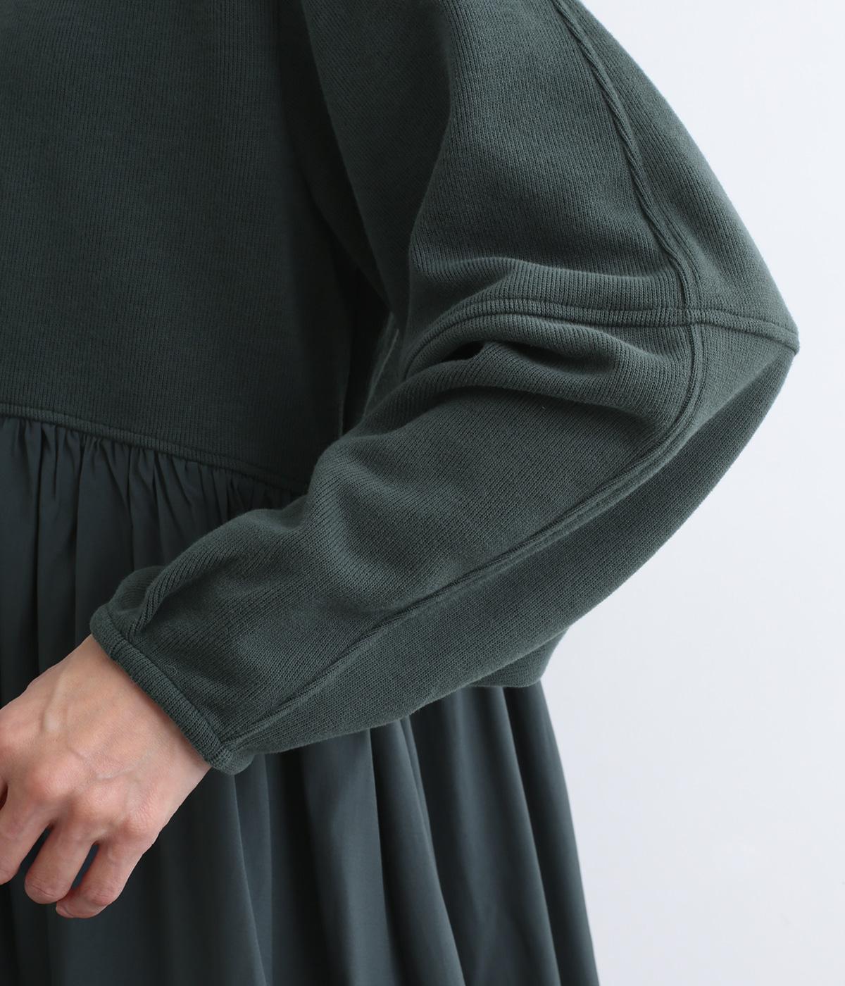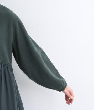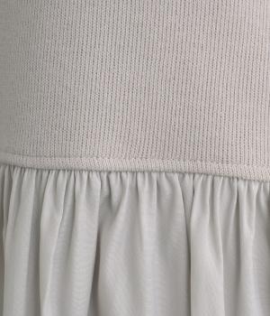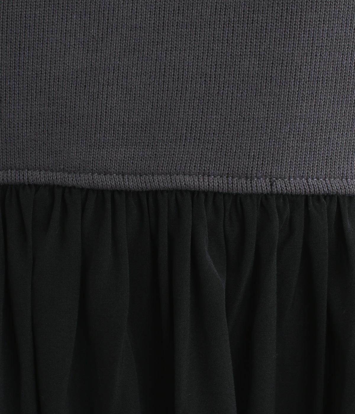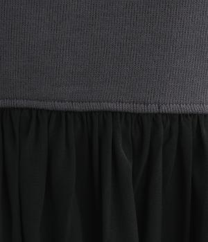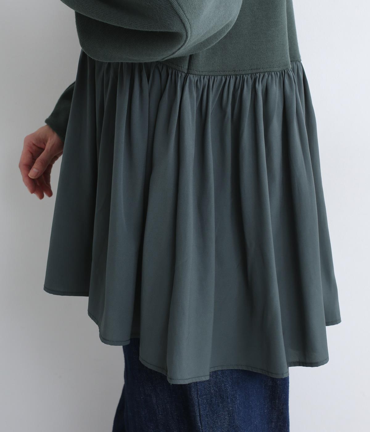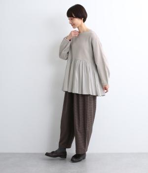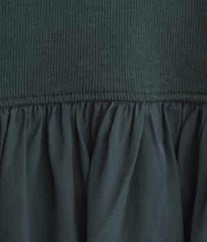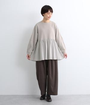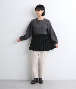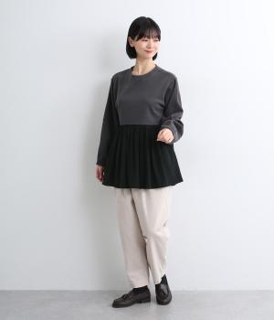 ソフトで伸縮性のある混紡生地をベースに、切り替え下は布帛に切り替えました。あたたかみと光沢感、それぞれ異なる表面感のコントラストが目を惹きます。