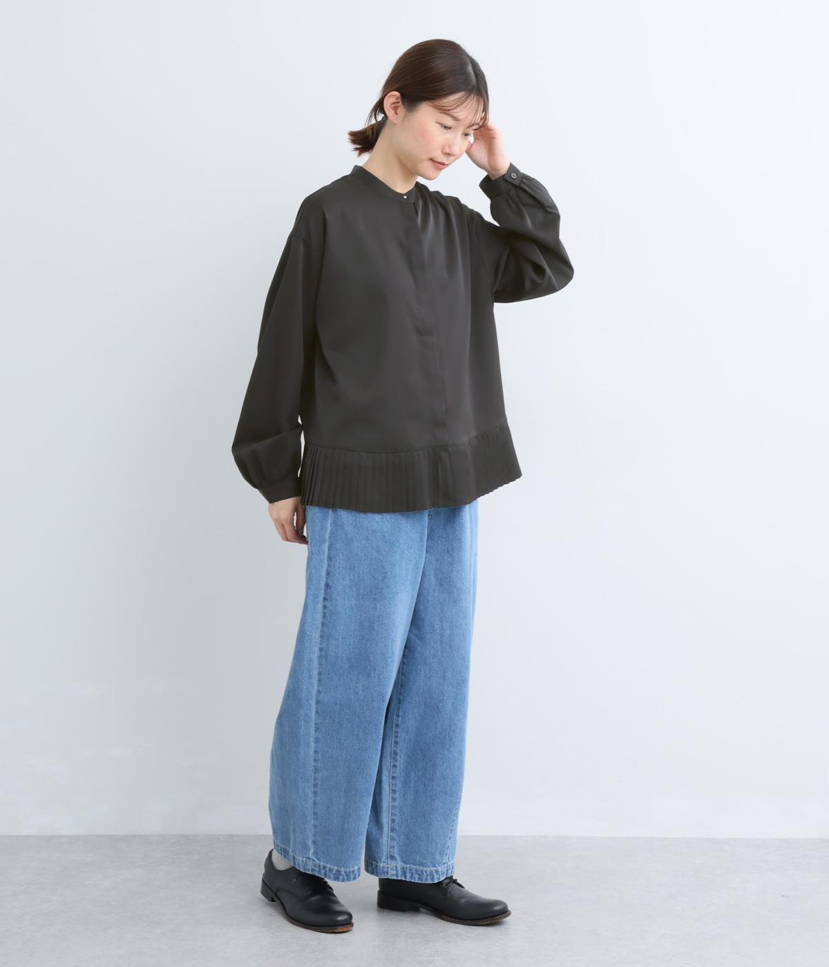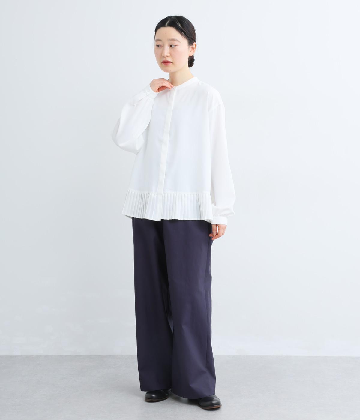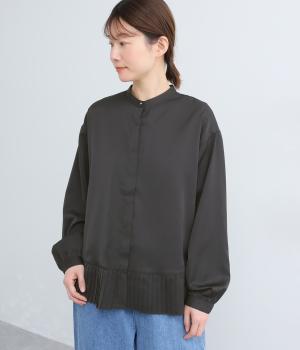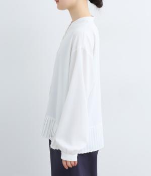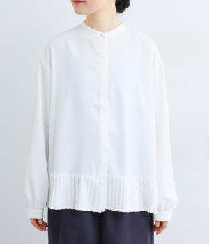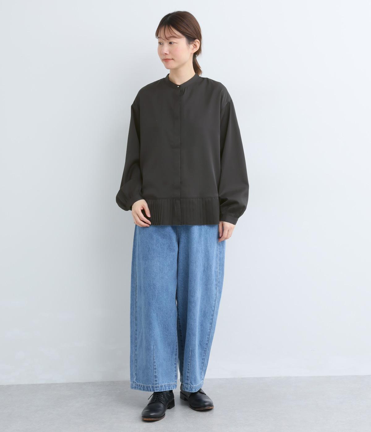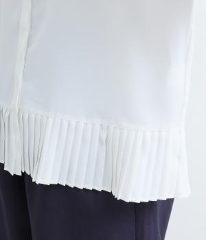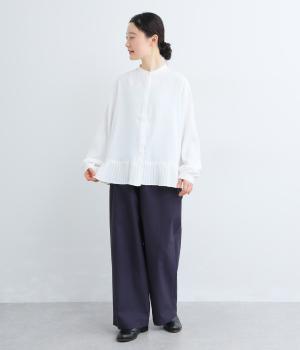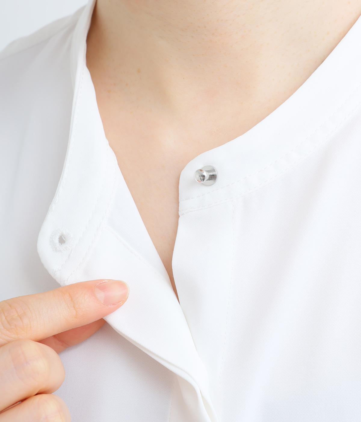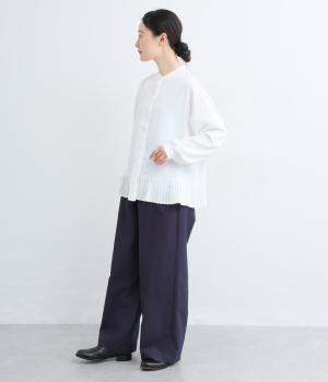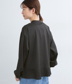 第一ボタンのみシルバーボタンをあしらい、さりげないアクセントになっています。第二ボタン以降は比翼仕立てですっきりした見た目が裾のプリーツの華やかさを引き立てます。きれいめにもカジュアルダウンしても着まわしできる一枚です。
