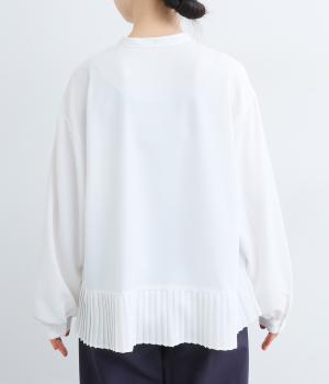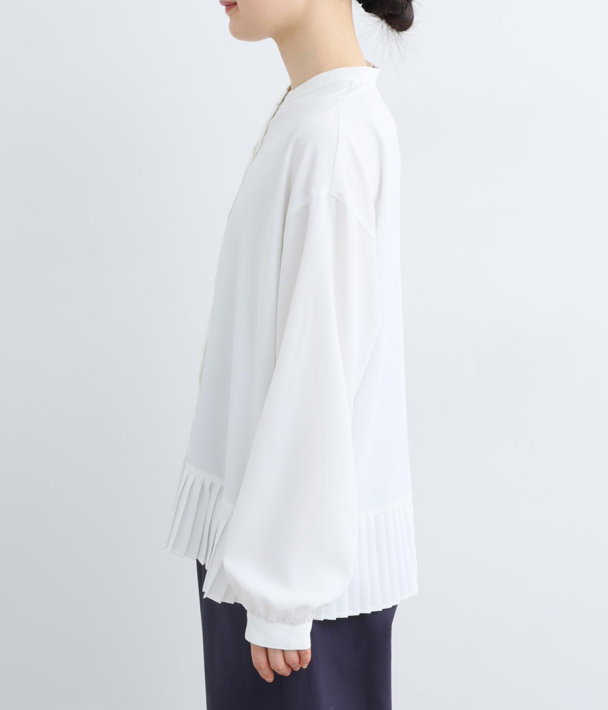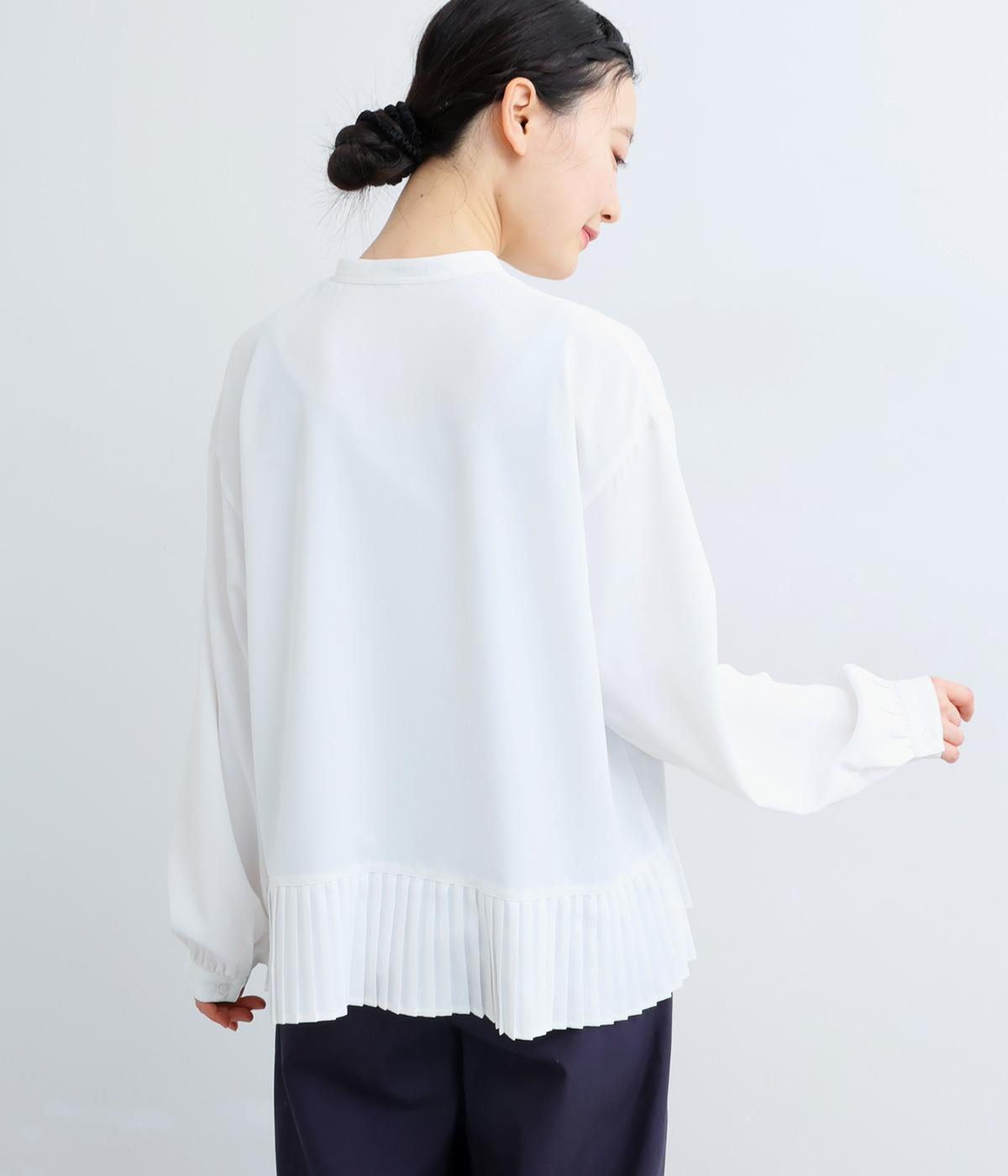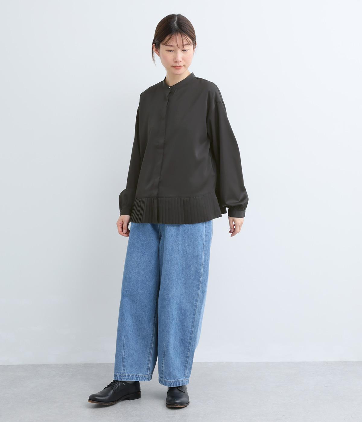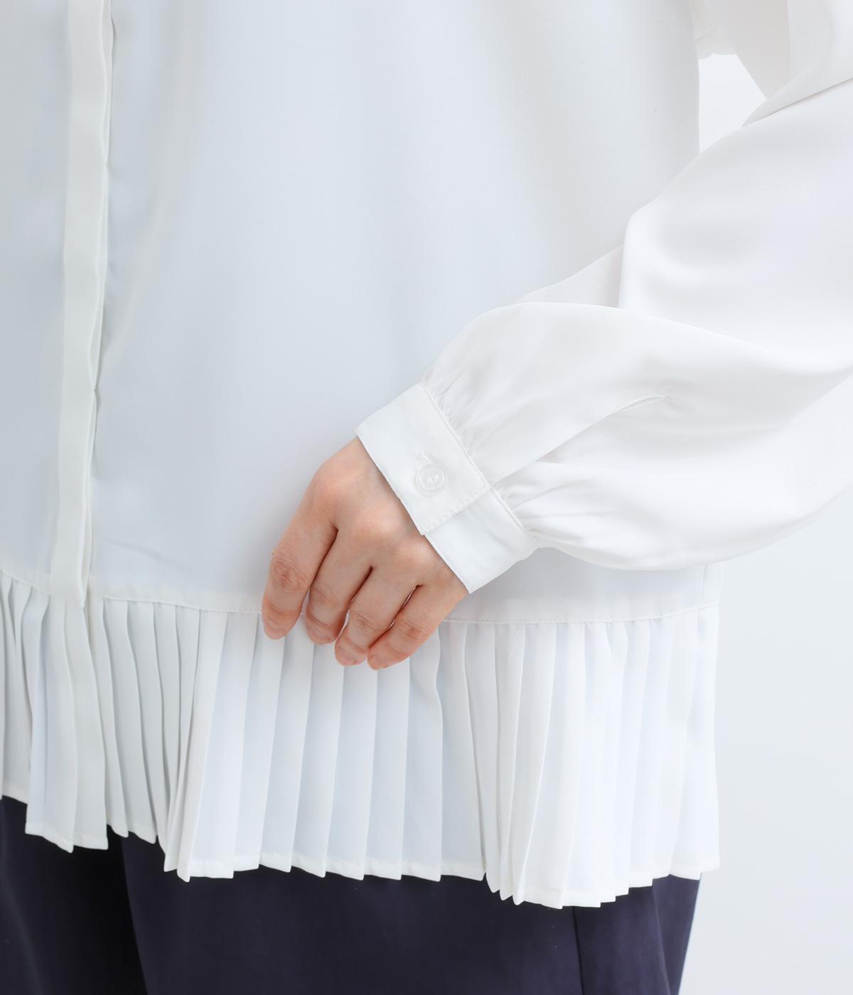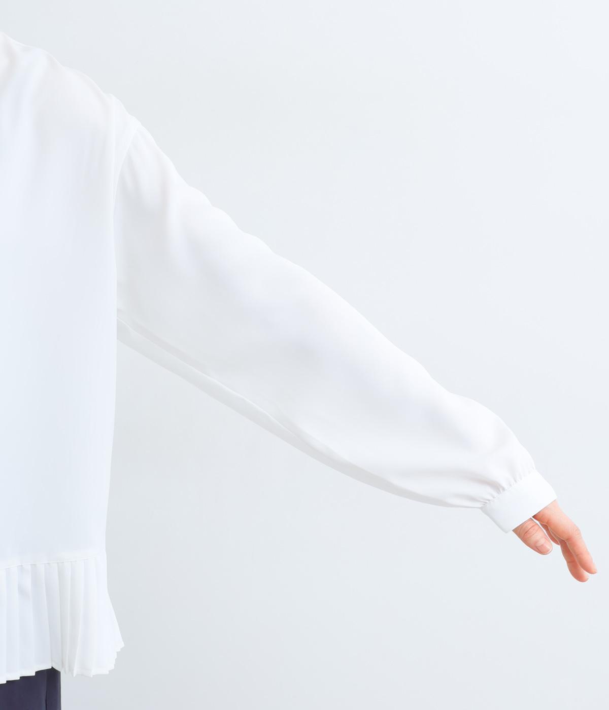 第一ボタンのみシルバーボタンをあしらい、さりげないアクセントになっています。第二ボタン以降は比翼仕立てですっきりした見た目が裾のプリーツの華やかさを引き立てます。きれいめにもカジュアルダウンしても着まわしできる一枚です。