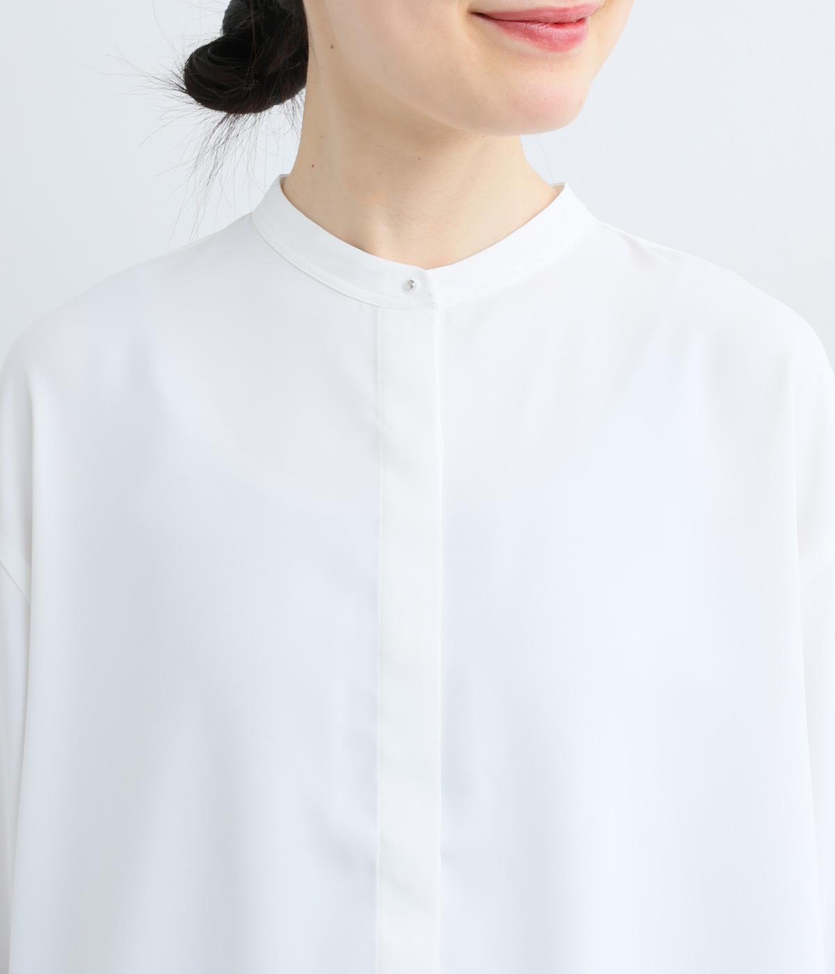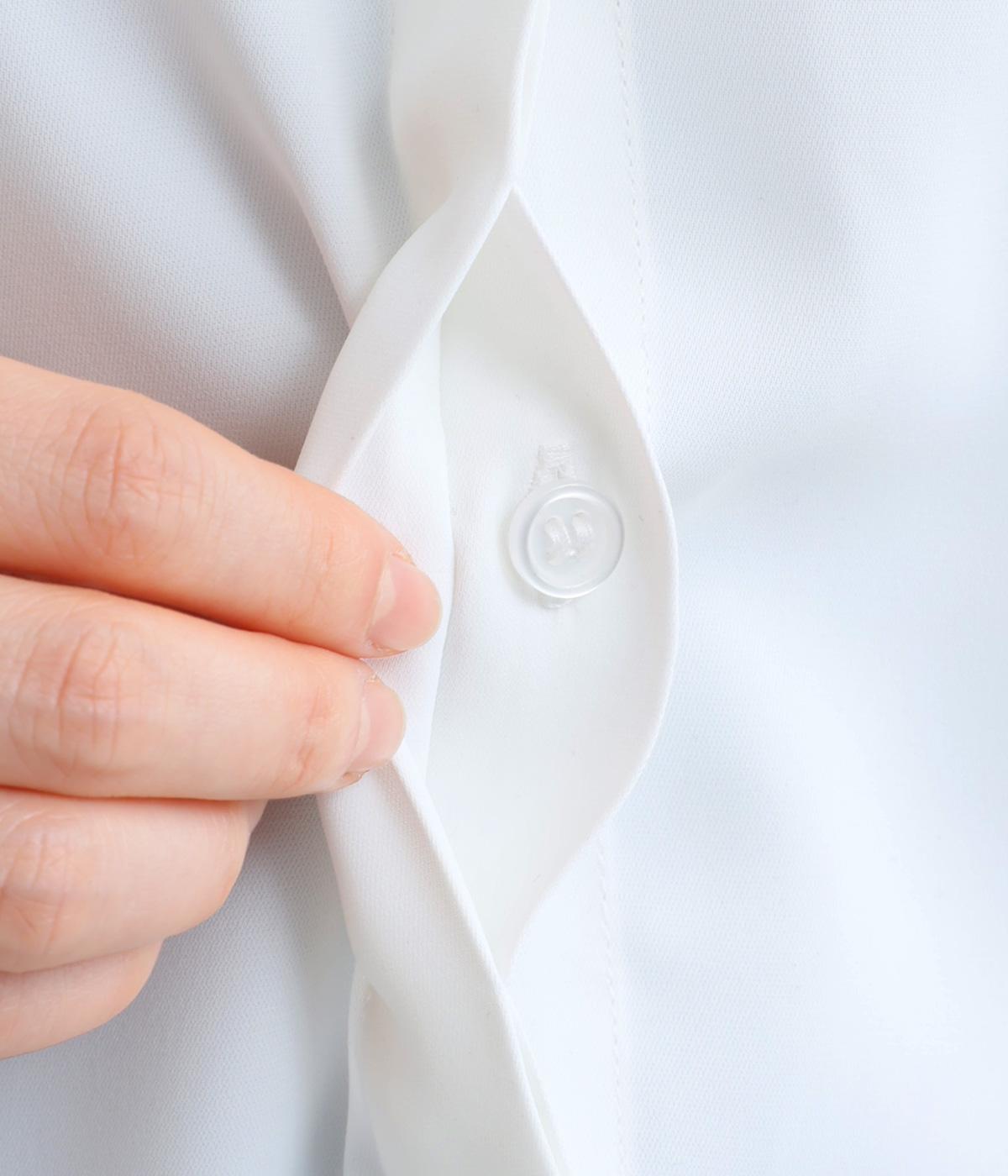なめらかでとろみのあるポリエステル生地を使用しています。落ち感と上品な光沢があり、きちんと見えしながらも、シワになりにくく扱いやすいのがうれしいポイントです。