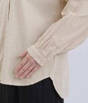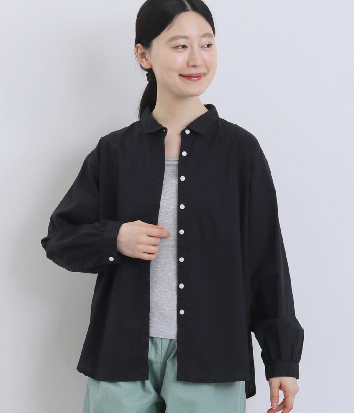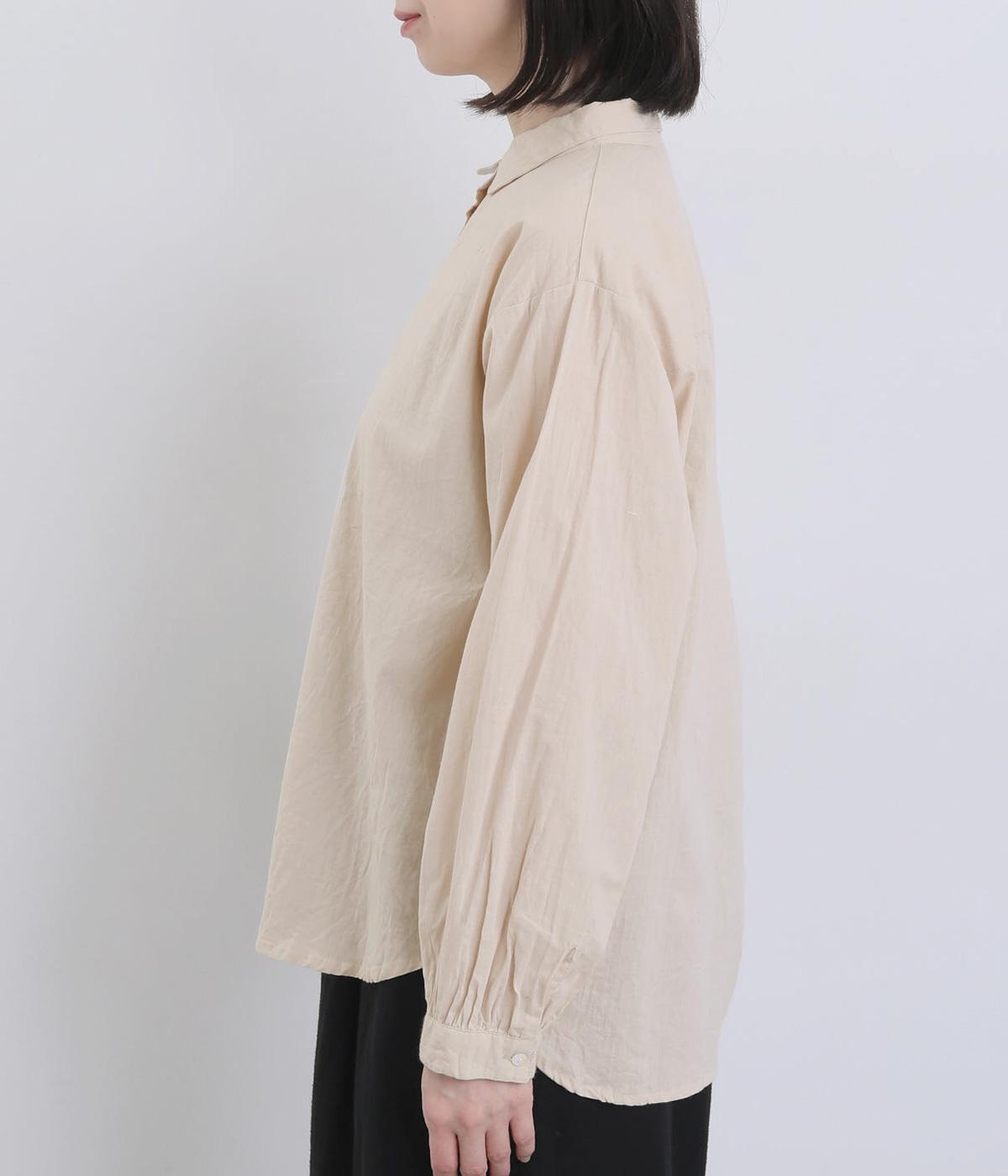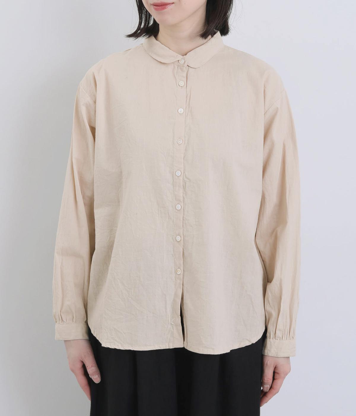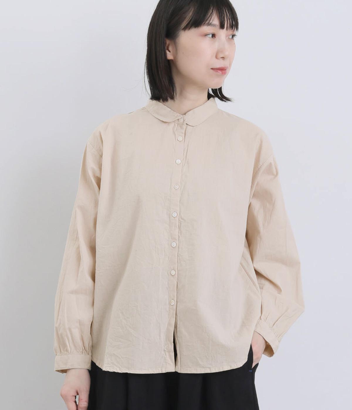 シンプルで着まわしやすいレギュラーシャツを、ほどよくフィットするサイズ感で仕立てました。丸みのある襟元と袖口に寄せたギャザーがやさしい表情を添え、女性らしい印象に。インナーとして重ねるのはもちろん、前をあけて羽織りとしてもたのしめる、着まわしに活躍する一枚です。